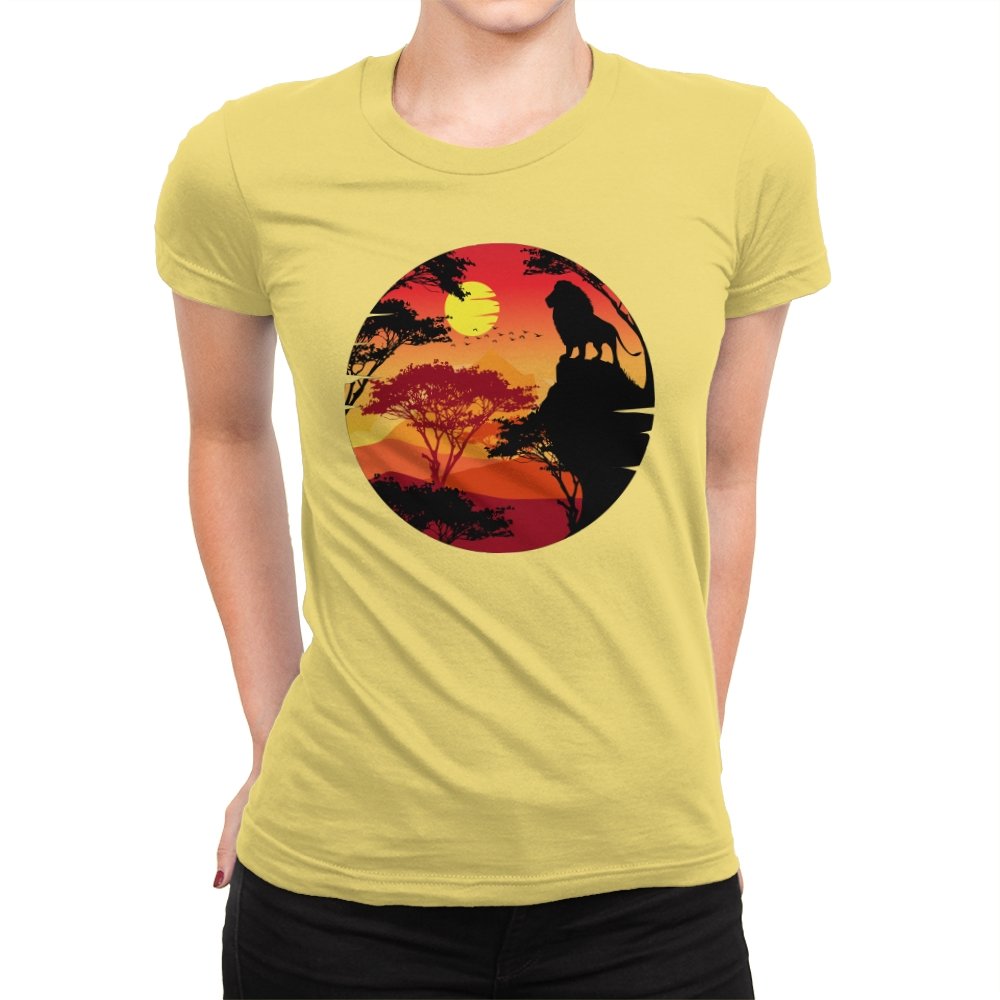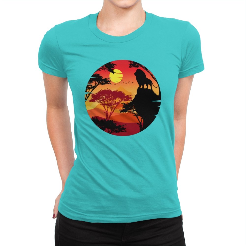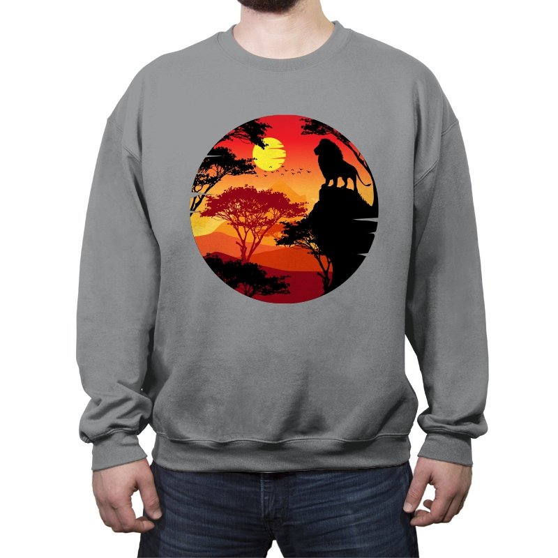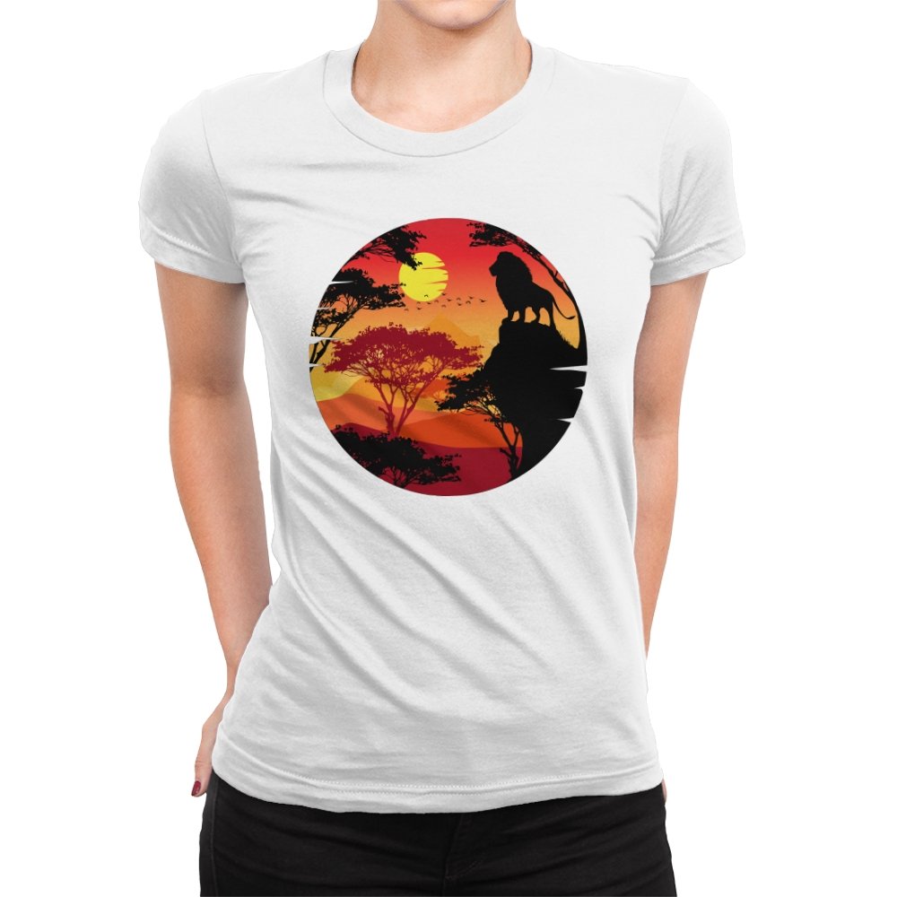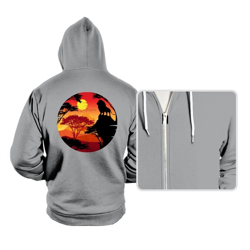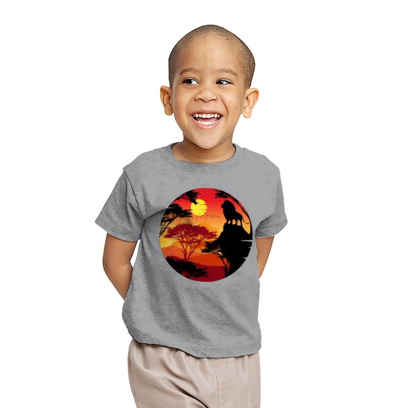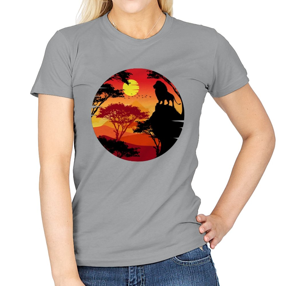 This design frames a quiet moment of power and balance. A lone lion stands in silhouette against a layered sunset, surrounded by acacia trees and distant hills that fade into warm reds and golds. The circular composition feels timeless, like a story paused at its most meaningful beat. Fans who recognize the reference will catch the symbolism without needing it spelled out.