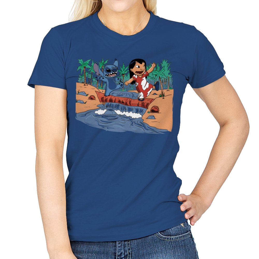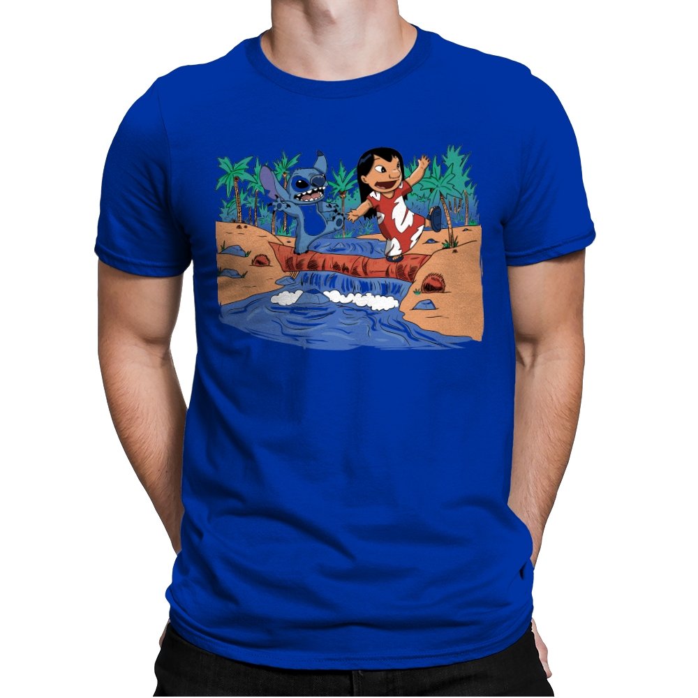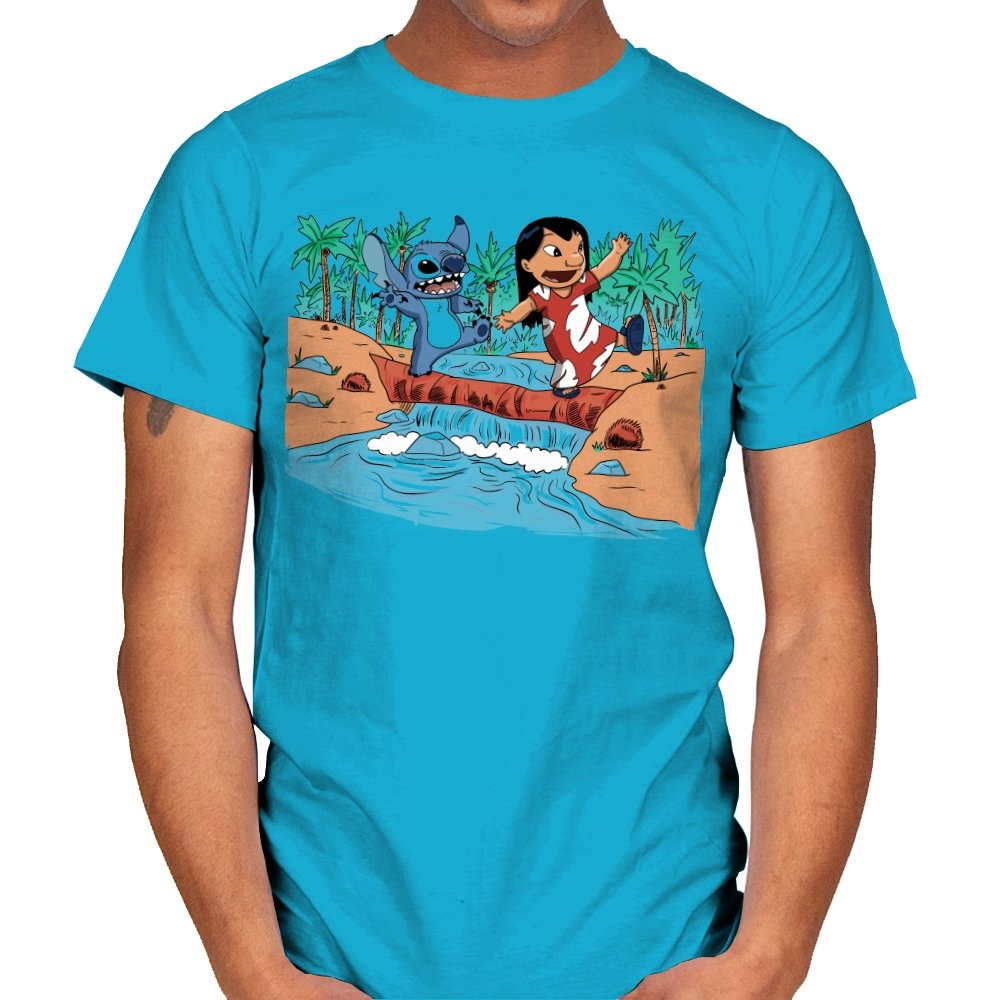 This design captures a quiet island moment that fans instantly recognize, reimagined in a playful, hand-drawn style. Two familiar figures cross a fallen log over water, frozen mid-laugh, surrounded by palm trees and warm colors. It pulls from a story about chosen family, mischief, and loyalty without spelling it out. The scene feels light, emotional, and a little chaotic in the best way.