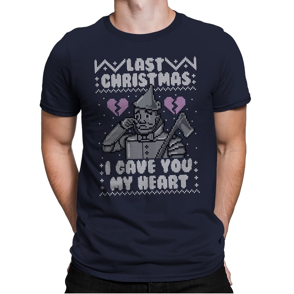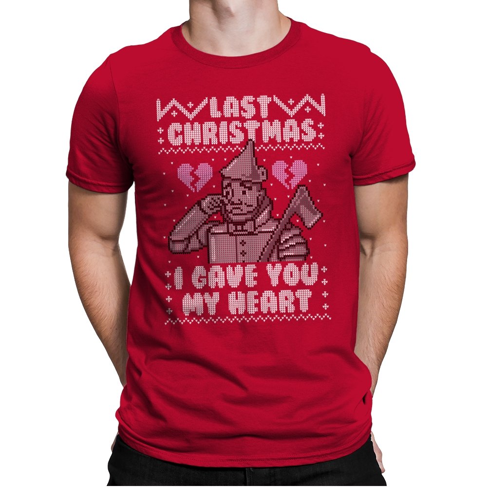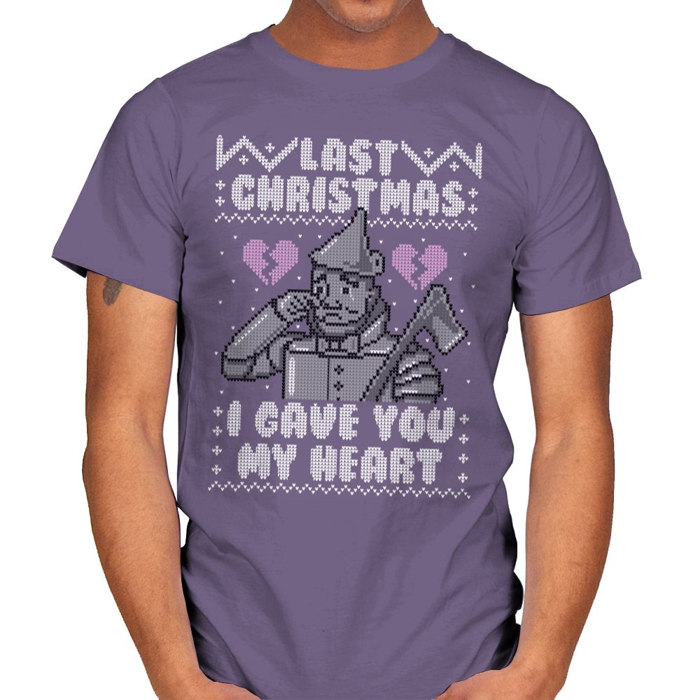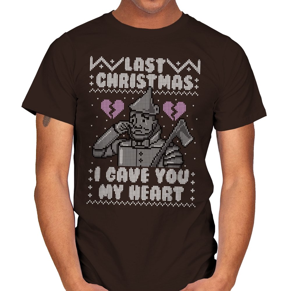This design reimagines a sentimental pop lyric through the eyes of a certain metal woodsman. Rendered in faux knit stitches, he clutches his chest with a mournful frown while broken hearts hover above and snowflakes float around him. The stitched text hints at last year’s heartbreak and the bittersweet gift he offered. The axe at his side keeps the fairy tale roots visible, even as the joke lives in holiday melancholy.