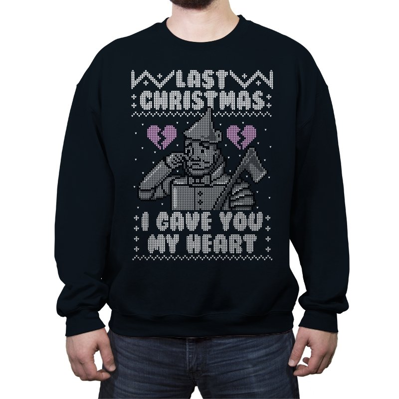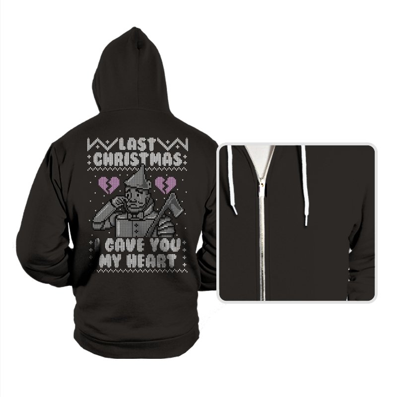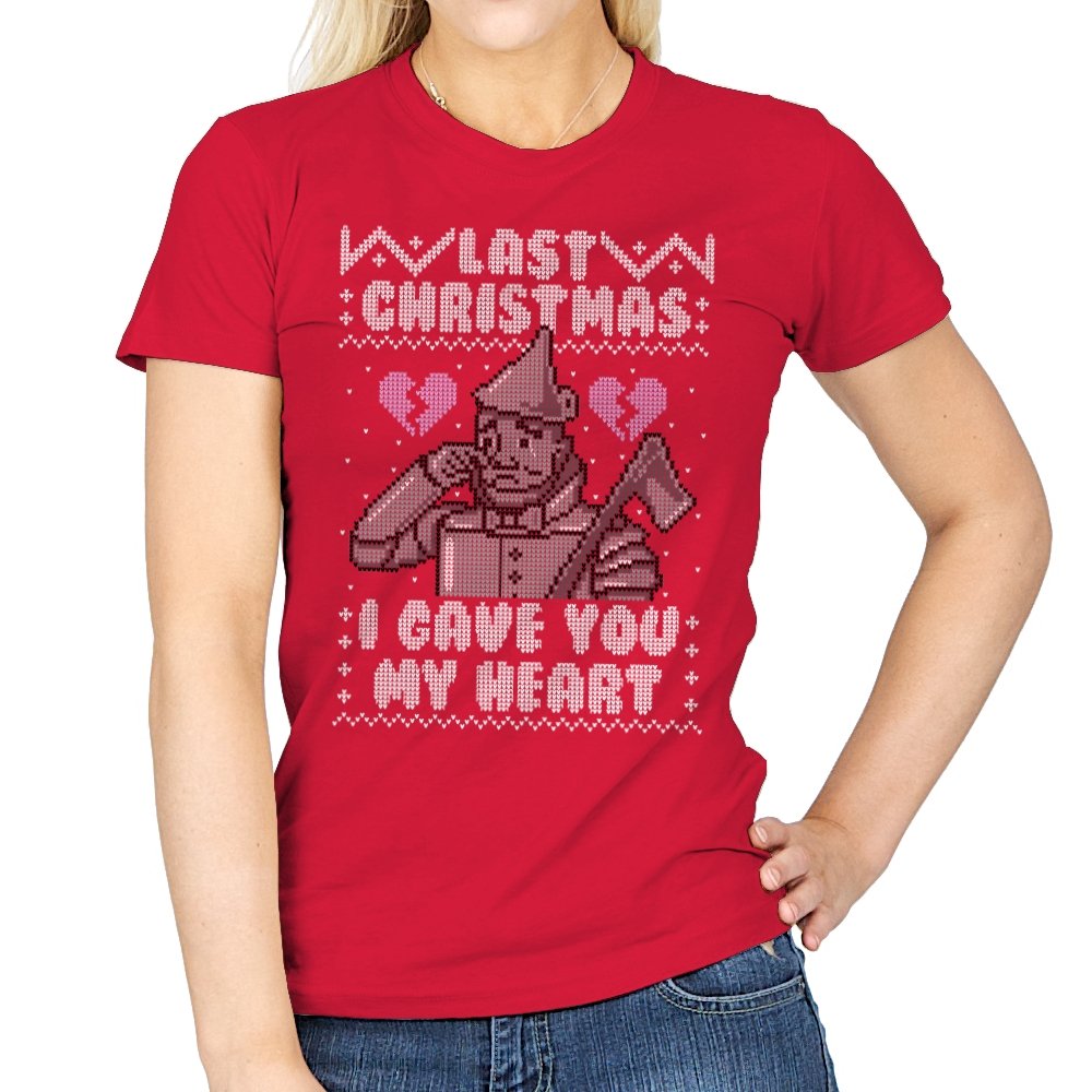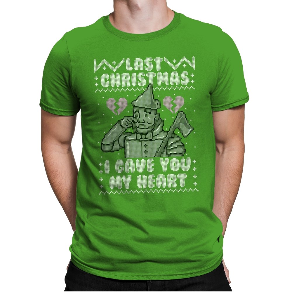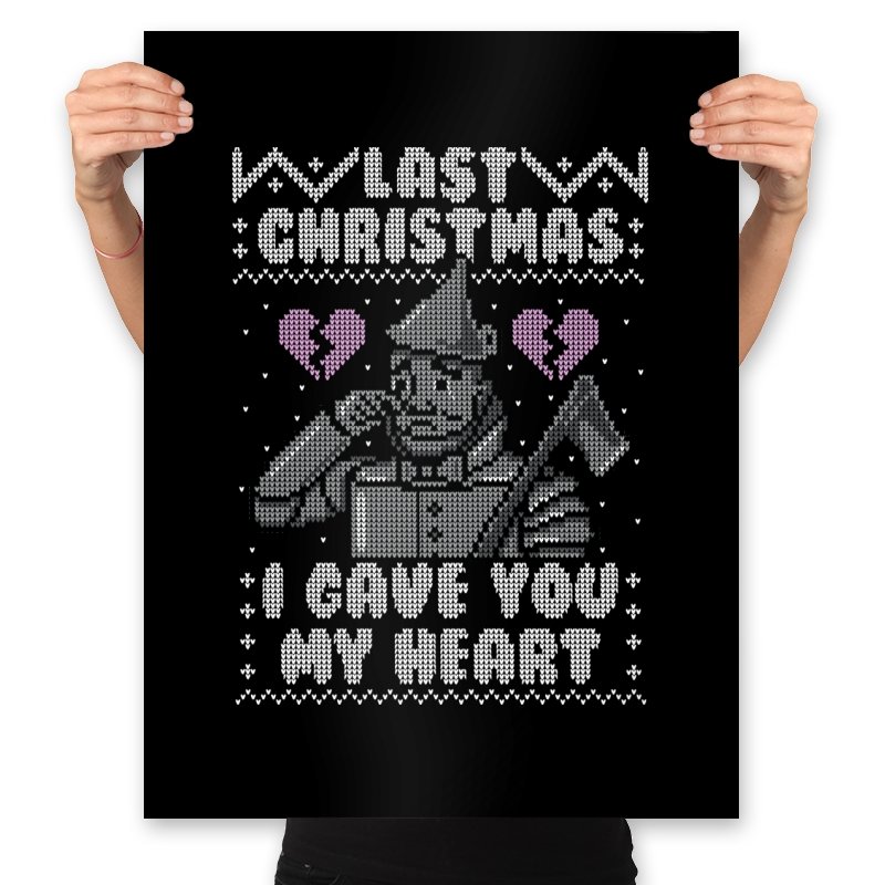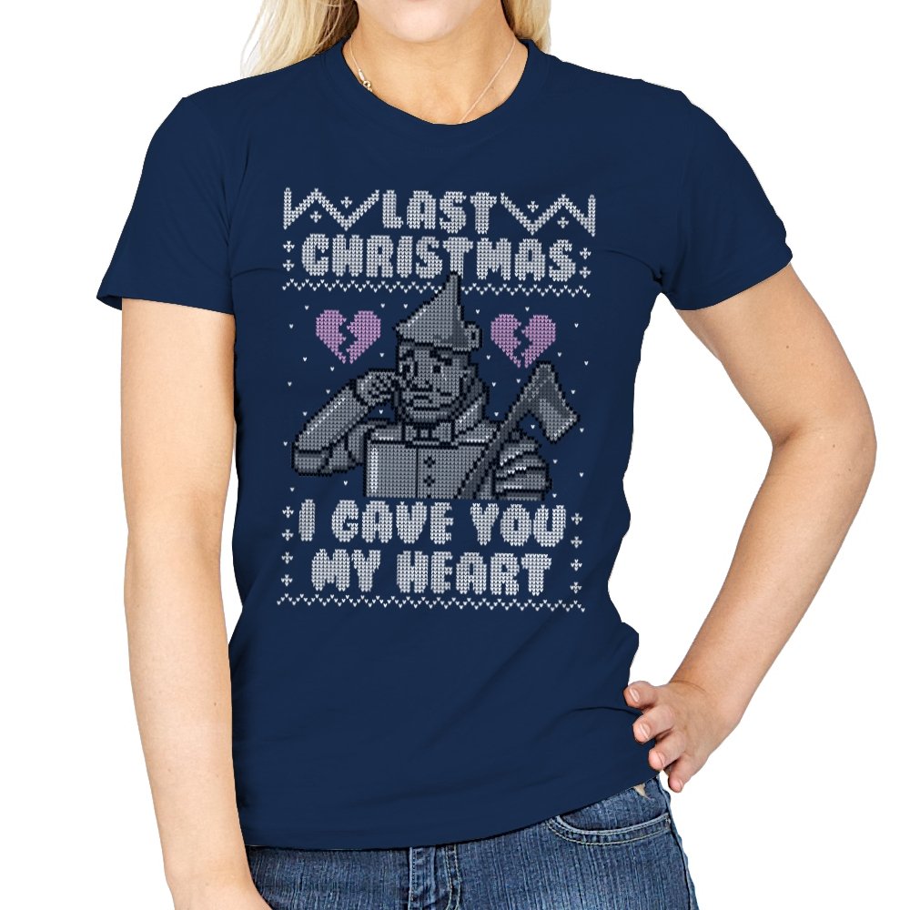 This design reimagines a sentimental pop lyric through the eyes of a certain metal woodsman. Rendered in faux knit stitches, he clutches his chest with a mournful frown while broken hearts hover above and snowflakes float around him. The stitched text hints at last year’s heartbreak and the bittersweet gift he offered. The axe at his side keeps the fairy tale roots visible, even as the joke lives in holiday melancholy.