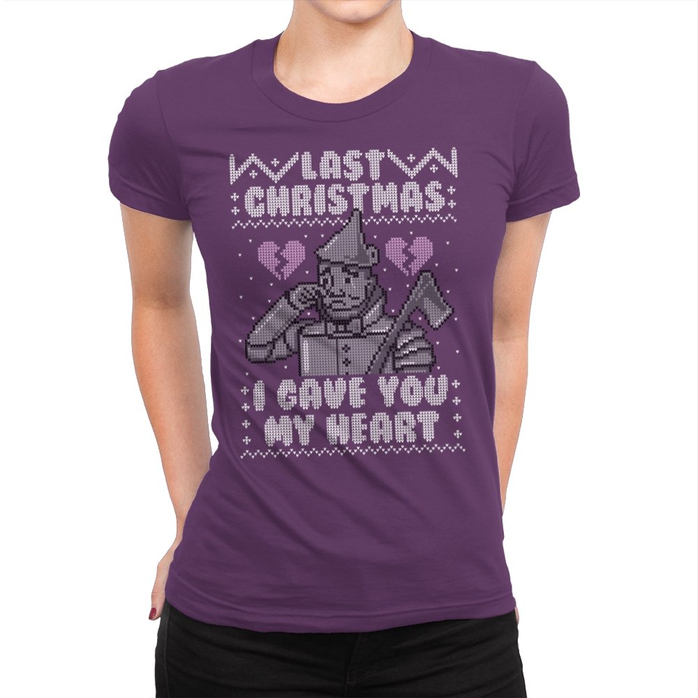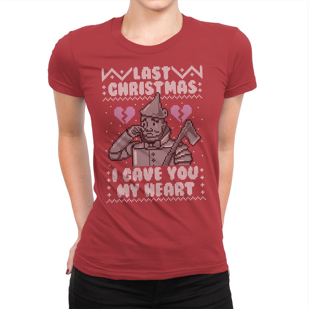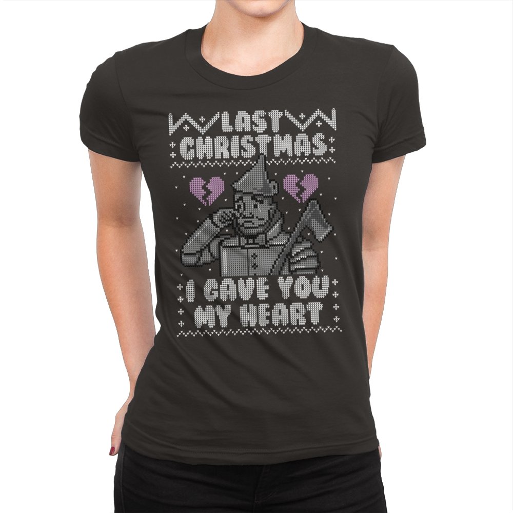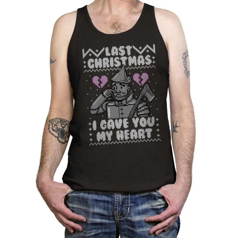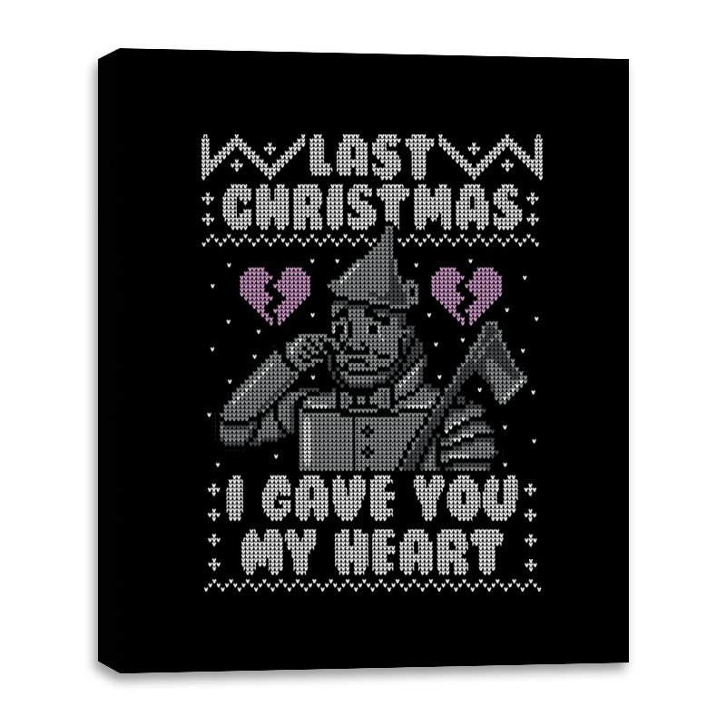 This design reimagines a sentimental pop lyric through the eyes of a certain metal woodsman. Rendered in faux knit stitches, he clutches his chest with a mournful frown while broken hearts hover above and snowflakes float around him. The stitched text hints at last year’s heartbreak and the bittersweet gift he offered. The axe at his side keeps the fairy tale roots visible, even as the joke lives in holiday melancholy.