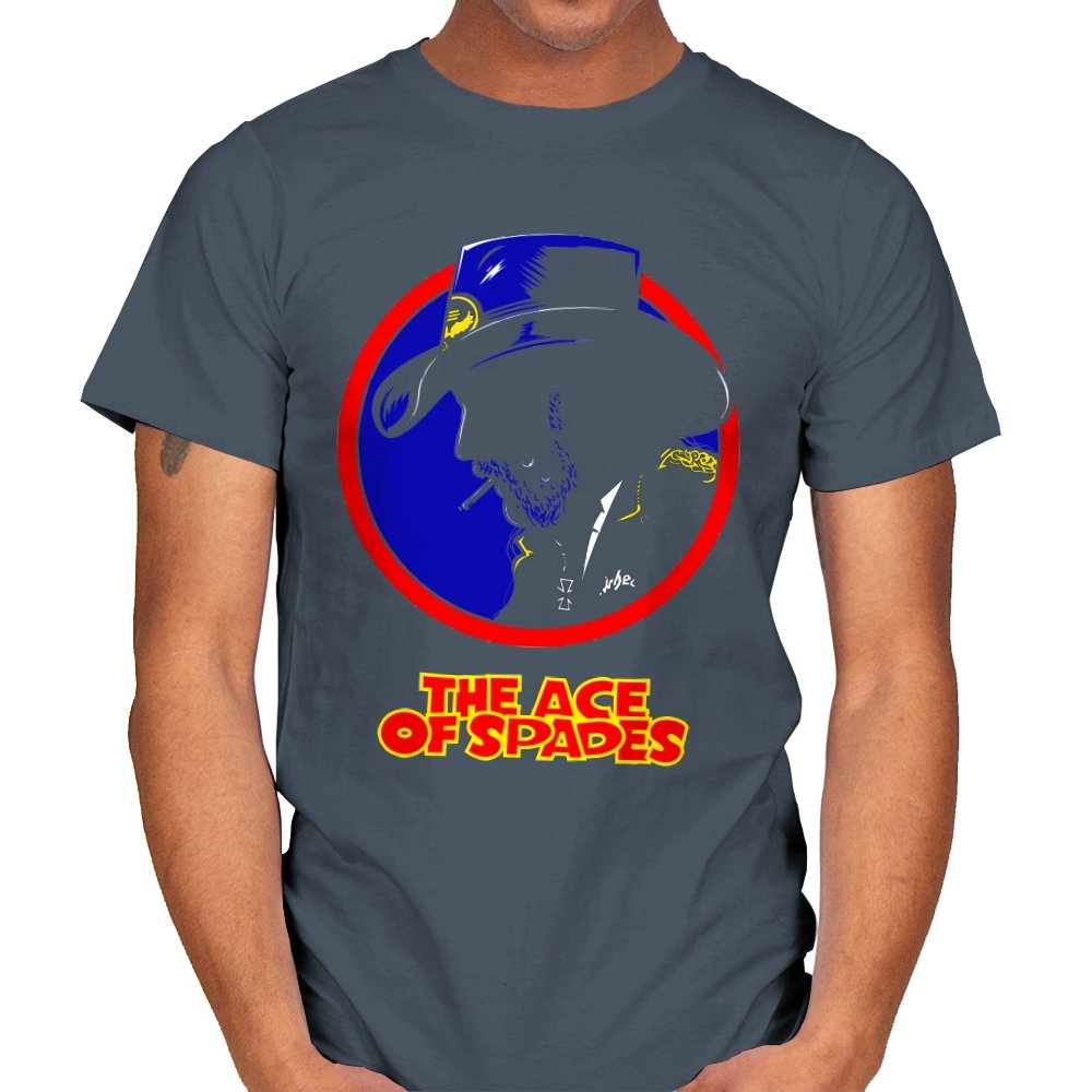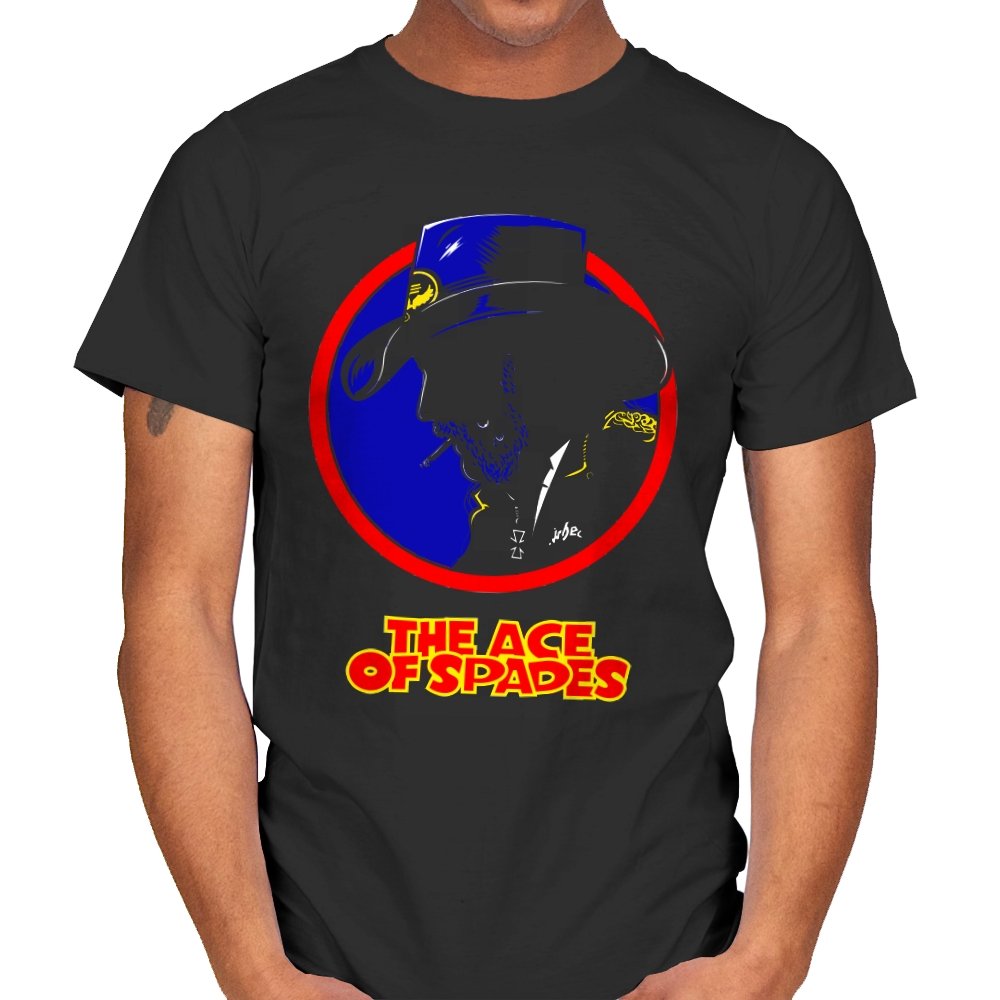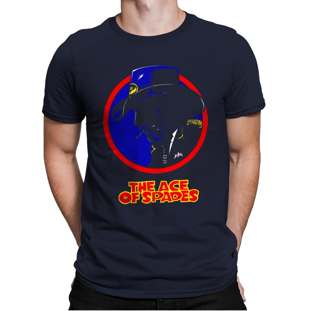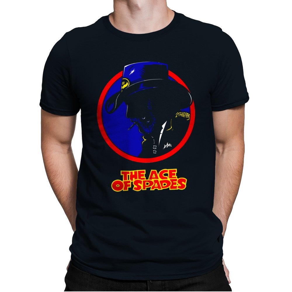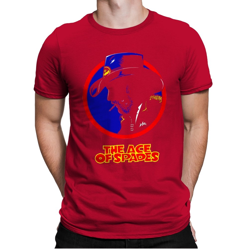 This striking design features a silhouette of a figure, inspired by a rock legend, set against a bold red and blue circle. The figure’s iconic cowboy hat and cigarette give it a classic, cool edge, while the words “THE ACE OF SPADES” pay homage to a timeless, powerful song. The sharp contrast and minimalistic styling make this piece both nostalgic and modern, perfect for fans of rock culture and bold, artistic design.