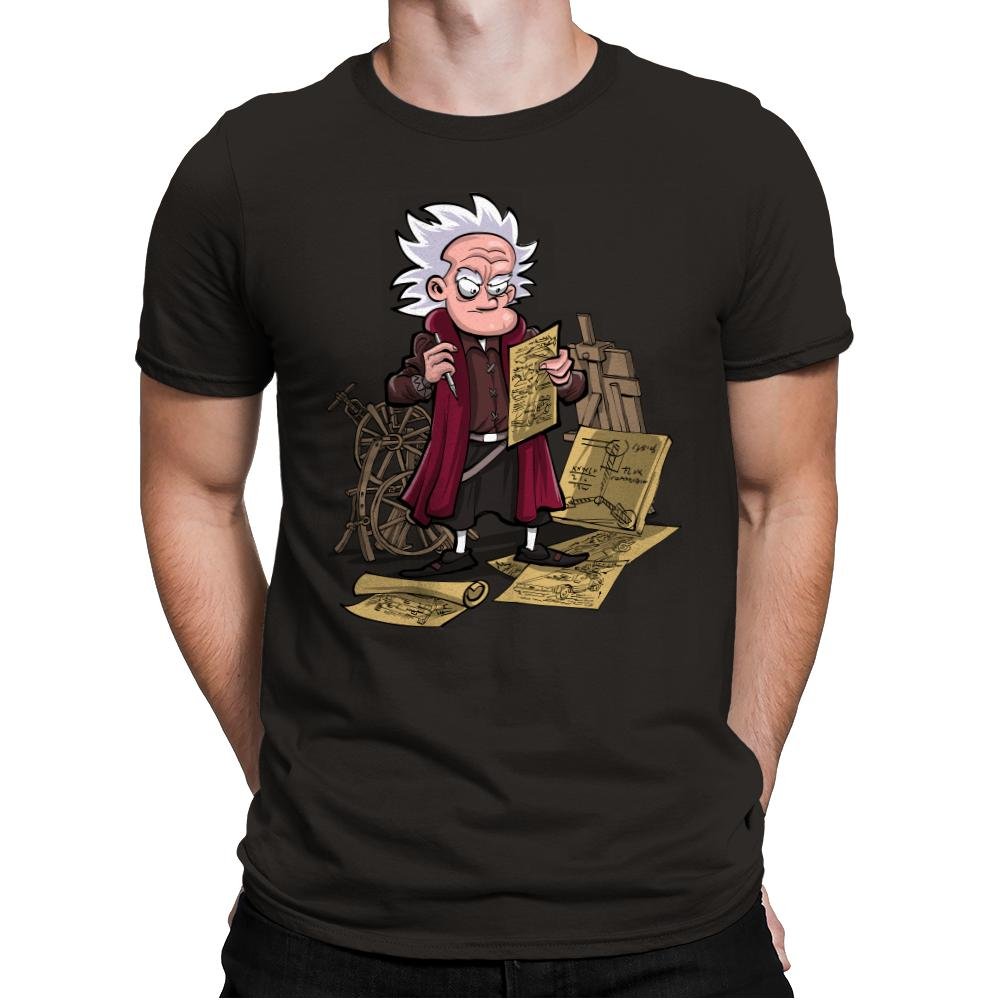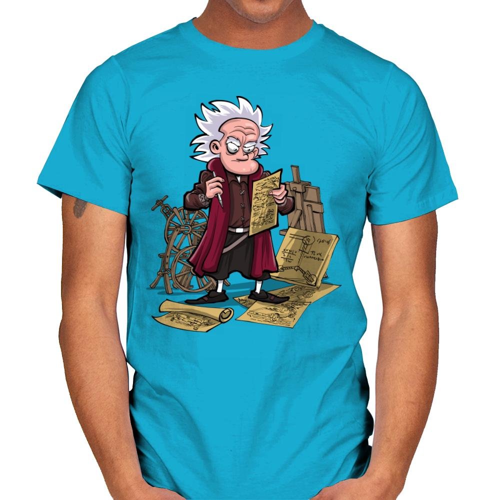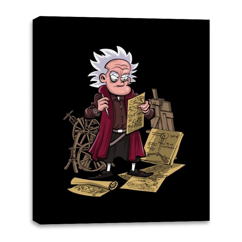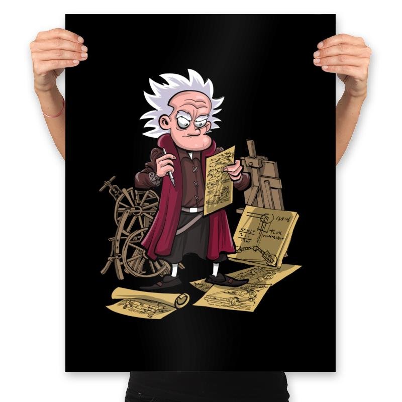 This design imagines a certain wild-haired inventor dropped into the Renaissance with parchment instead of plutonium. He studies sketches of machines that look suspiciously like time rigs and flying contraptions, surrounded by wooden prototypes that echo both engineering and eccentricity. The mashup works because both figures share that chaotic genius energy that makes impossible ideas feel practical. Fans will immediately read the nods to science fiction and classical art without needing anything explained.