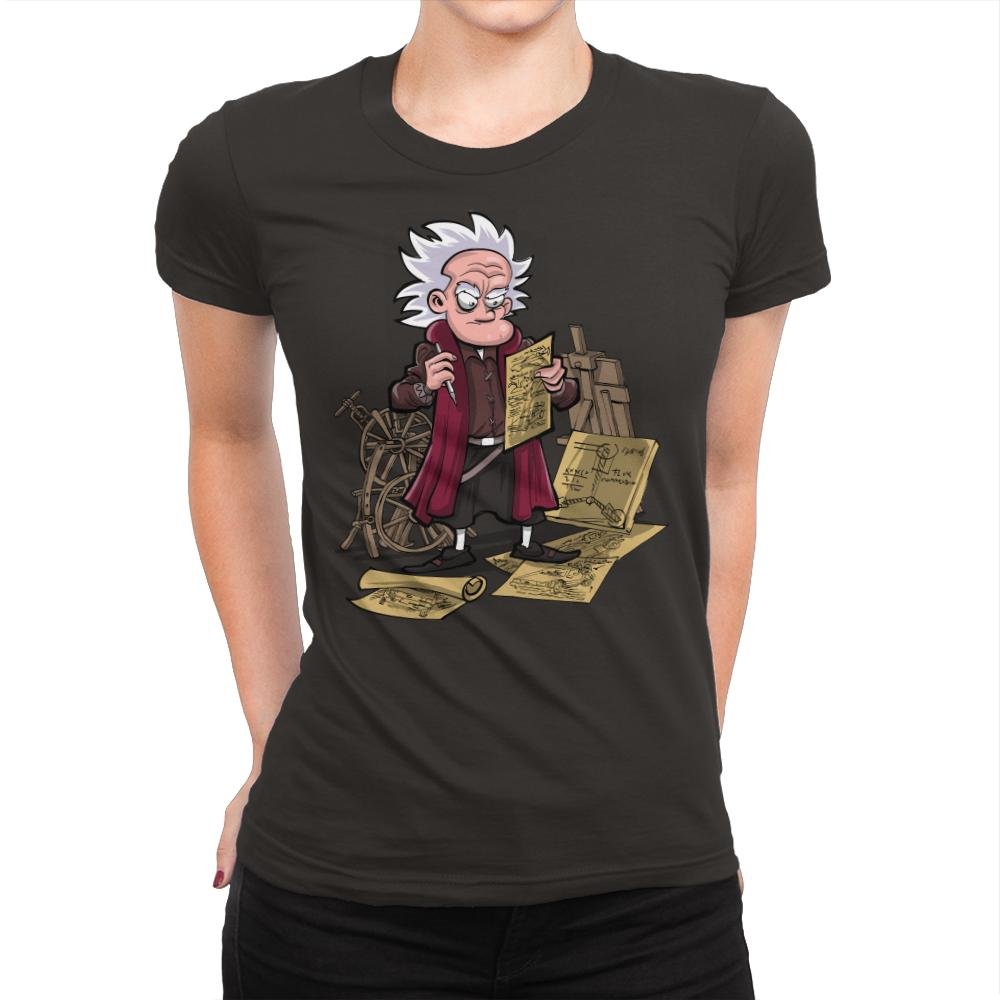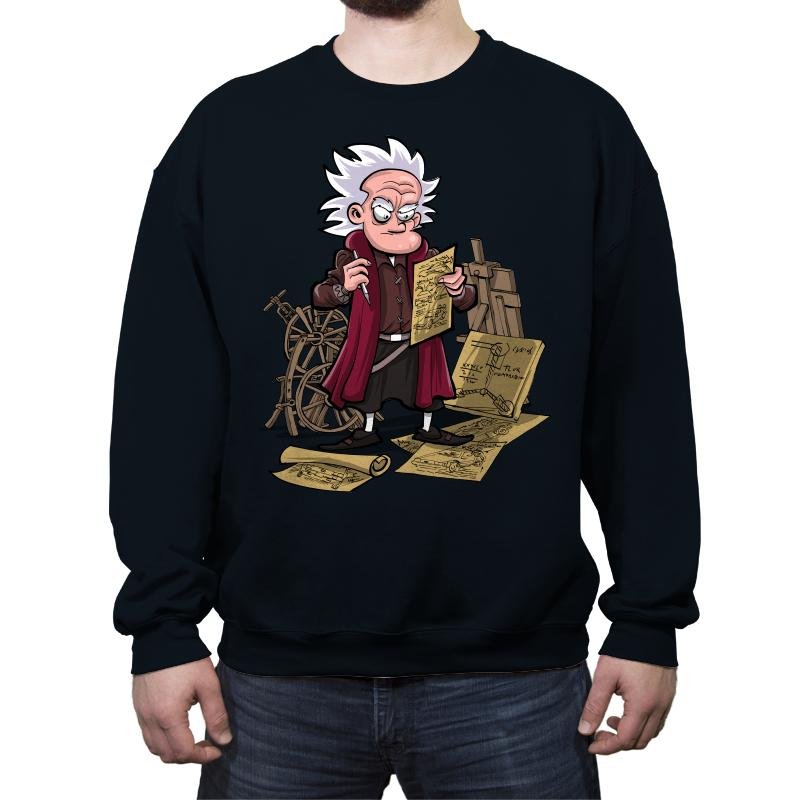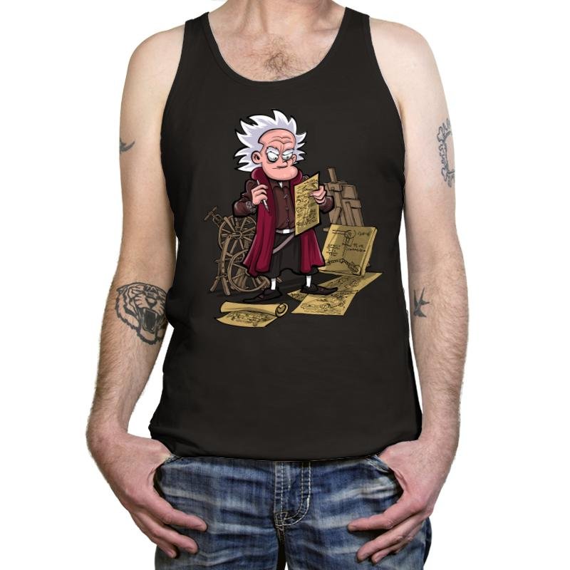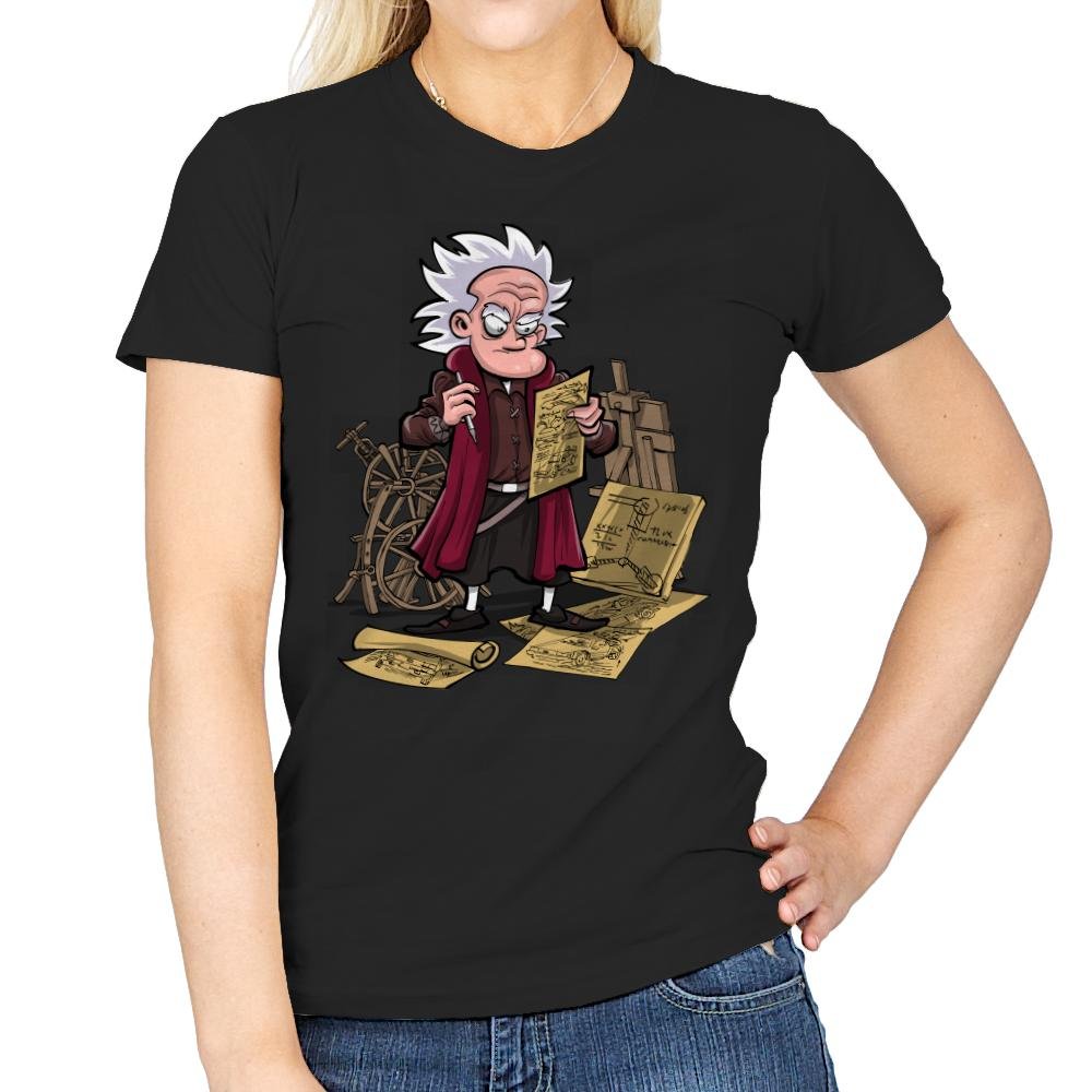 This design imagines a certain wild-haired inventor dropped into the Renaissance with parchment instead of plutonium. He studies sketches of machines that look suspiciously like time rigs and flying contraptions, surrounded by wooden prototypes that echo both engineering and eccentricity. The mashup works because both figures share that chaotic genius energy that makes impossible ideas feel practical. Fans will immediately read the nods to science fiction and classical art without needing anything explained.