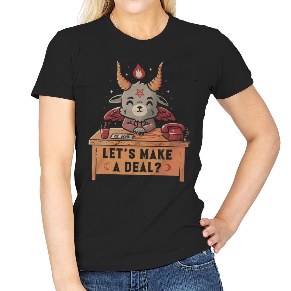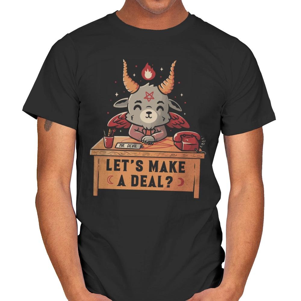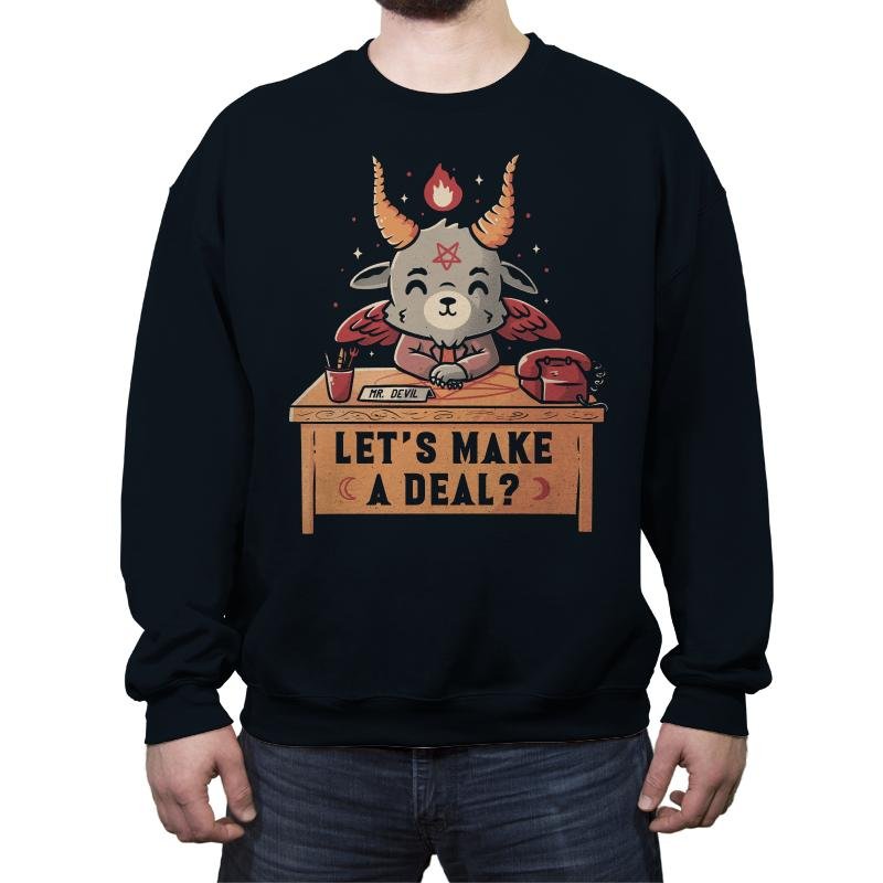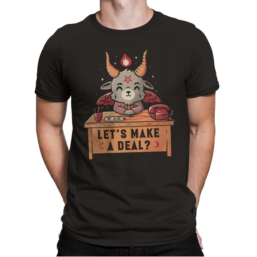 The design shows a small, horned goat-like devil sitting at a wooden desk. Tiny wings fold behind its back. A flame flickers from one horn. The devil clasps its hands with a friendly grin. A classic rotary phone and inkwell sit nearby. The desk sign reads “LET’S MAKE A DEAL?” in block letters with small crescent moons on each end.