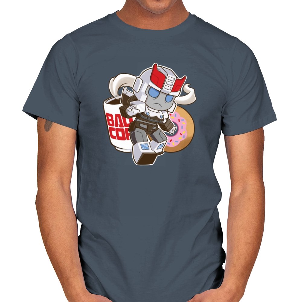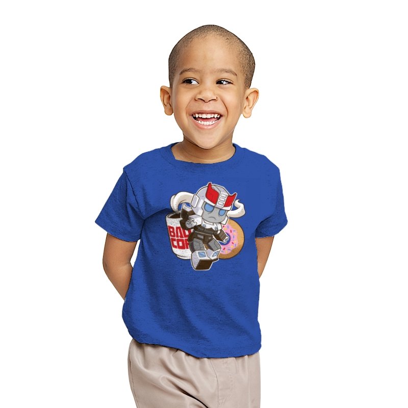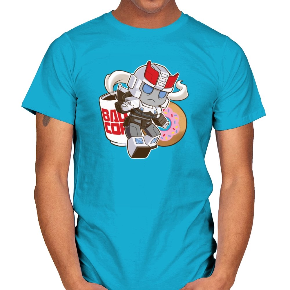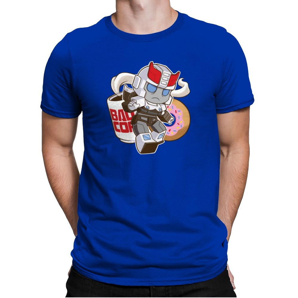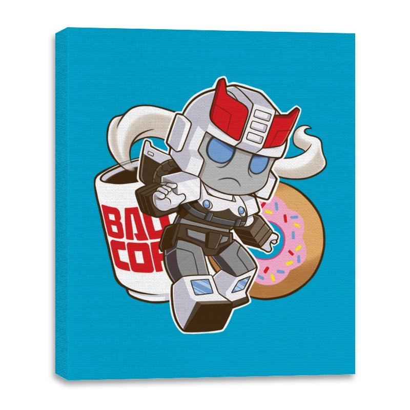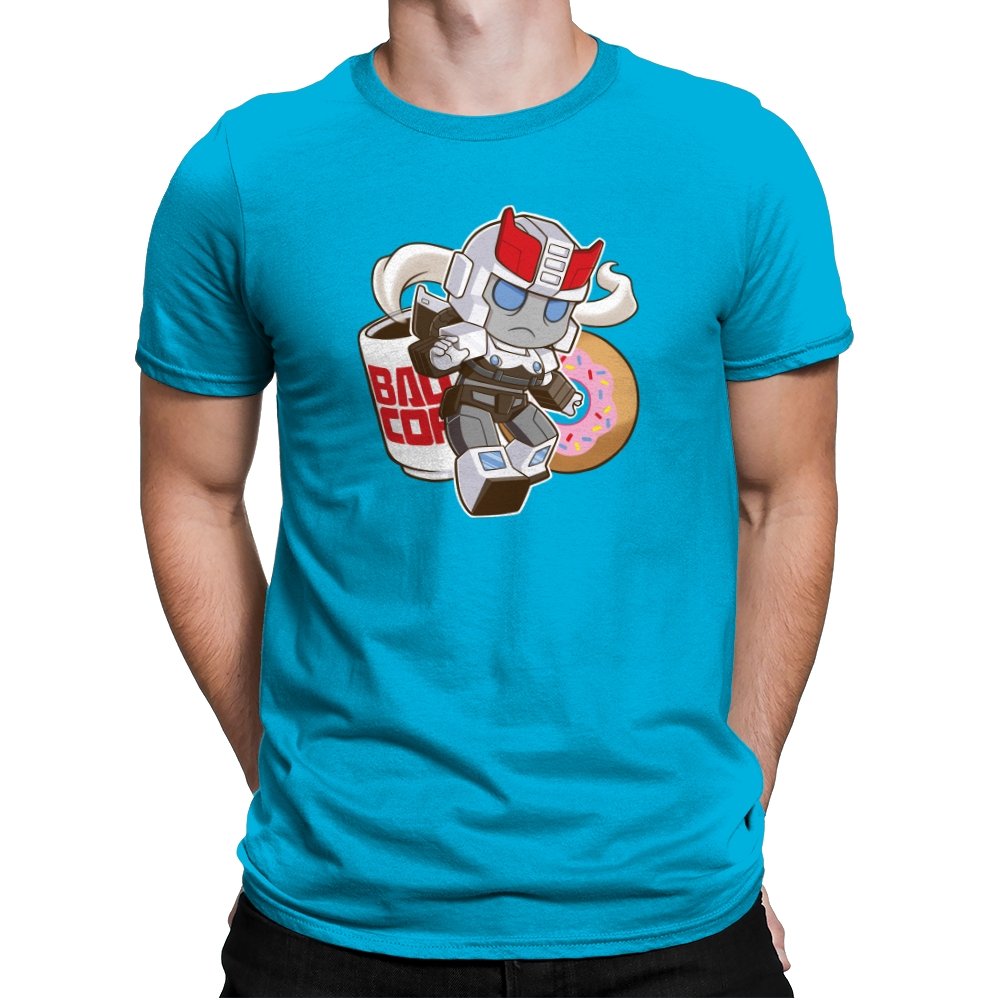 This design shrinks a familiar heroic robot into chibi form and drops him straight into a donut shop moment. Oversized helmet, tiny limbs, and a determined run contrast with the casual coffee cup and pink sprinkled donut behind him. The soft colors and rounded lines make the scene feel cozy instead of epic. If you know the reference, the humor comes from seeing duty collide with breakfast.
