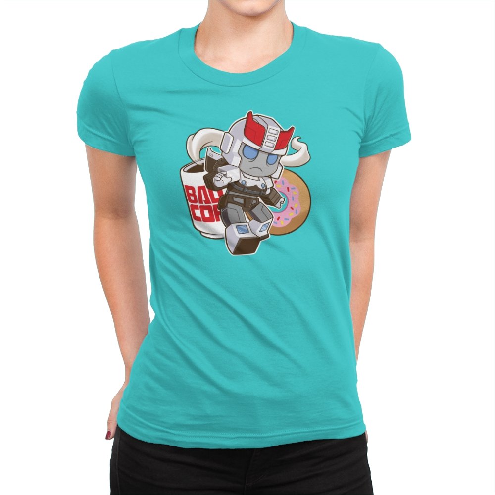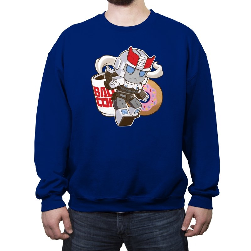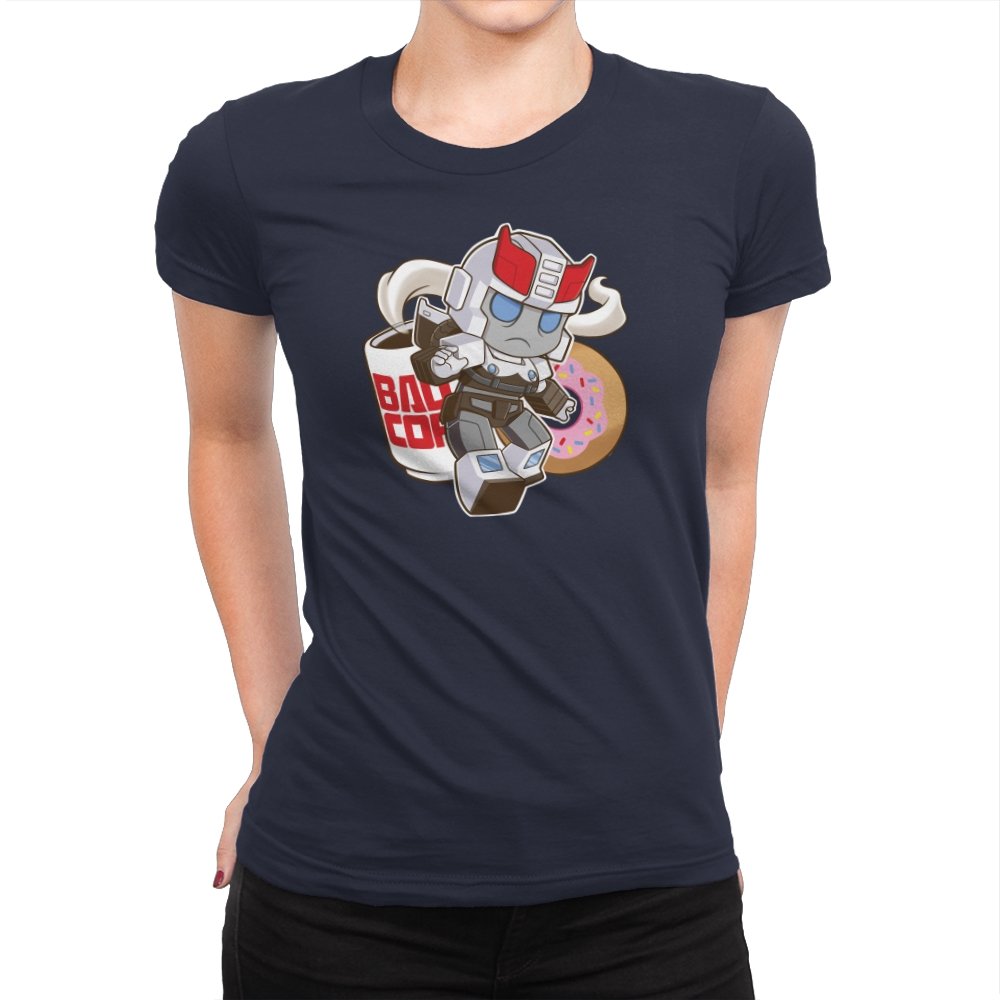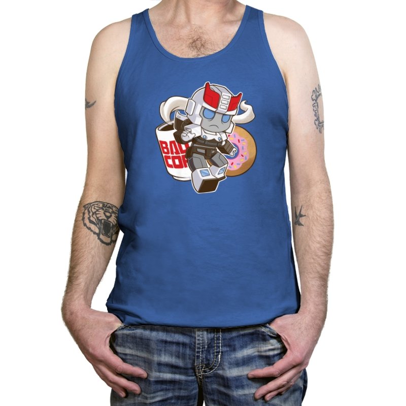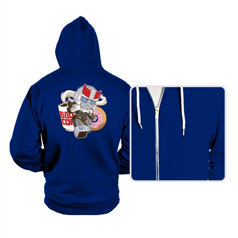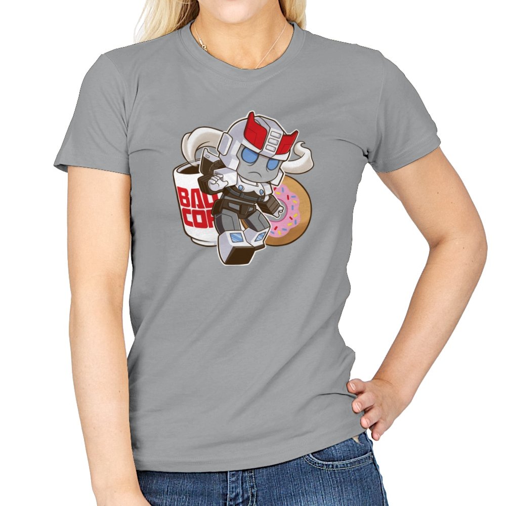 This design shrinks a familiar heroic robot into chibi form and drops him straight into a donut shop moment. Oversized helmet, tiny limbs, and a determined run contrast with the casual coffee cup and pink sprinkled donut behind him. The soft colors and rounded lines make the scene feel cozy instead of epic. If you know the reference, the humor comes from seeing duty collide with breakfast.