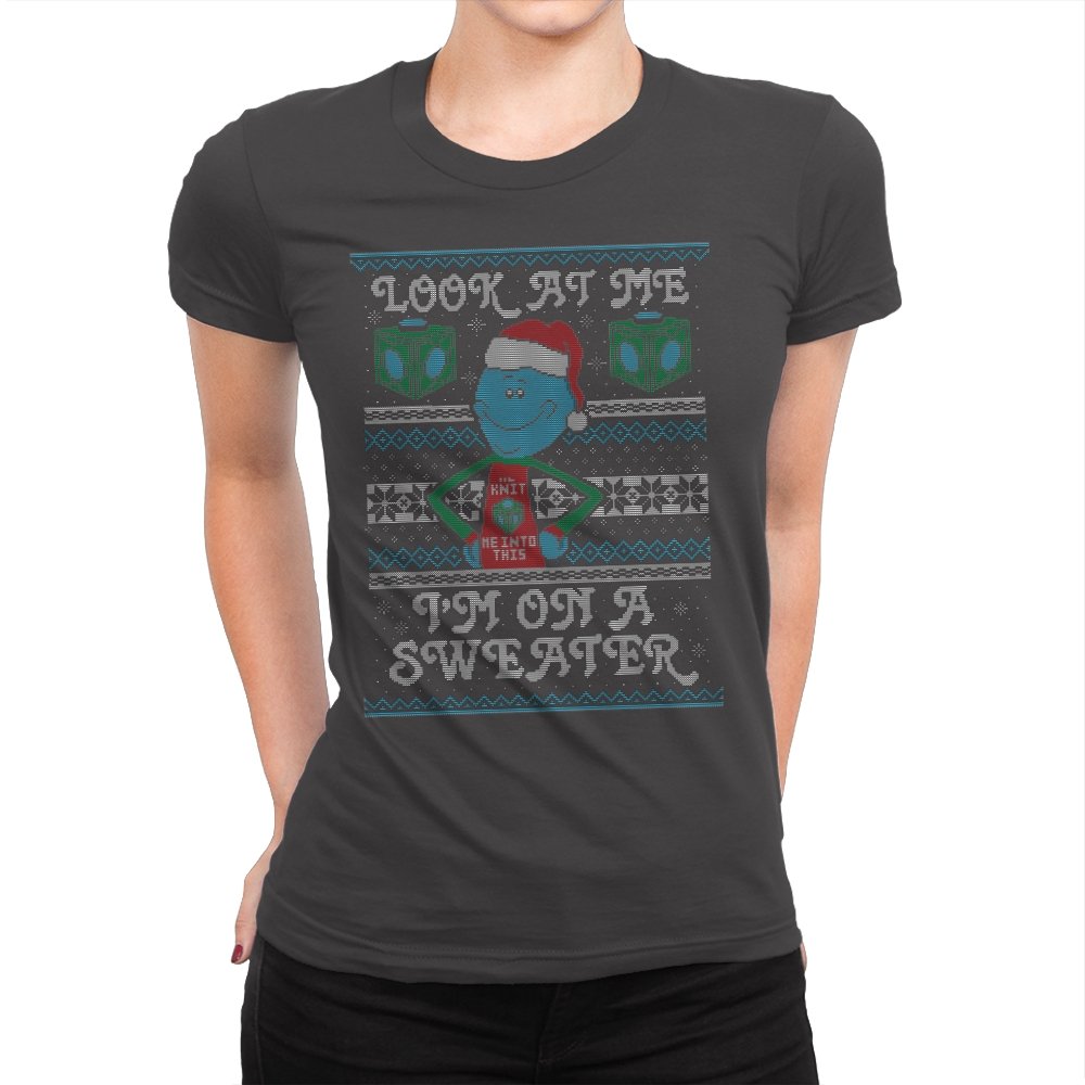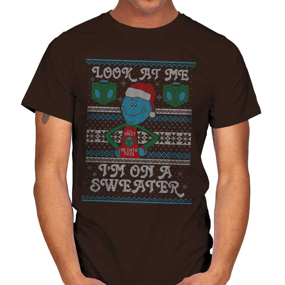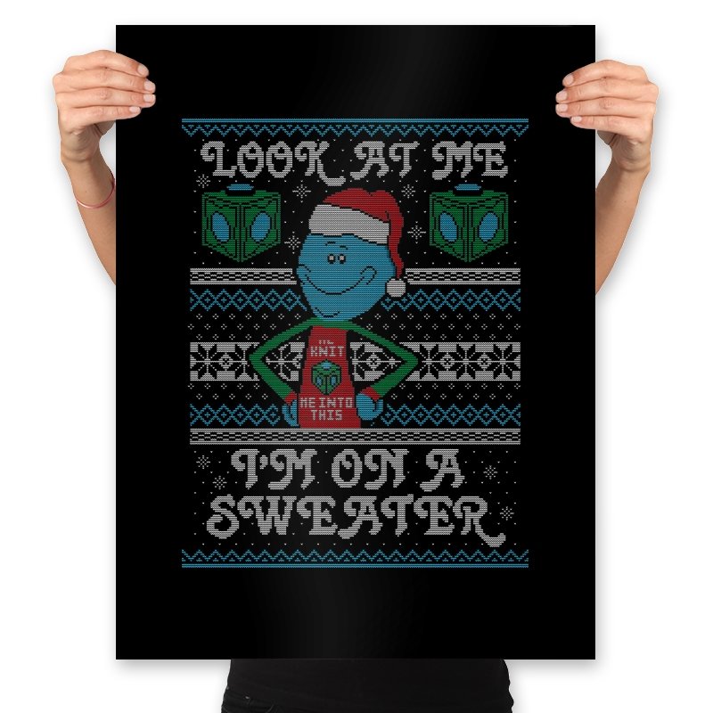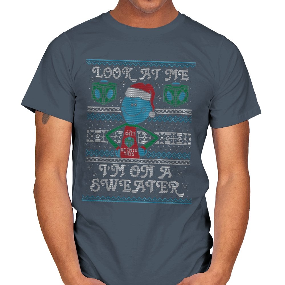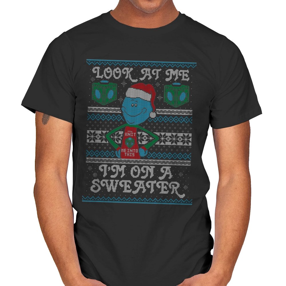 This design leans into fourth wall humor by having a certain blue helper proudly acknowledge his new knitted form. Wearing a Santa hat and a self aware holiday vest, he stands centered between faux knit snowflakes and geometric cubes that hint at his usual method of arrival. The stitched typography completes the joke, spelling out his delight at being immortalized on seasonal apparel. Fans who know the character’s dramatic tendencies will grin immediately.