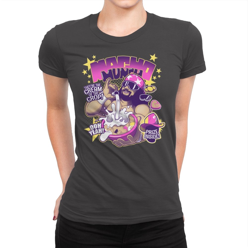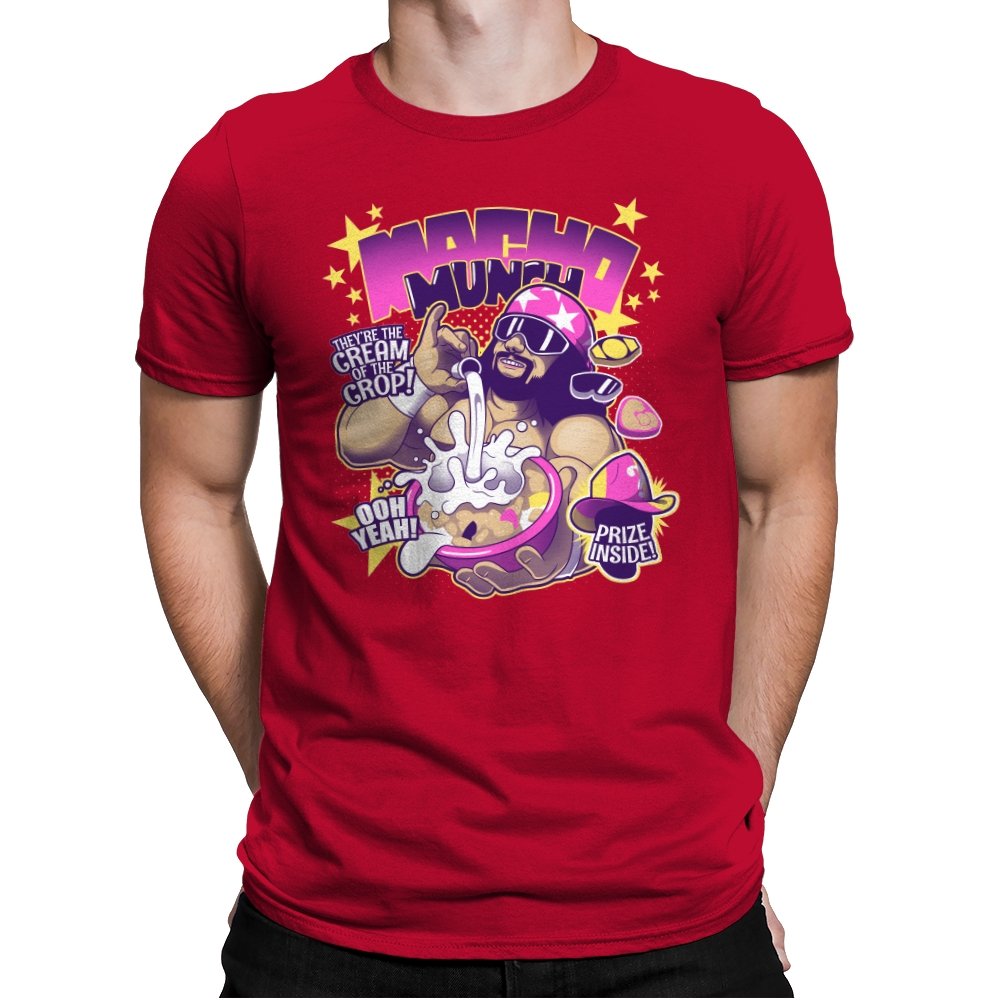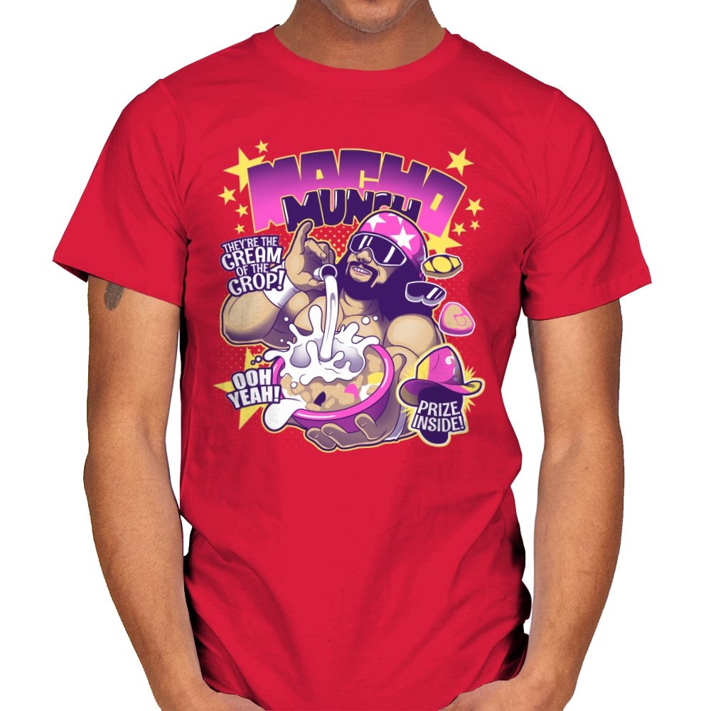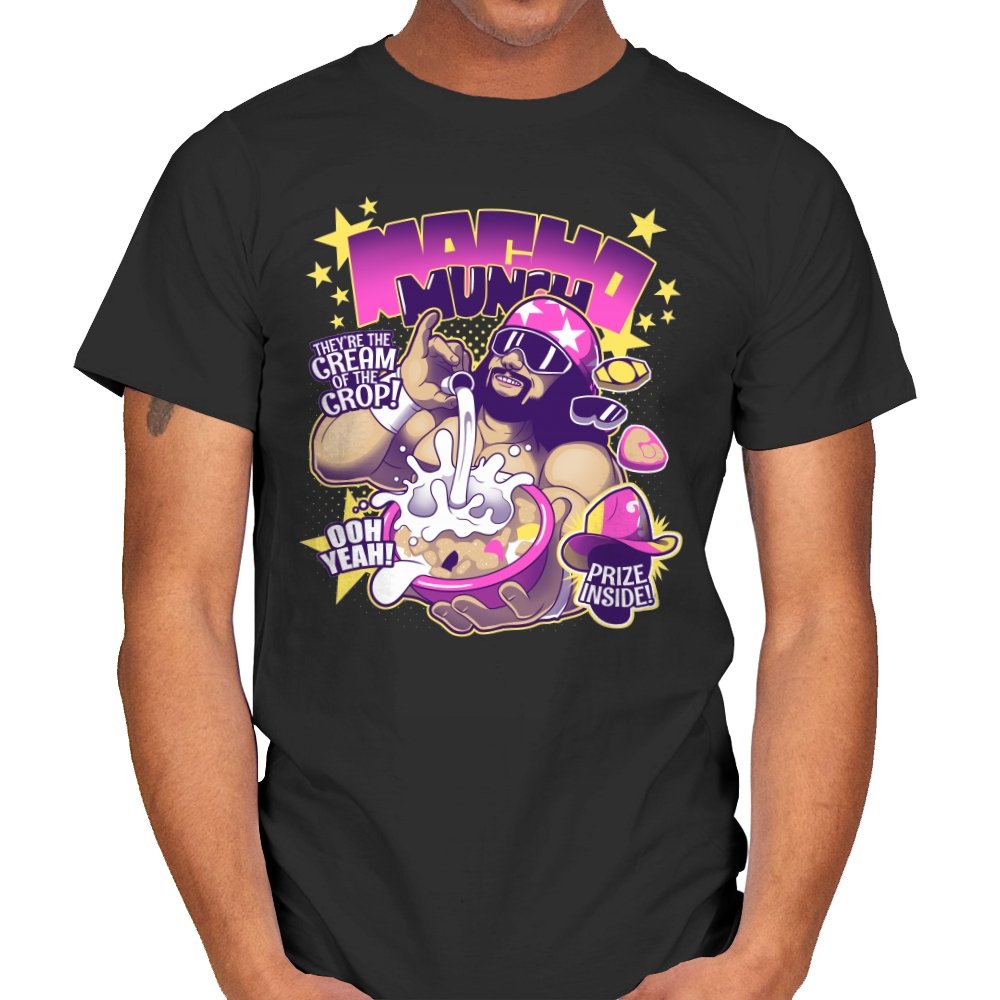 This design turns a legendary larger-than-life persona into a loud cereal box fantasy. A muscle-bound figure in sunglasses looms over a bowl of overflowing rings, milk splashing like a victory pose frozen in time. The composition borrows heavily from vintage breakfast packaging, complete with exaggerated slogans and prize callouts that push the bravado into parody. Fans who know the reference will appreciate how confidence becomes the entire flavor.