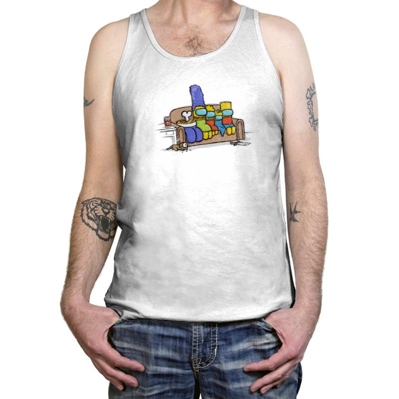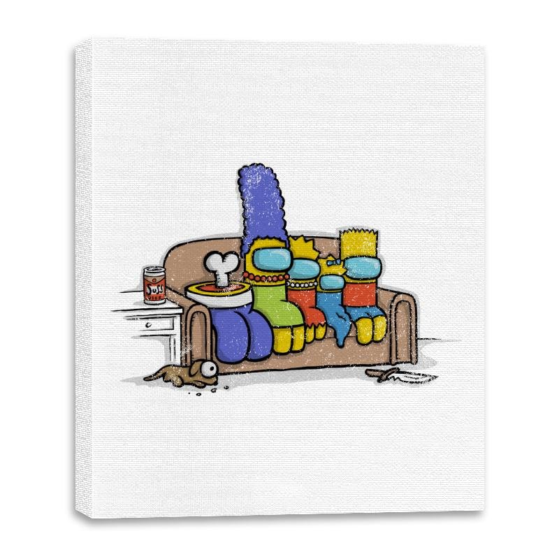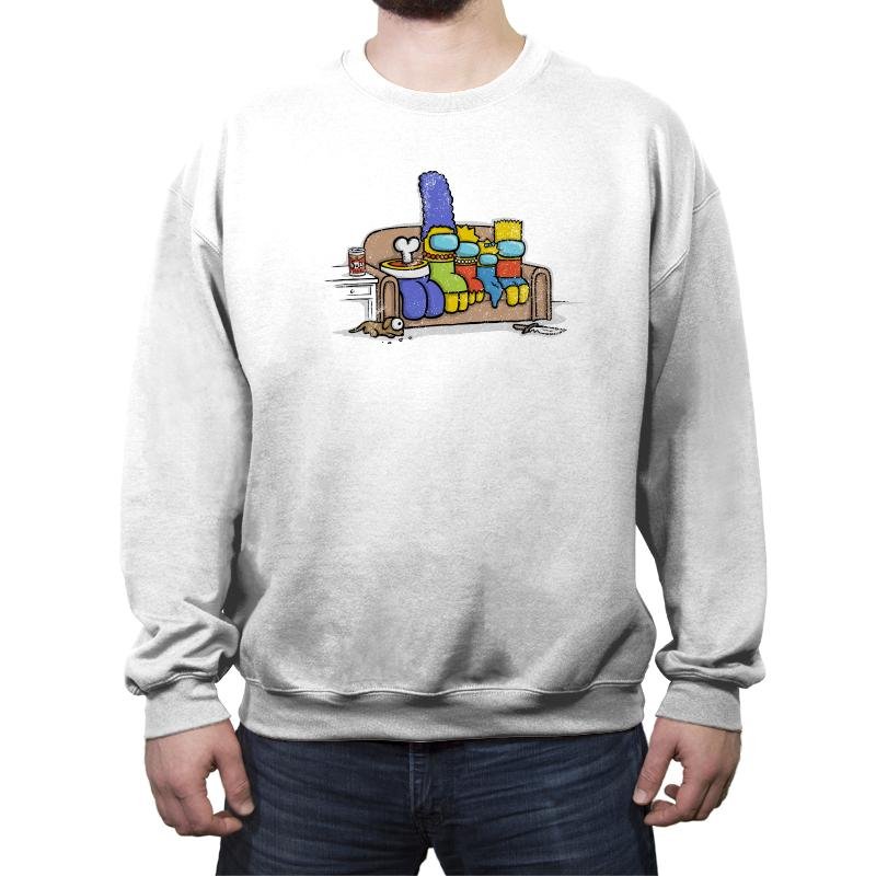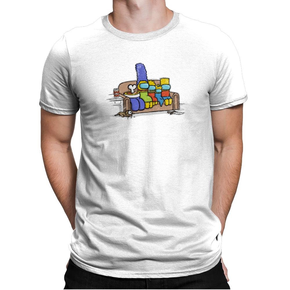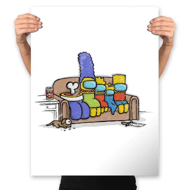 This design mashes up a beloved cartoon family’s famous couch pose with the paranoia of a social deduction game. Each family member is reimagined as a colorful space bean with visors, right down to the tall blue hair and spiky yellow head. A bone pops from the bowl on the coffee table and an unlucky pet peeks out from beneath the couch, hinting that something suspicious just happened in the living room. Fans will immediately recognize both references and enjoy the absurd crossover.