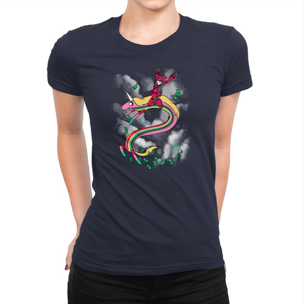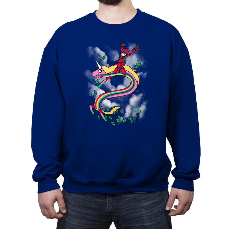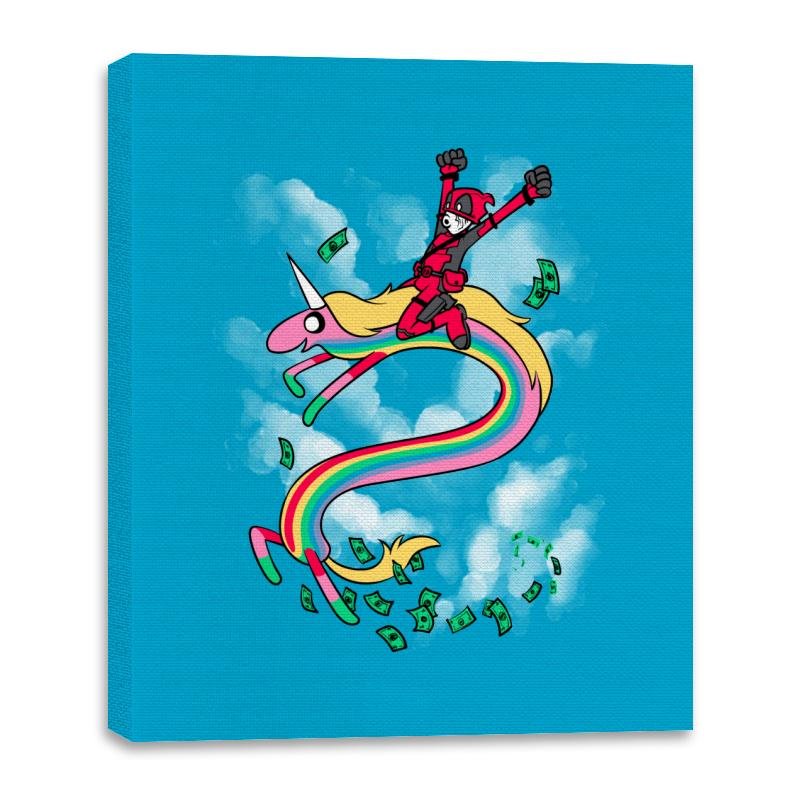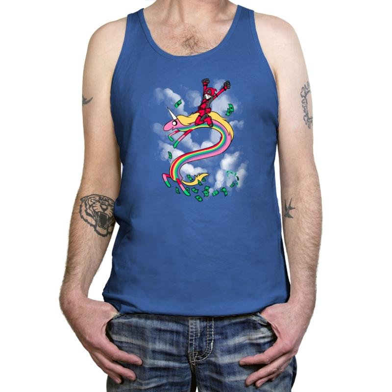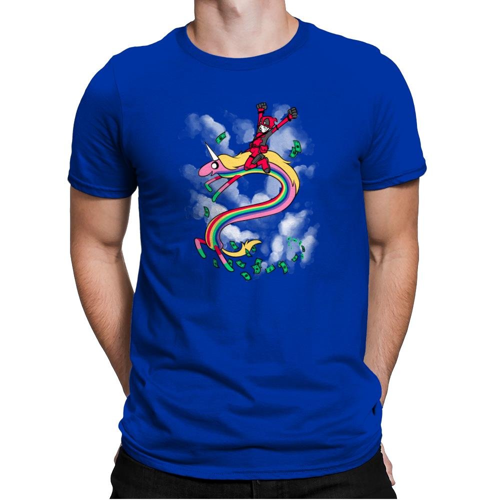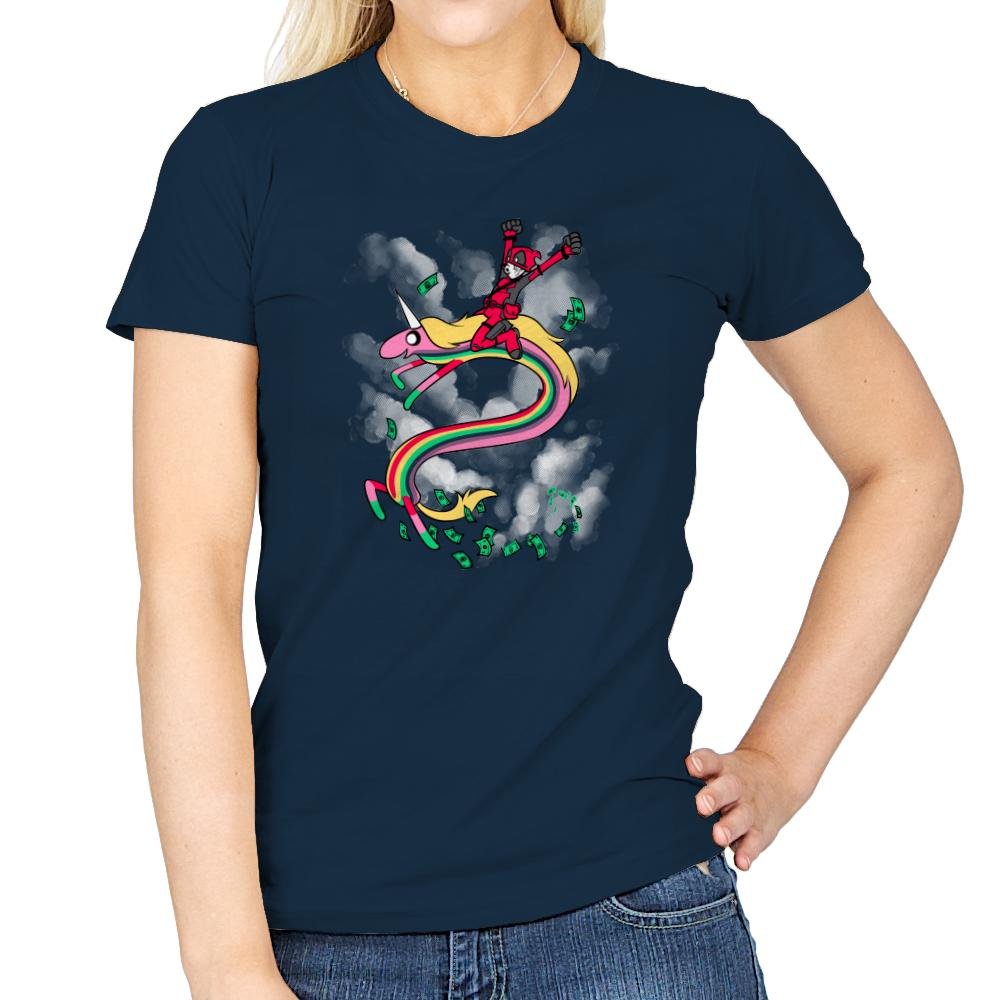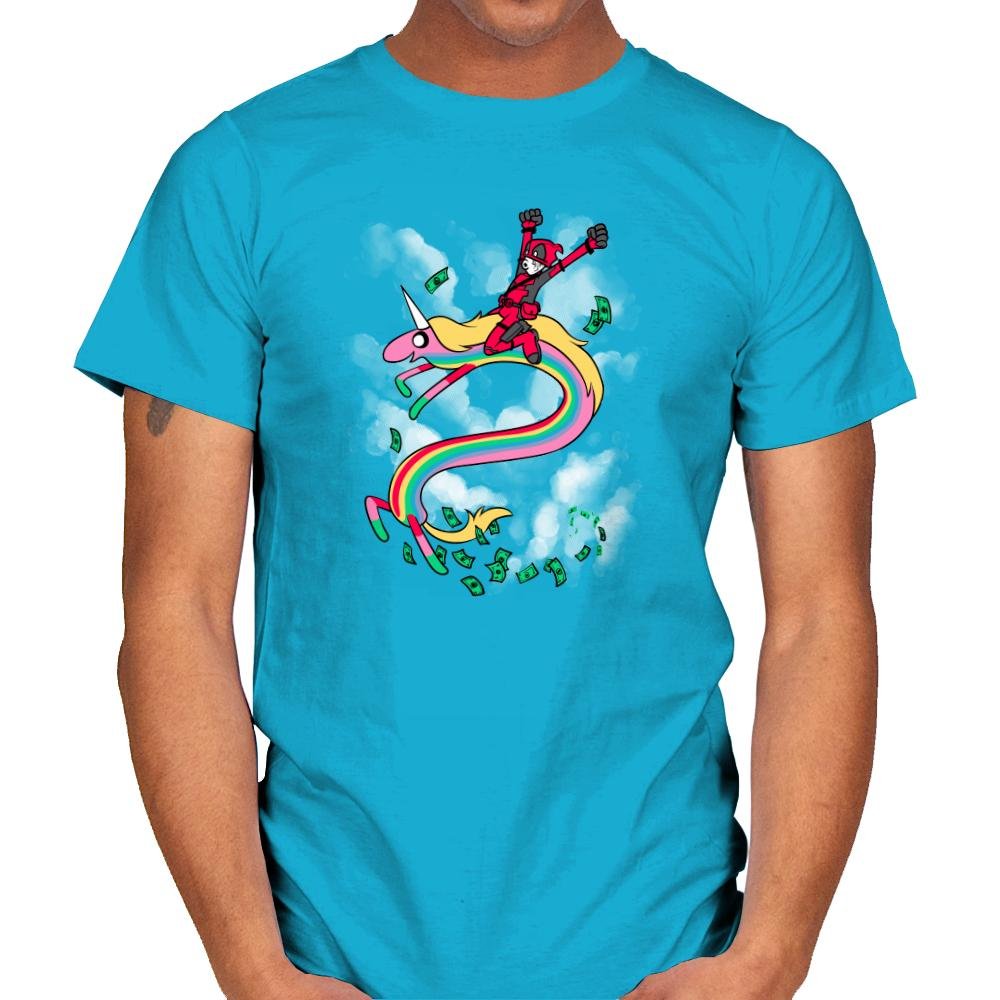 This design captures a mercenary thrill seeker riding a rainbow unicorn like it is the most normal thing in the world. The sky behind them swirls with clouds as money flies in every direction. It feels like a crossover between fantasy adventure and comic book absurdity, with the rider throwing their fists up in victory. Fans already know the gag here, especially the contrast between violence and candy colored whimsy.