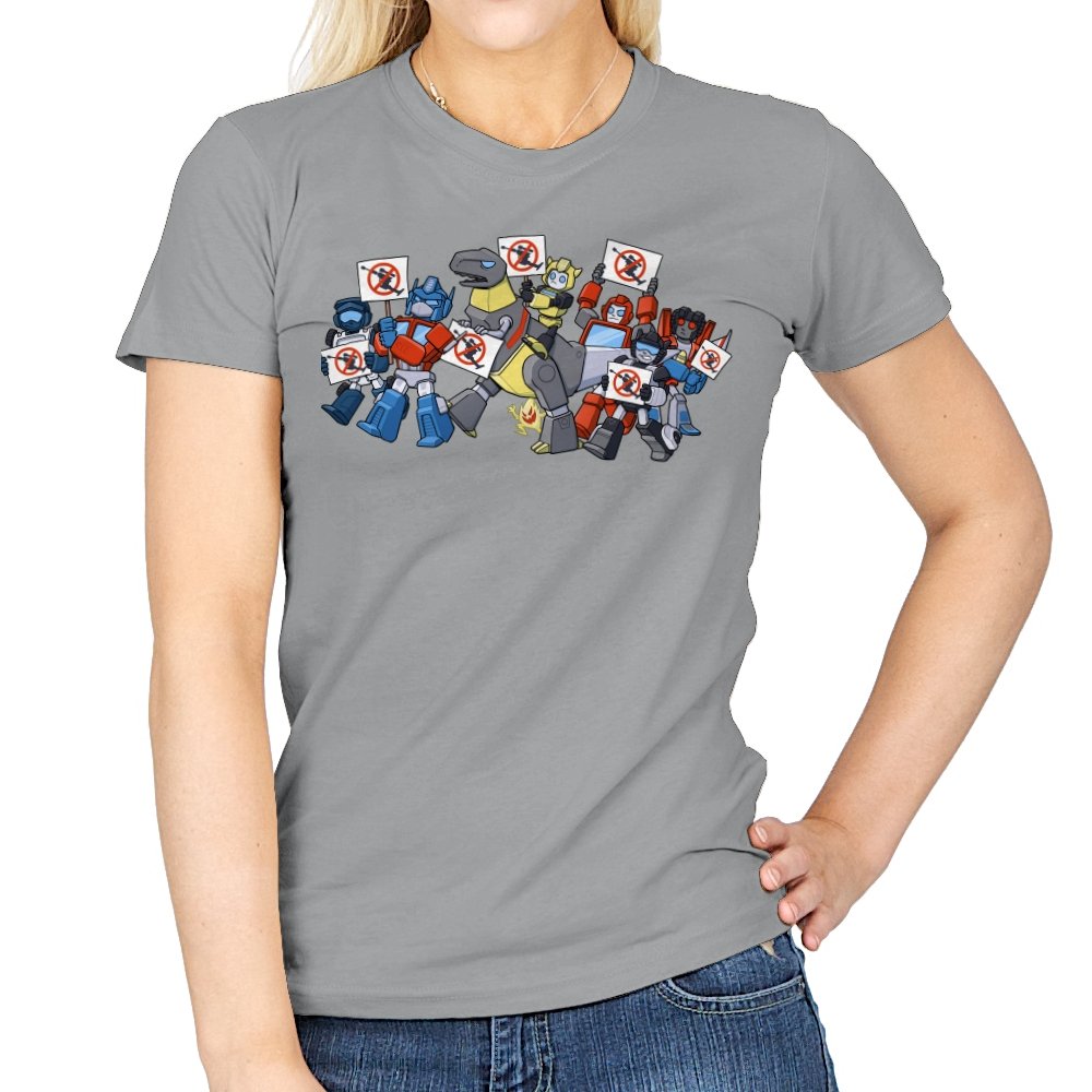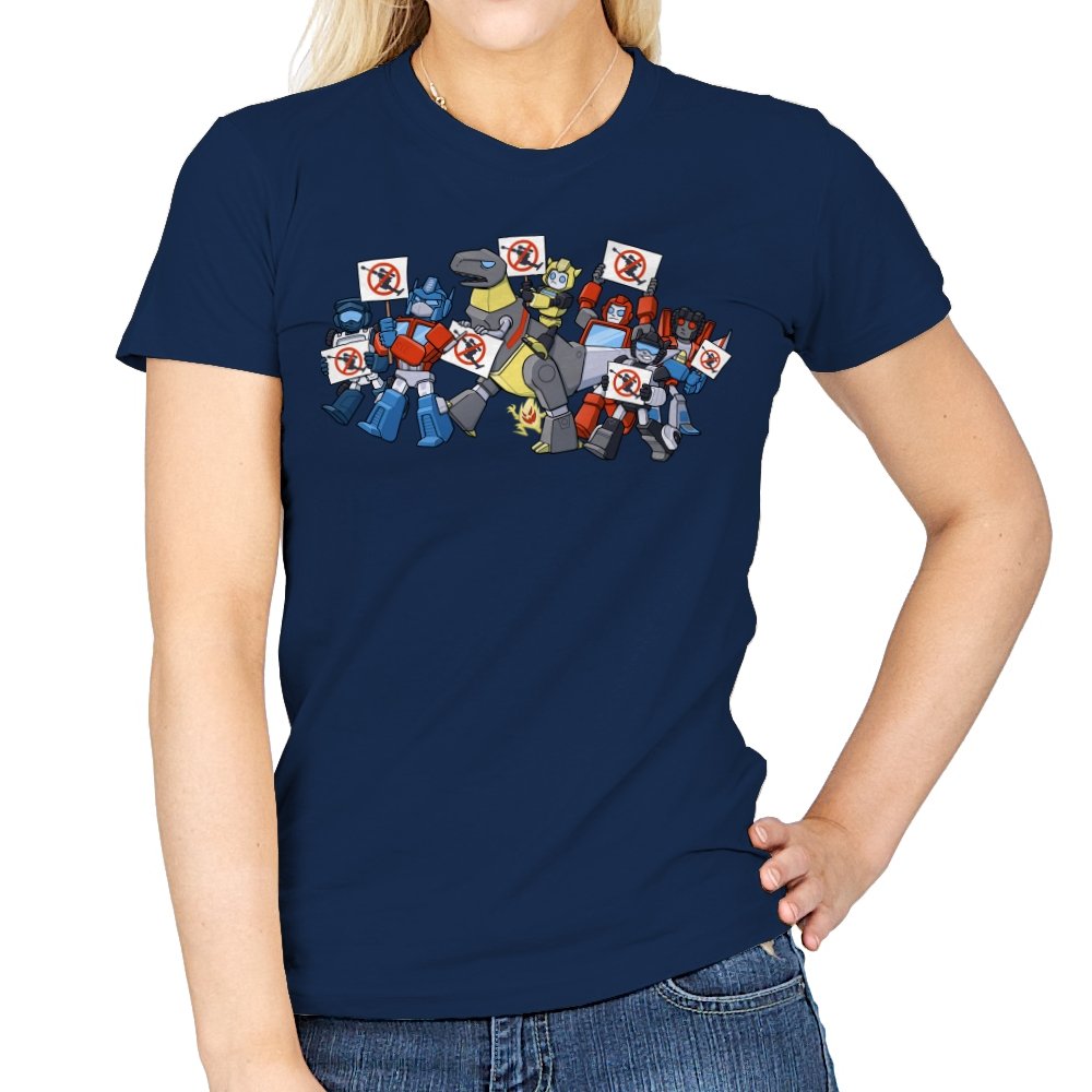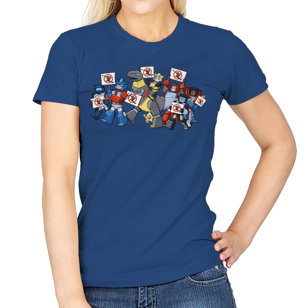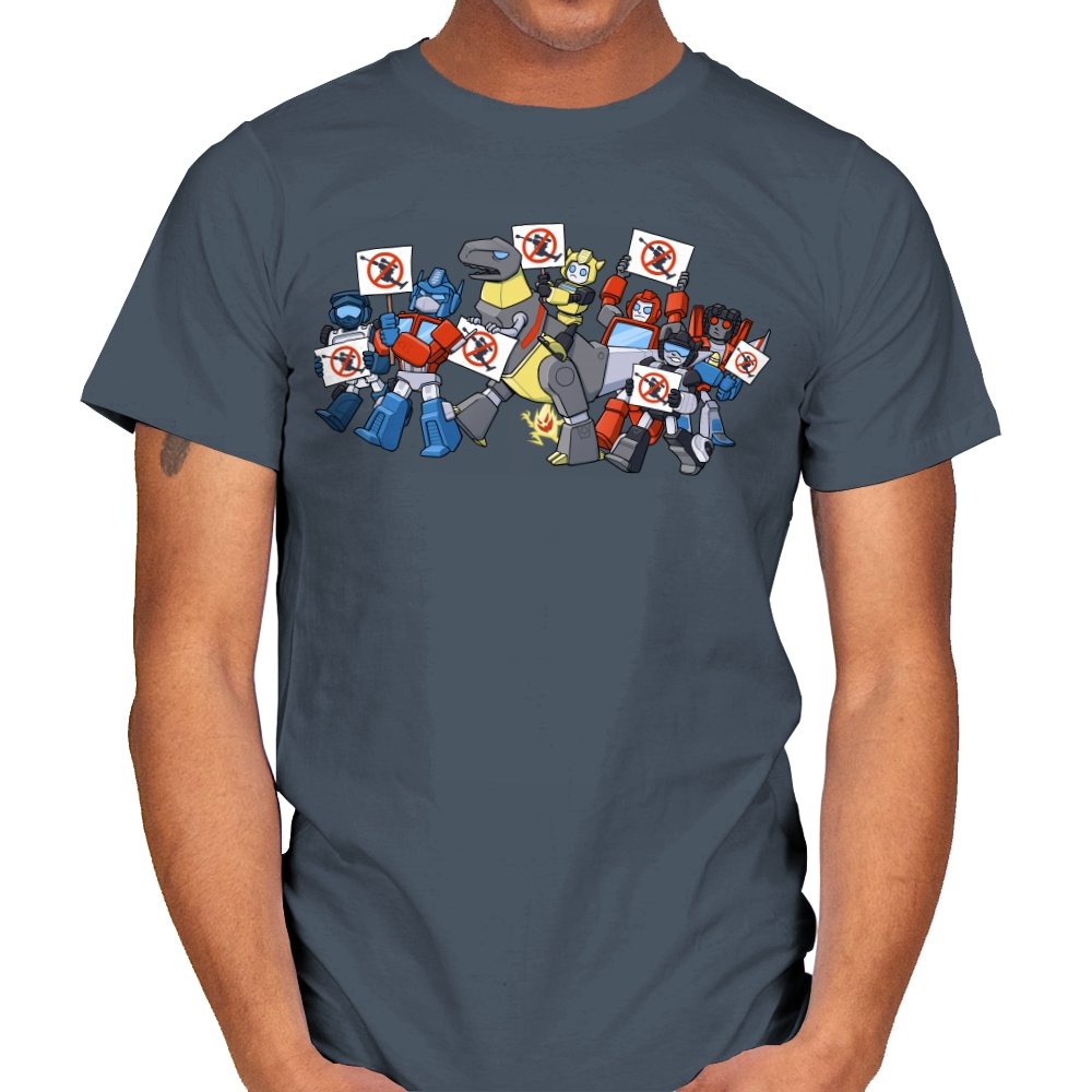 This design turns a familiar robot lineup into a tongue in cheek protest scene. The characters march together holding handmade signs, all aimed at a shared mechanical enemy they clearly agree on. The colors stay playful and clean, which makes the mock seriousness land even better. If you know the rivalry, the joke reads instantly without explanation.