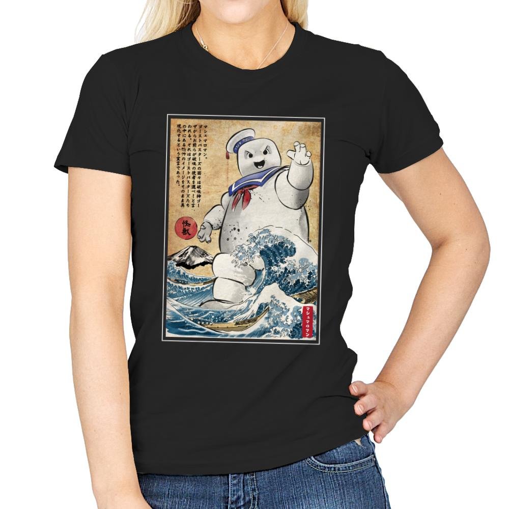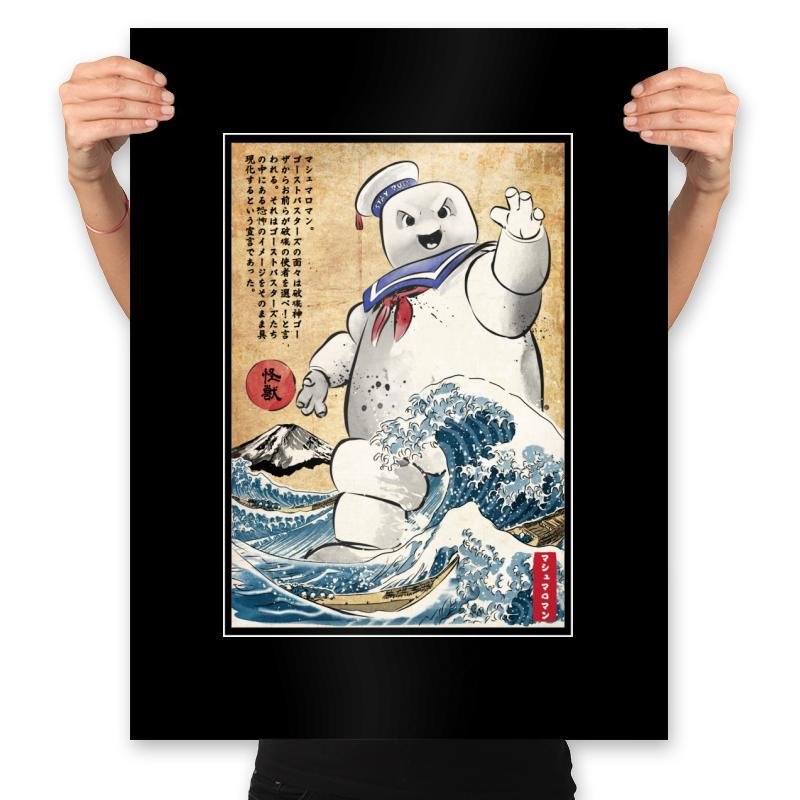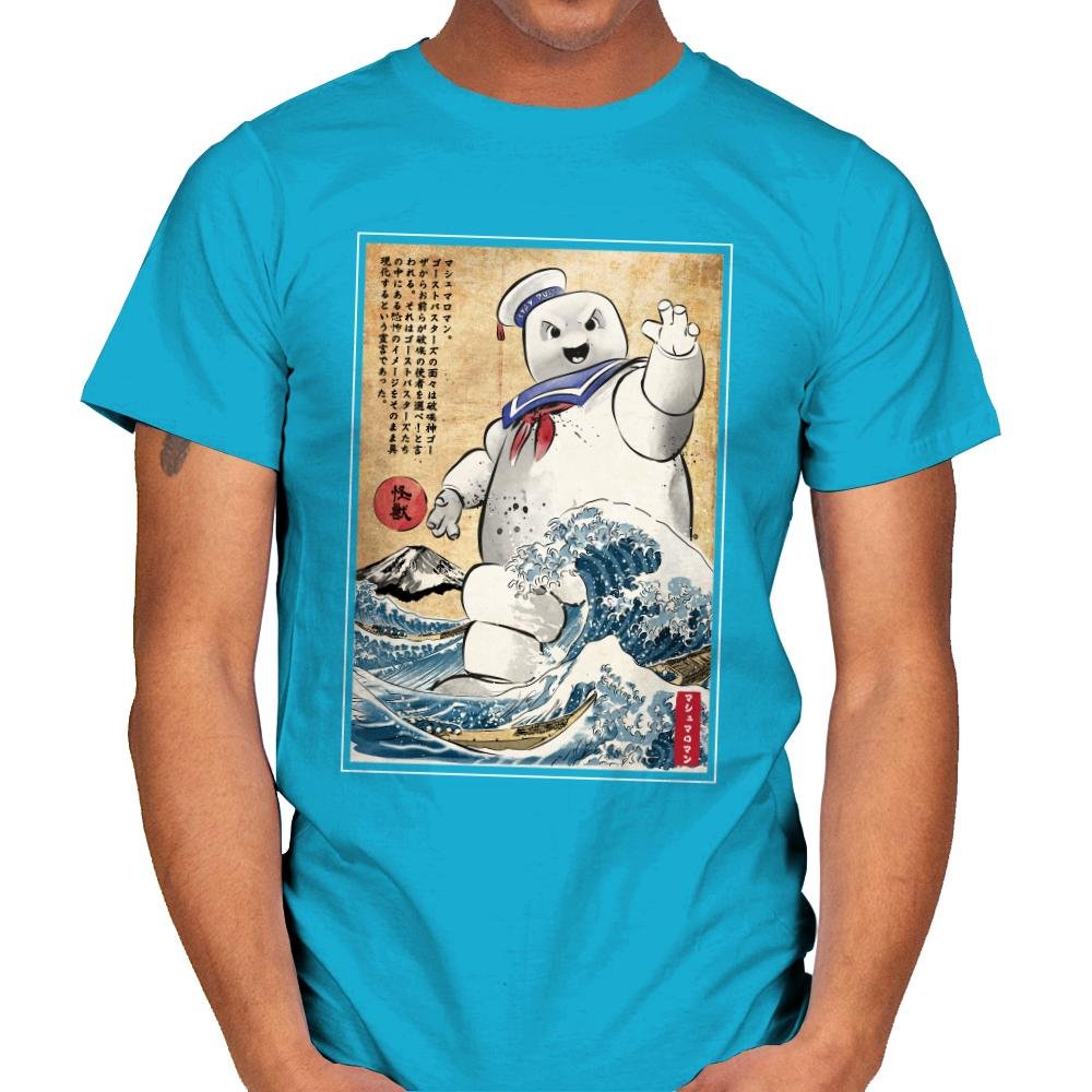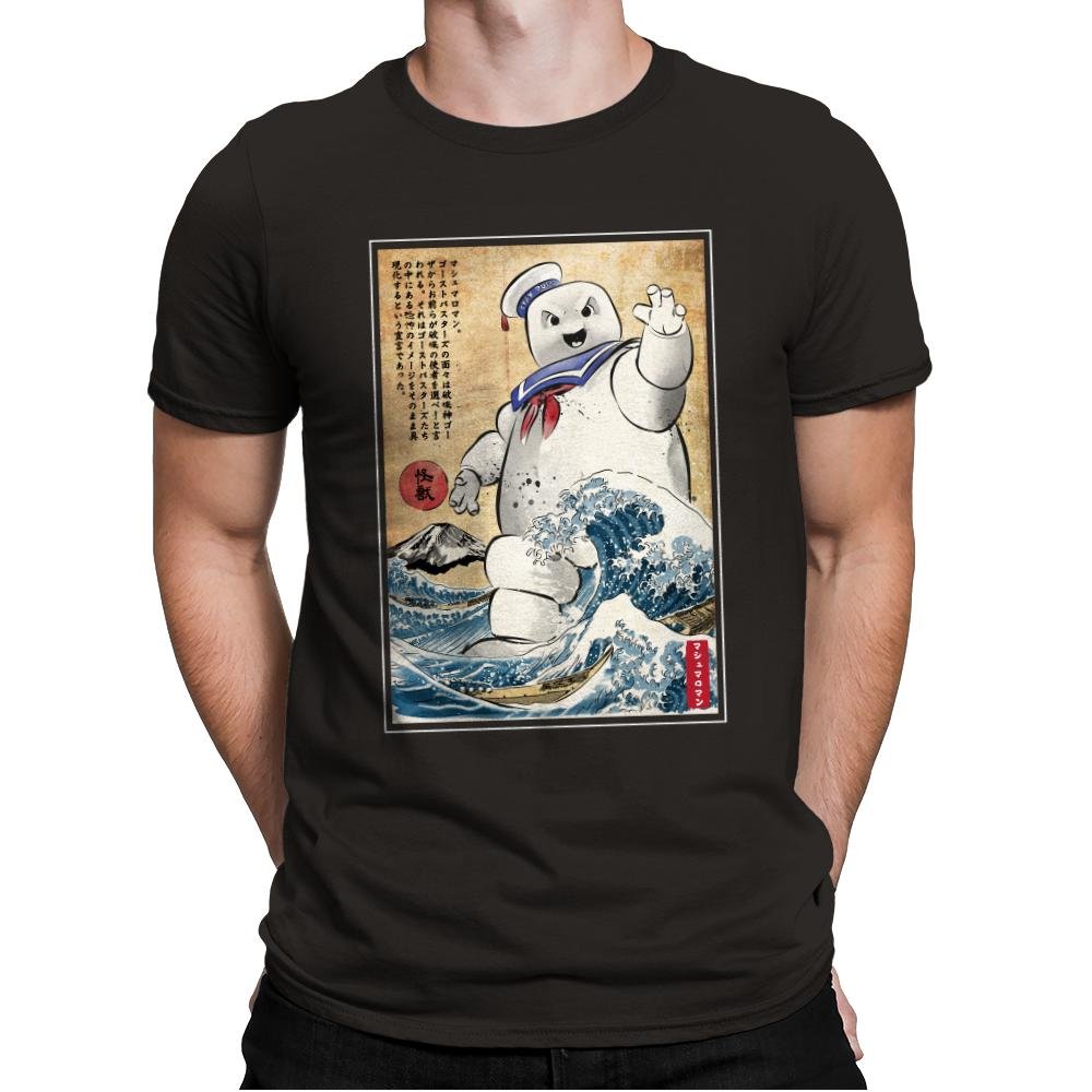 This design drops a familiar marshmallow menace into a classic Japanese woodblock-style scene. The character towers over stylized waves, borrowing visual cues from traditional prints while keeping that unmistakable playful threat. The contrast between soft, rounded chaos and disciplined old-world art is the whole joke. If you recognize both sides of the reference, it lands immediately.