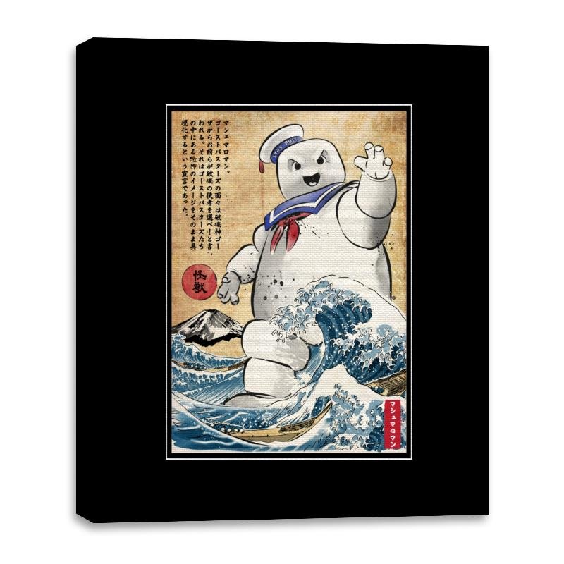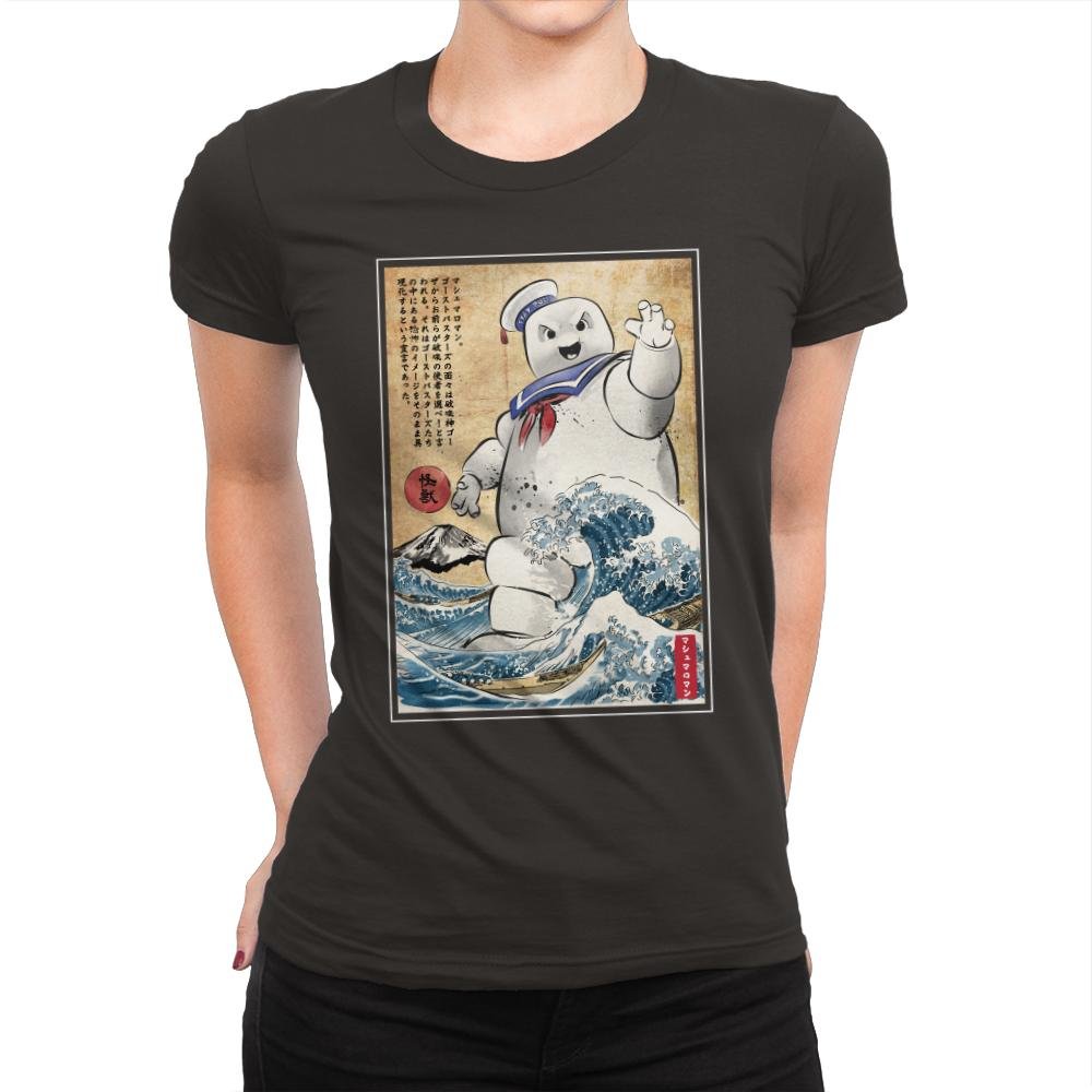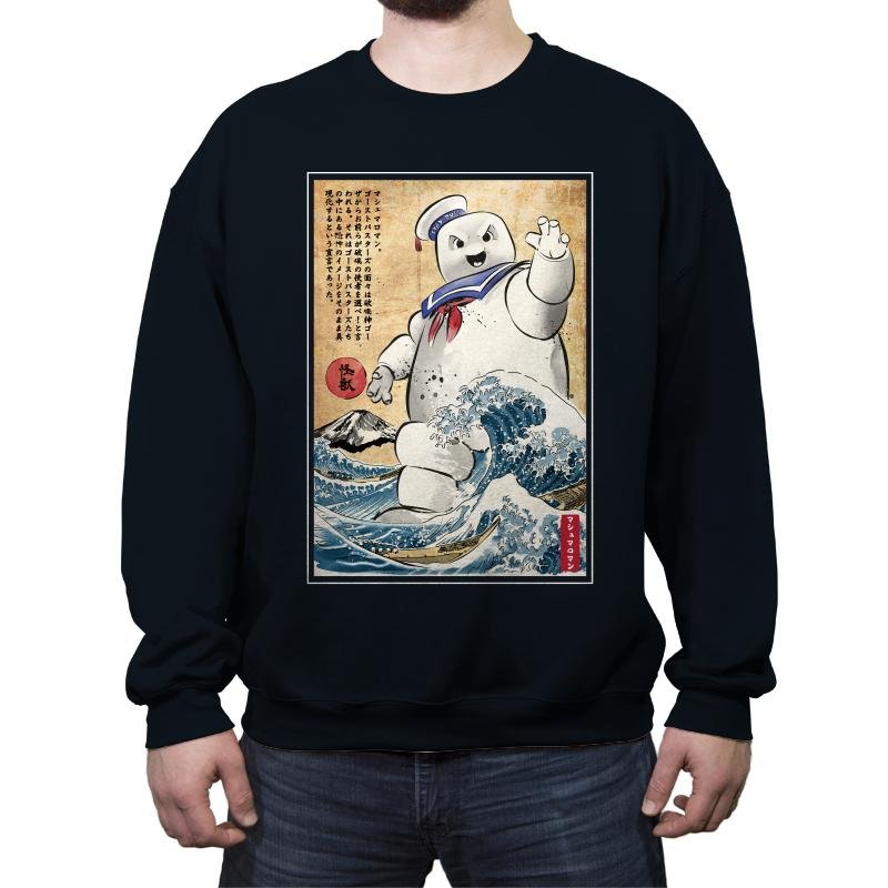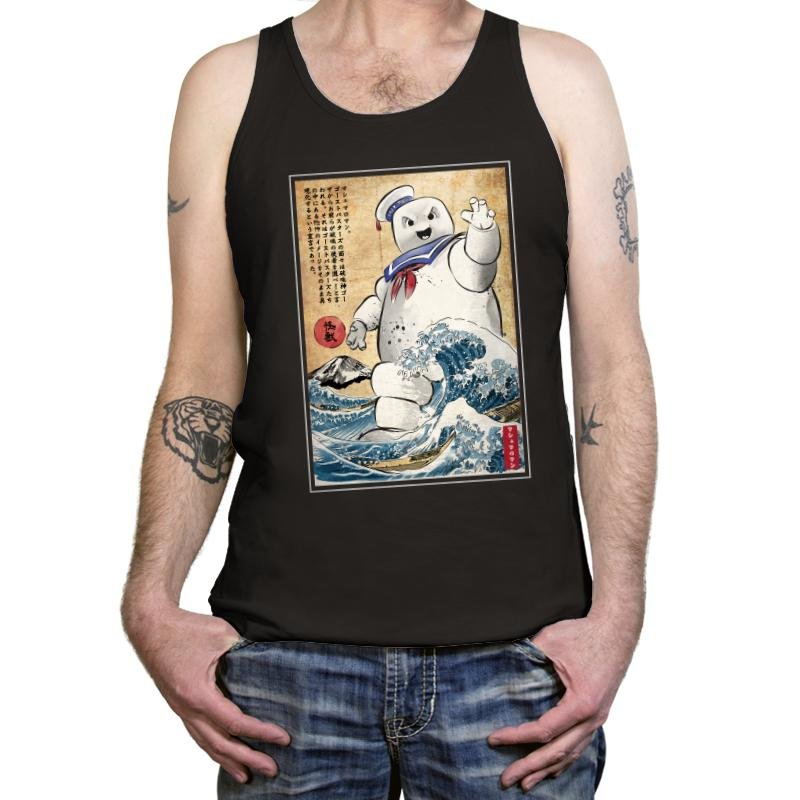 This design drops a familiar marshmallow menace into a classic Japanese woodblock-style scene. The character towers over stylized waves, borrowing visual cues from traditional prints while keeping that unmistakable playful threat. The contrast between soft, rounded chaos and disciplined old-world art is the whole joke. If you recognize both sides of the reference, it lands immediately.