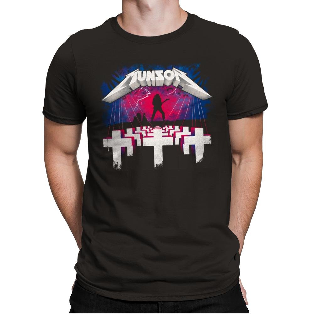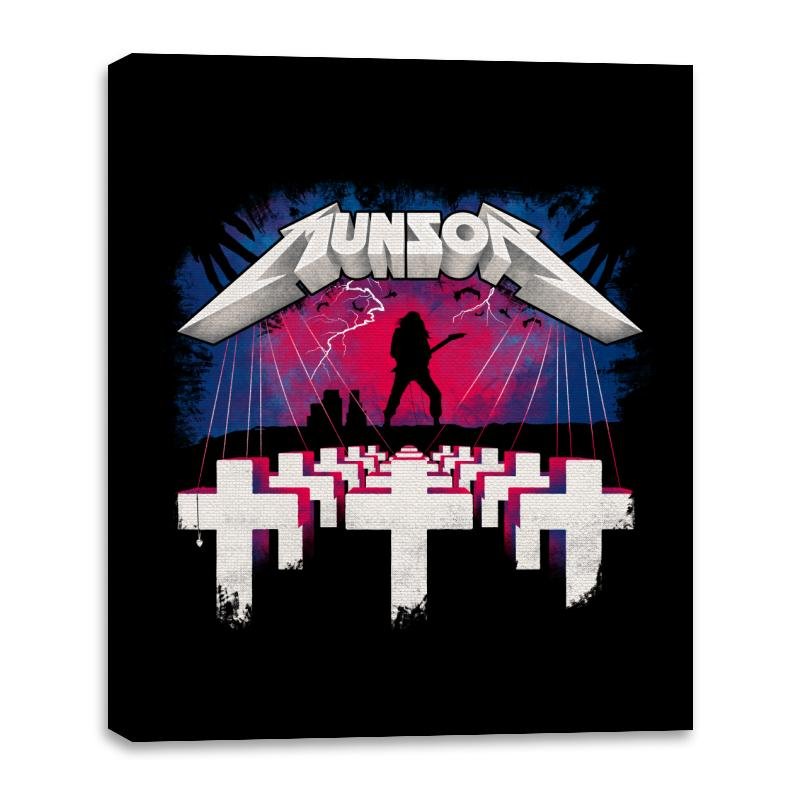 A lone metal hero shreds a guitar while lightning rips across a purple and pink sky. Below, rows of white crosses recede toward the horizon, all suspended by puppet strings attached to the title above. The lettering nods to a classic metal album and the whole composition feels like a poster you would find stapled to a teenager’s bedroom wall in the late eighties. Fans of both heavy music and fantasy storytelling will catch the mashup immediately.