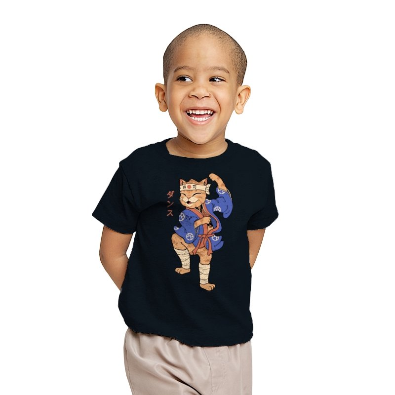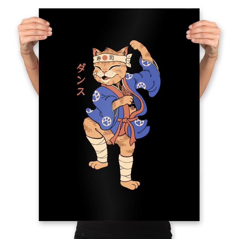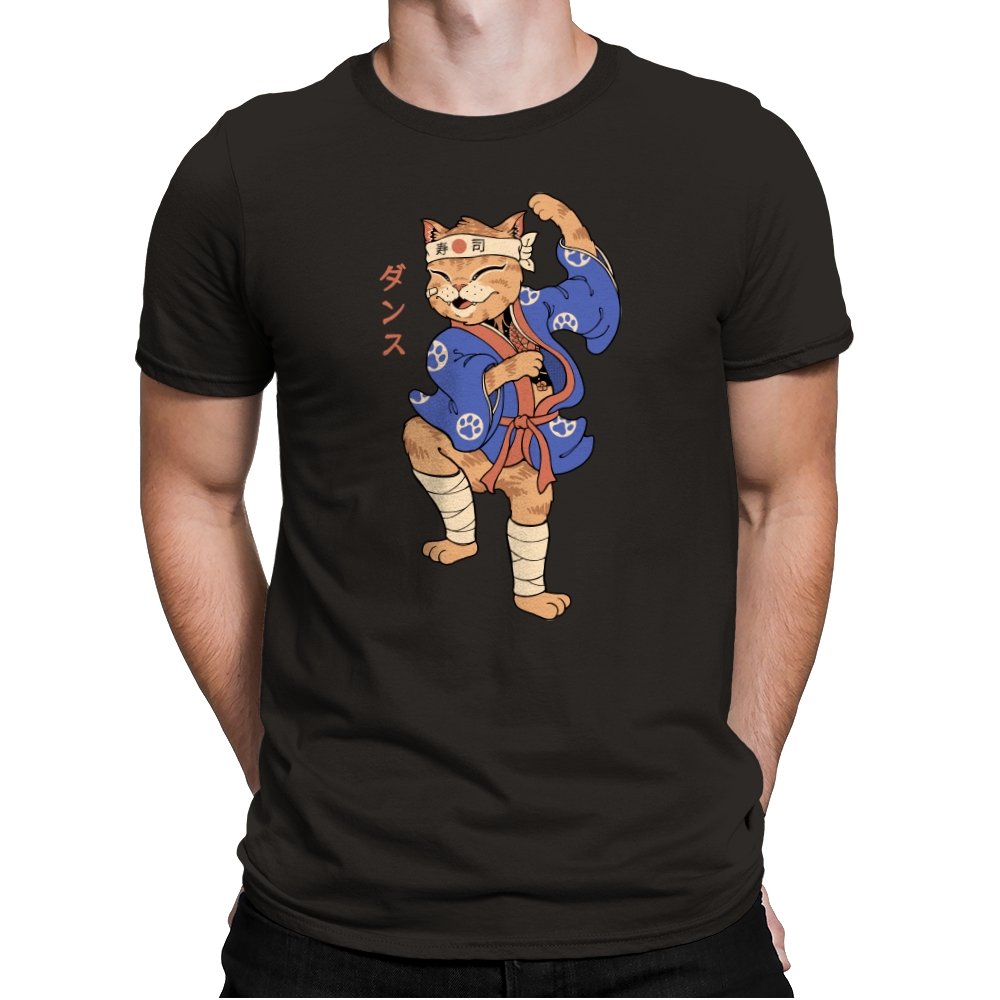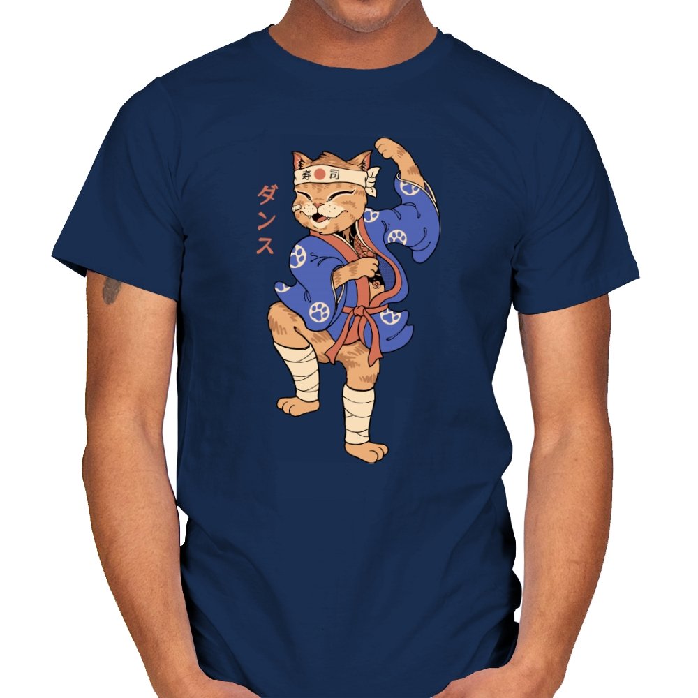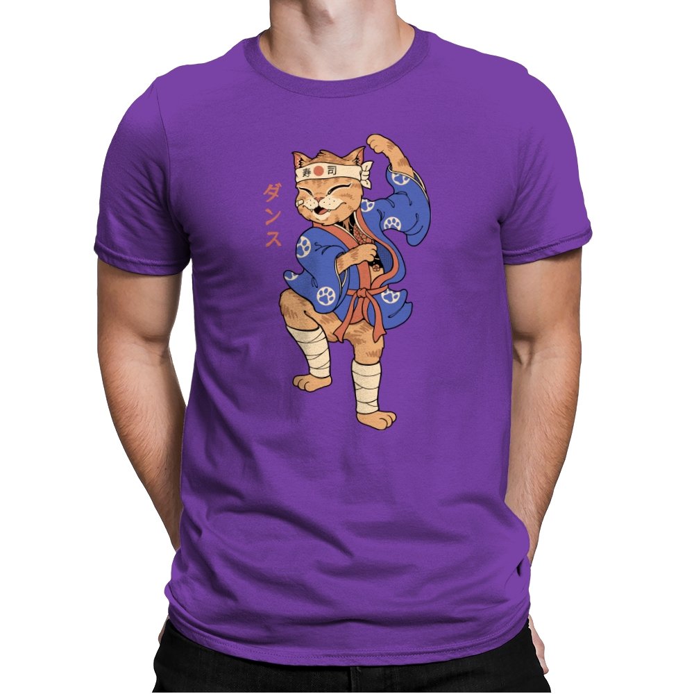 This design captures a confident cat frozen mid-pose, dressed in traditional attire with a playful martial arts twist. The stance is exaggerated and proud, the expression relaxed but focused, like a routine practiced purely for joy. Details like the headband, wrapped legs, and patterned robe ground the character in a familiar cultural aesthetic without overexplaining it. It feels like a moment pulled from an animated side quest you remember more clearly than the main story.