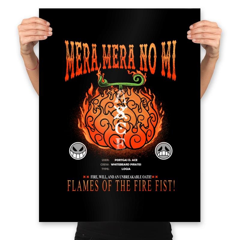 Mera Mera No Mi Devil Fruit presents one of the most infamous power sources in pirate lore as a vintage catalog plate. The design shows a swirling orange fruit crowned with green curls and wrapped in stylized flames, as if an artisan glassblower documented it for a museum of the impossible. Surrounding text lists the item’s class and former owners in the tone of a formal dossier, while two grinning insignias lean into the darker humor of the setting. Fans recognize the fire fist legacy without needing any names shouted.