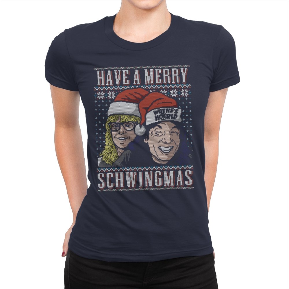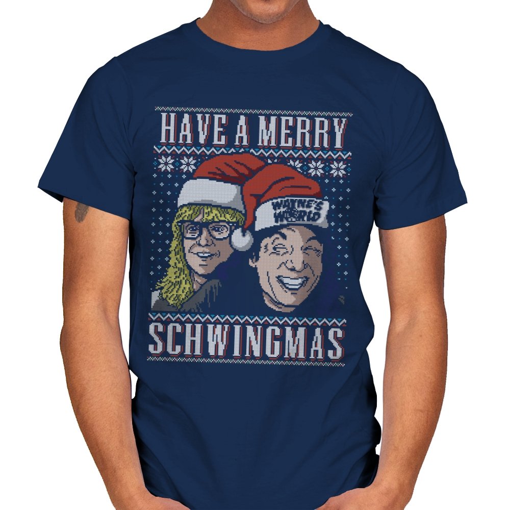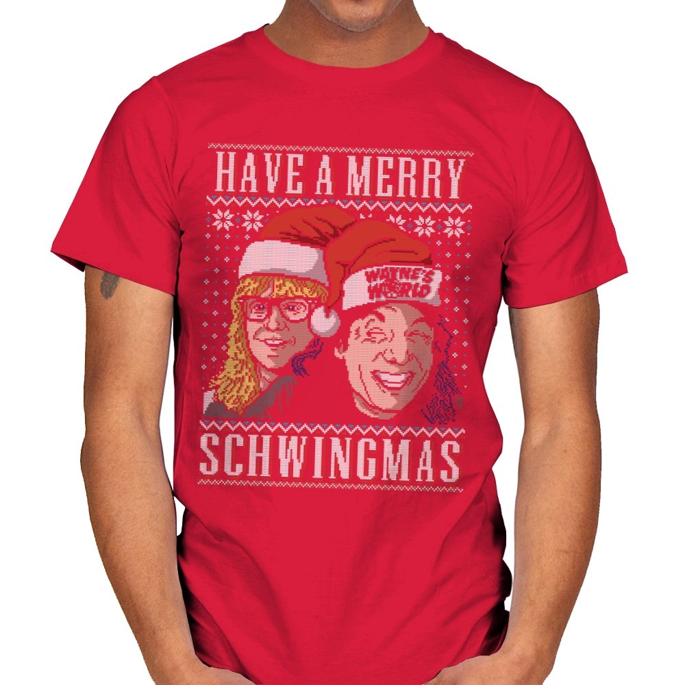 This design leans hard into knit-pattern nostalgia, pairing an instantly recognizable duo with classic ugly sweater energy. The pixel-style artwork mimics a holiday jumper straight out of a late night TV binge, complete with Santa hats, stitched borders, and a grin you can almost hear. It balances festive cheer with the kind of humor that never really grew up. If you know, you know, and that is the whole point.