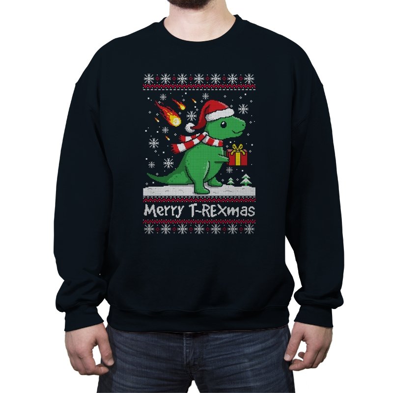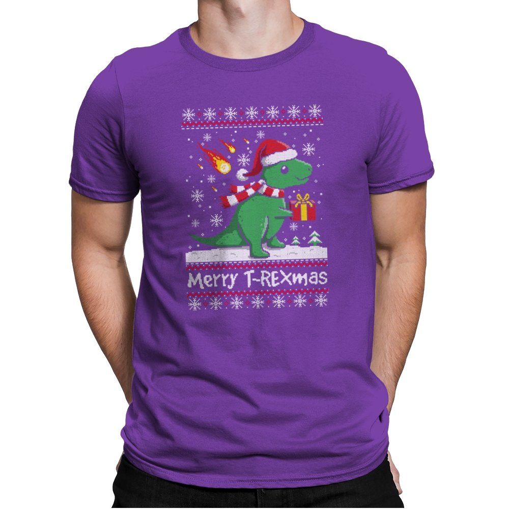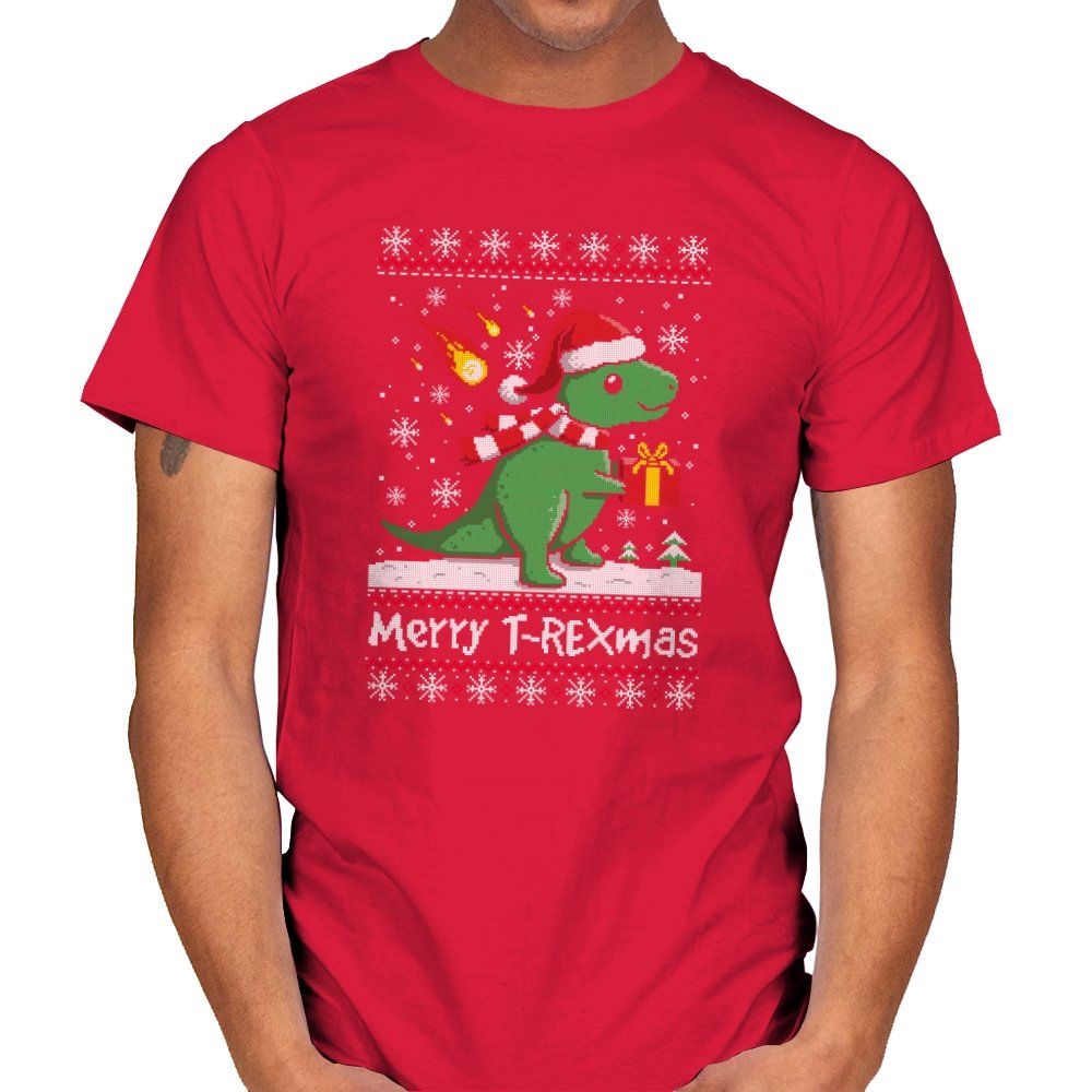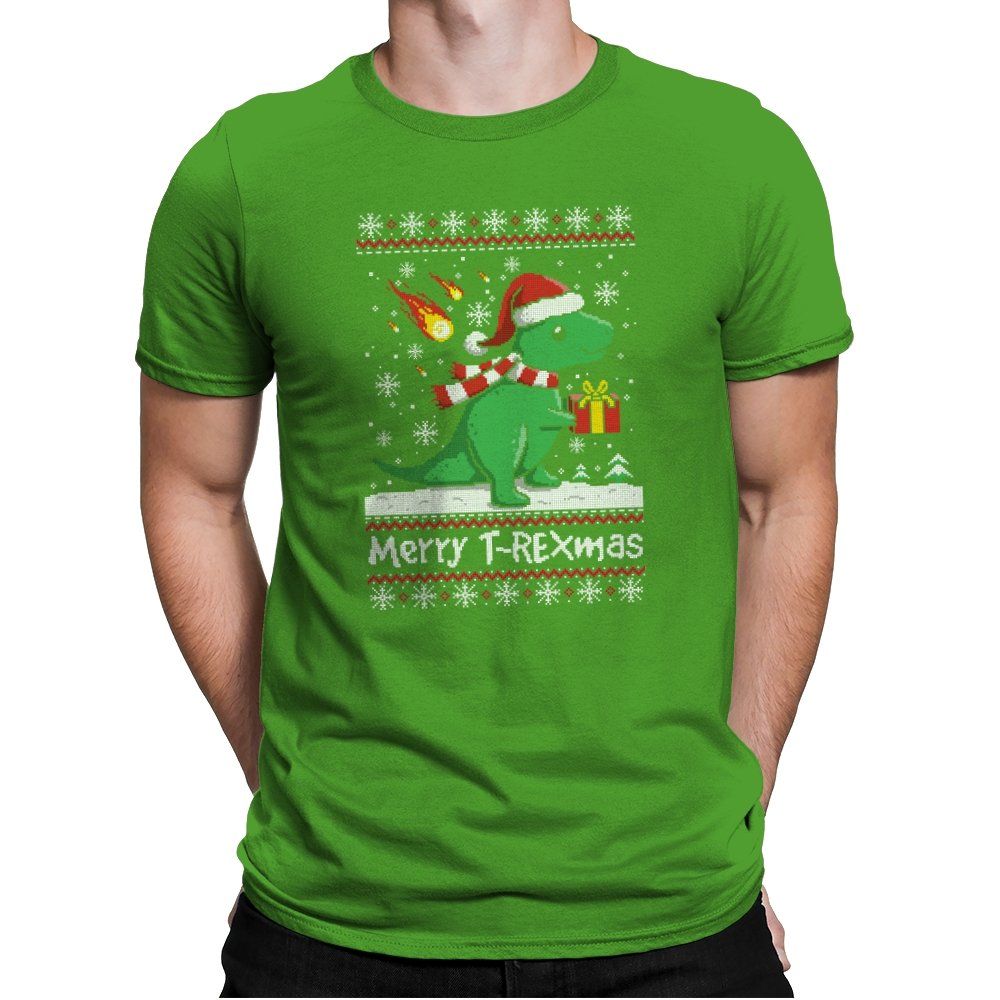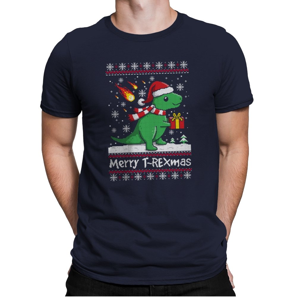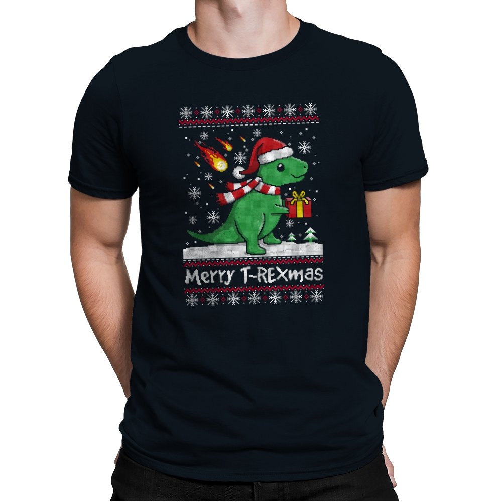 This ugly holiday design mixes prehistoric chaos with cheerful seasonal denial. The pixel-knit style frames a bright green dinosaur in a Santa hat, scarf blowing back, clutching a gift like nothing could possibly go wrong. Snowflakes fall, the sweater pattern stays classic, and the tiny fireball detail adds a quiet reminder that extinction-level energy never really takes a holiday. It feels playful, absurd, and perfectly self-aware.