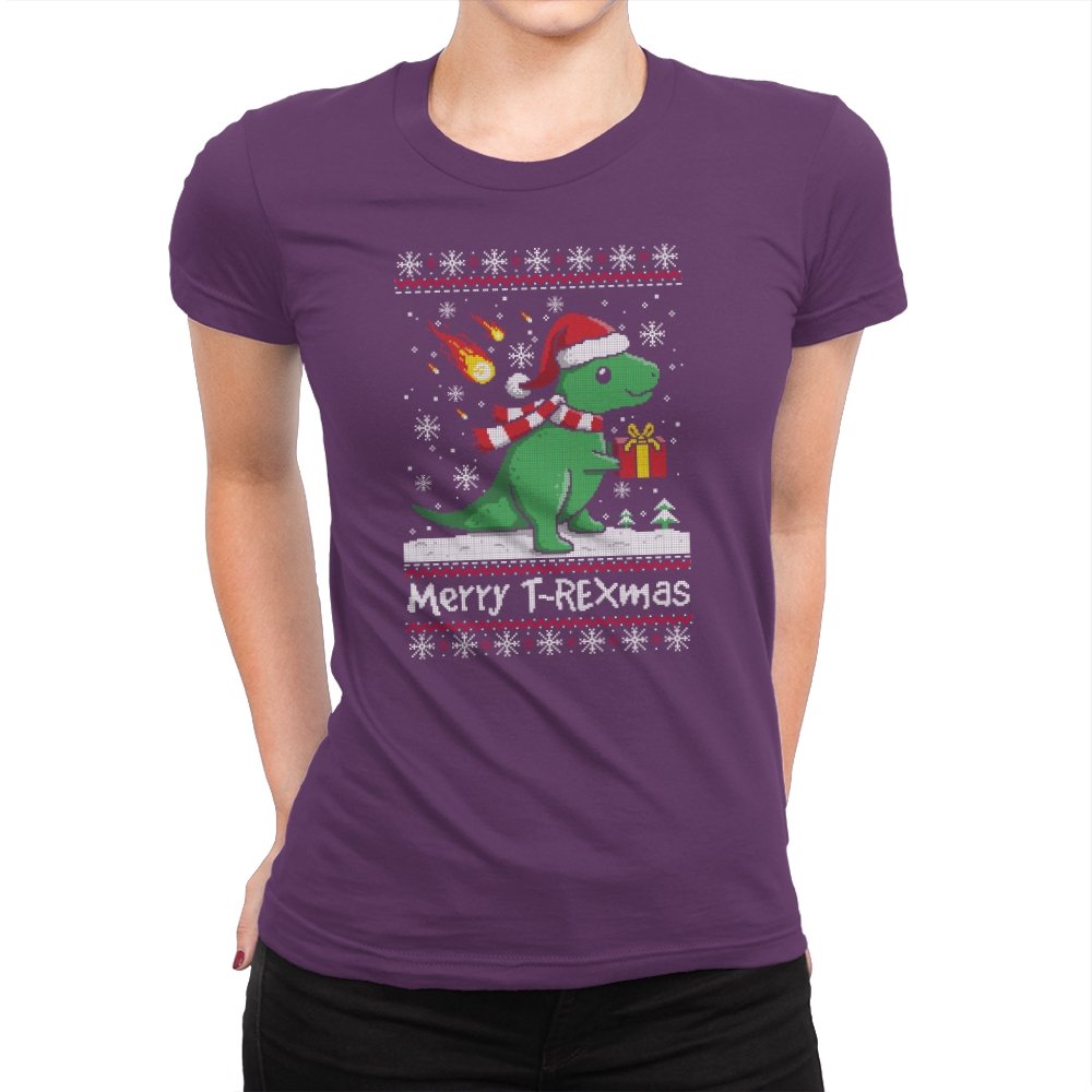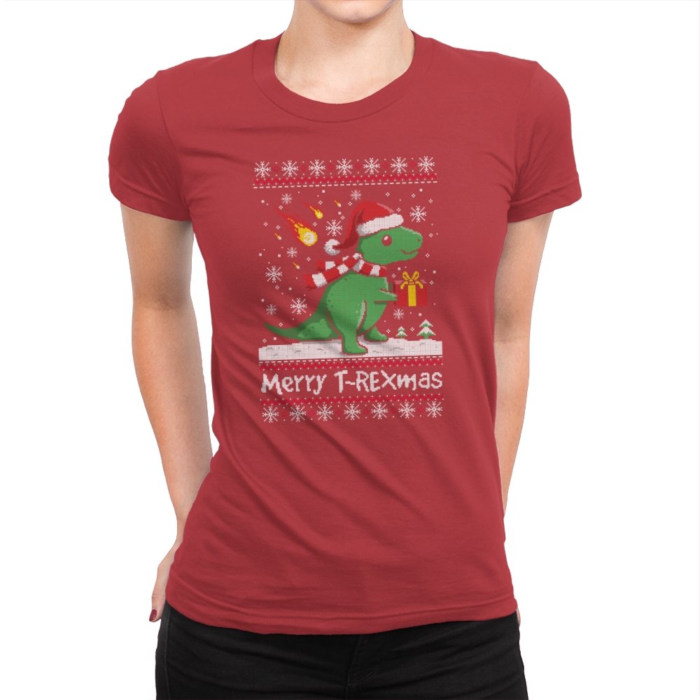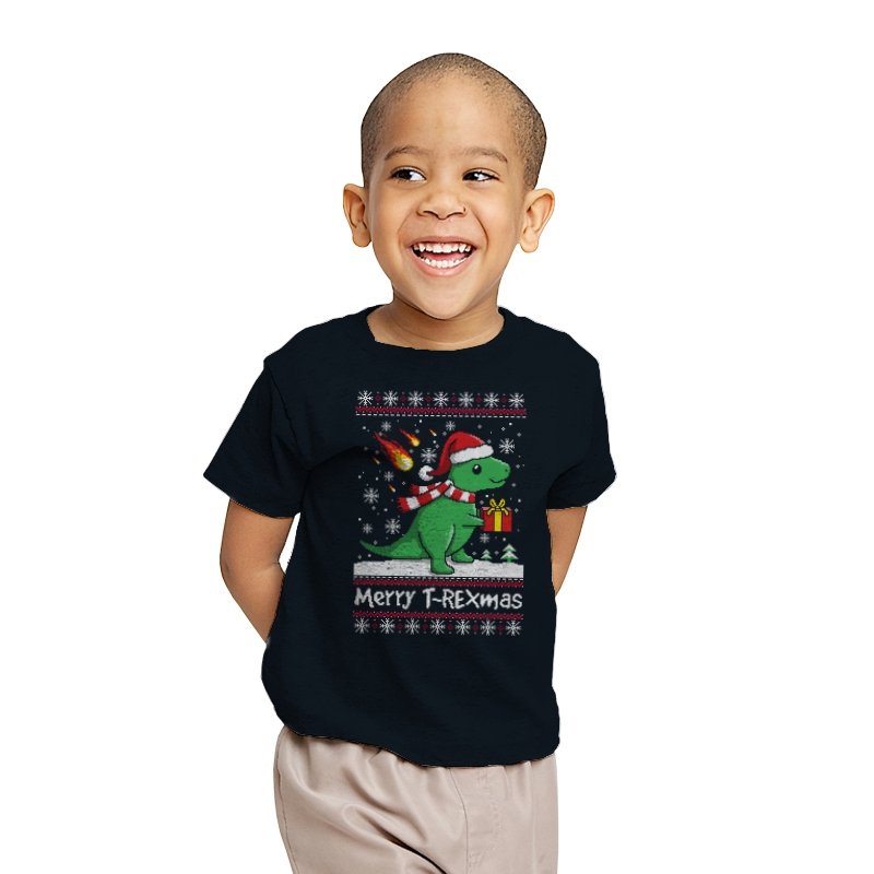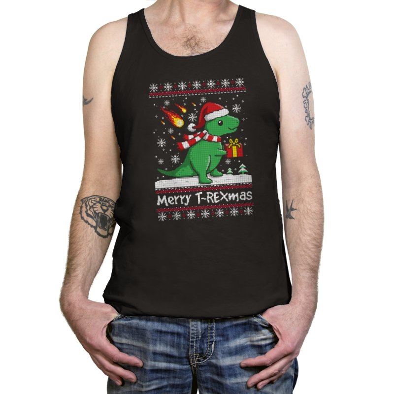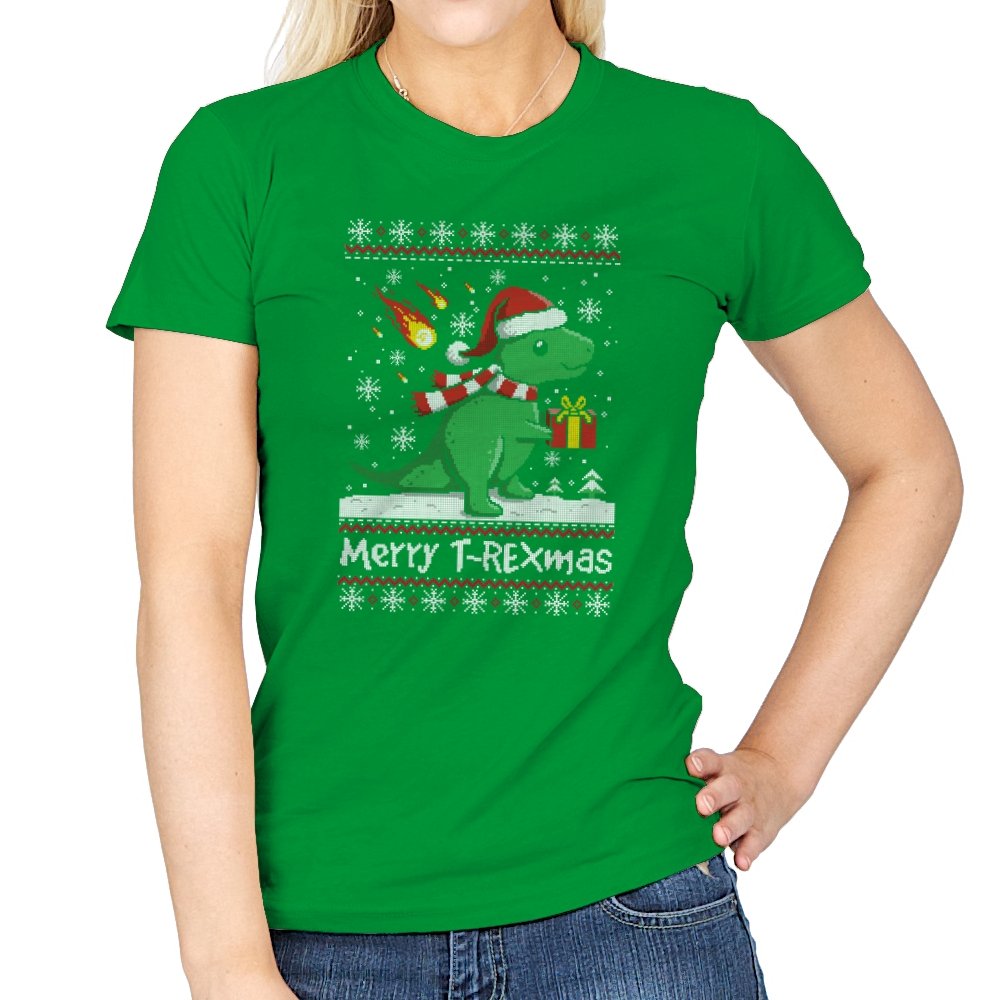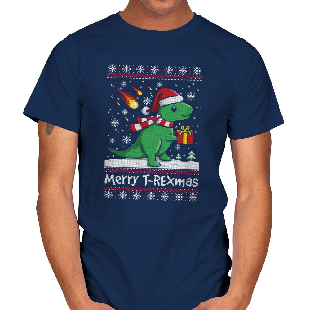 This ugly holiday design mixes prehistoric chaos with cheerful seasonal denial. The pixel-knit style frames a bright green dinosaur in a Santa hat, scarf blowing back, clutching a gift like nothing could possibly go wrong. Snowflakes fall, the sweater pattern stays classic, and the tiny fireball detail adds a quiet reminder that extinction-level energy never really takes a holiday. It feels playful, absurd, and perfectly self-aware.
