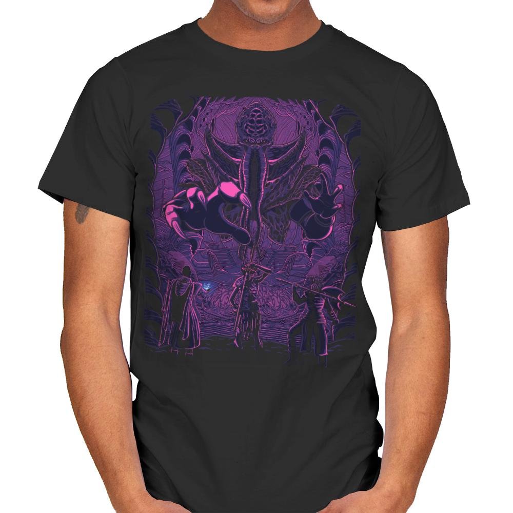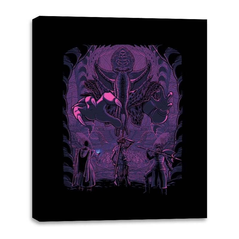 This design drops you into a ritual chamber where a towering psychic entity looms over a group of spellcasters mid invocation. The composition leans hard into classic tabletop fantasy art, with glowing purples, organic architecture, and an unsettling sense of scale. Everything about it suggests forbidden knowledge, failed saving throws, and a dungeon map that should have been taken more seriously. Fans who get it will recognize the moment right before things go catastrophically wrong.
