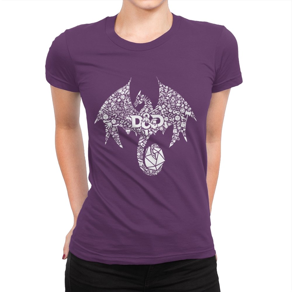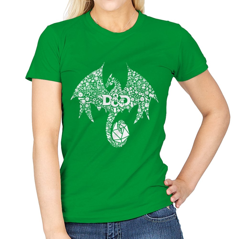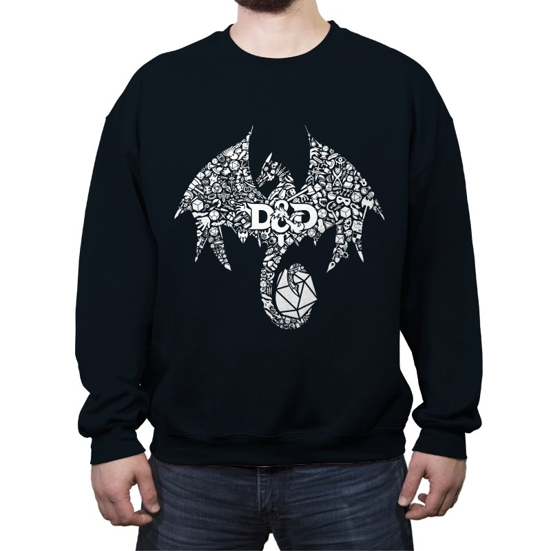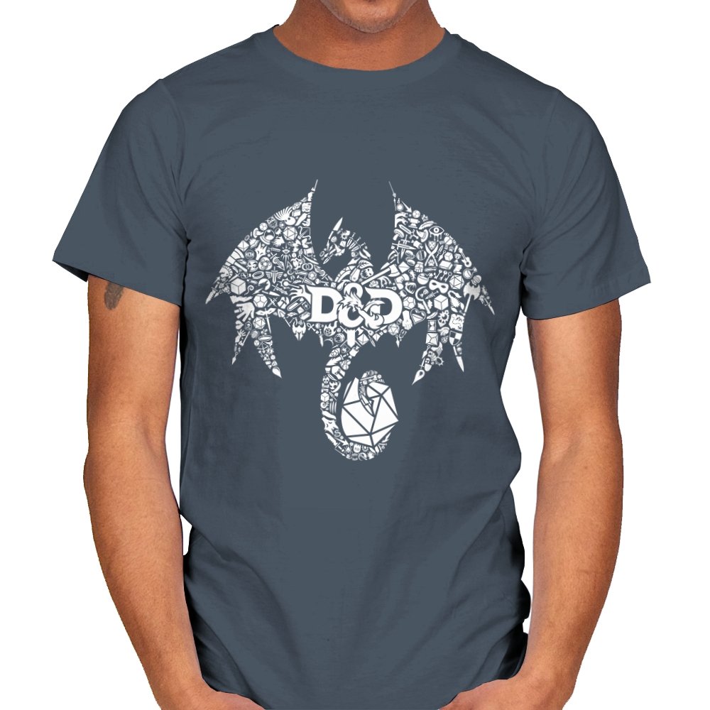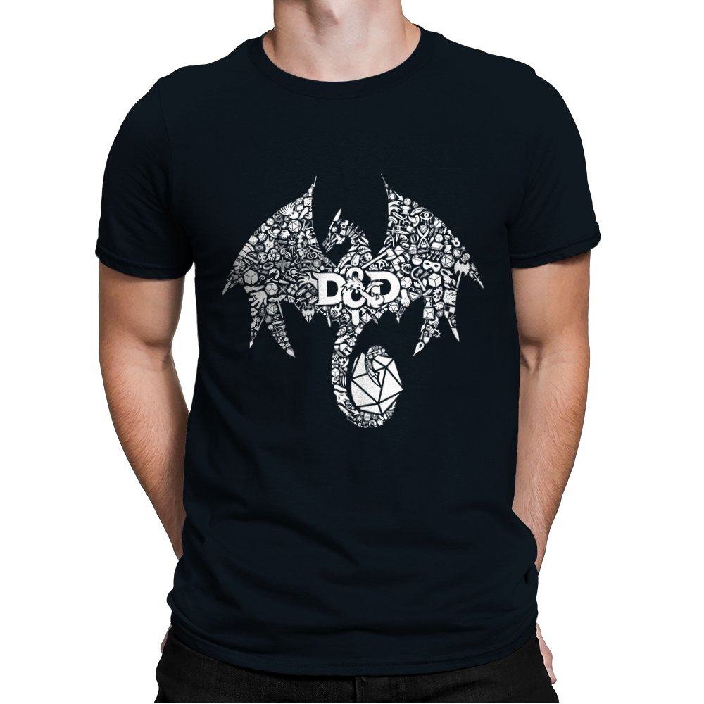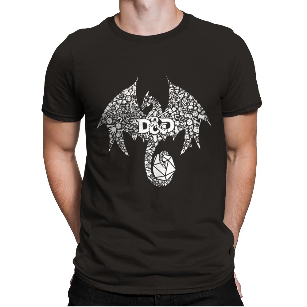 The design assembles a familiar fantasy emblem out of hundreds of tiny symbols, objects, and references layered into a single silhouette. At a distance it reads as a bold dragon shape, wings spread and tail coiled, but up close the form breaks into dice, weapons, monsters, and icons pulled from tabletop lore. The central lettering anchors the chaos, treating the emblem like a banner rather than a logo. It feels less illustrated and more constructed, as if the world itself formed the creature.