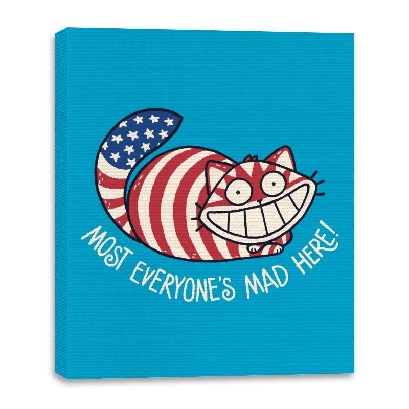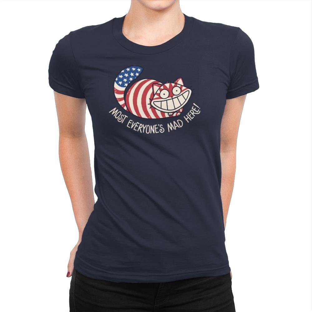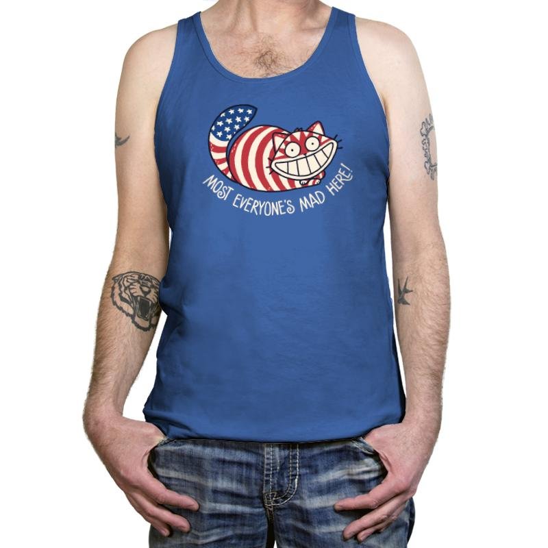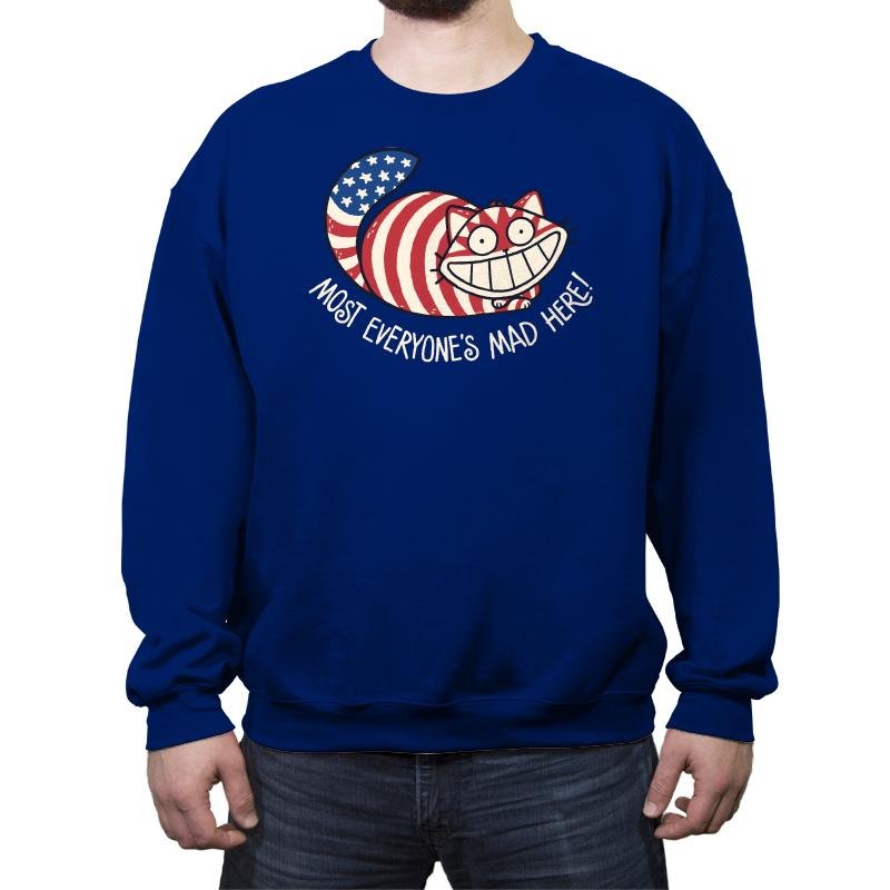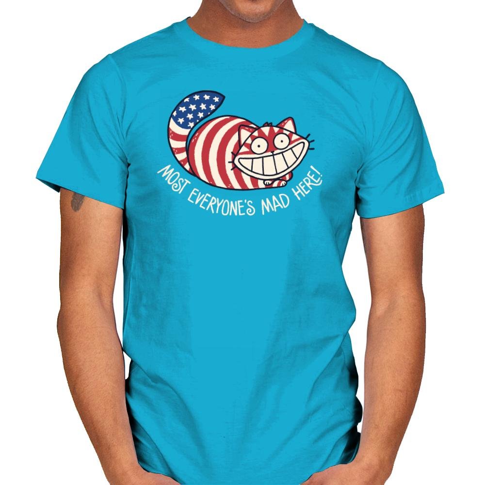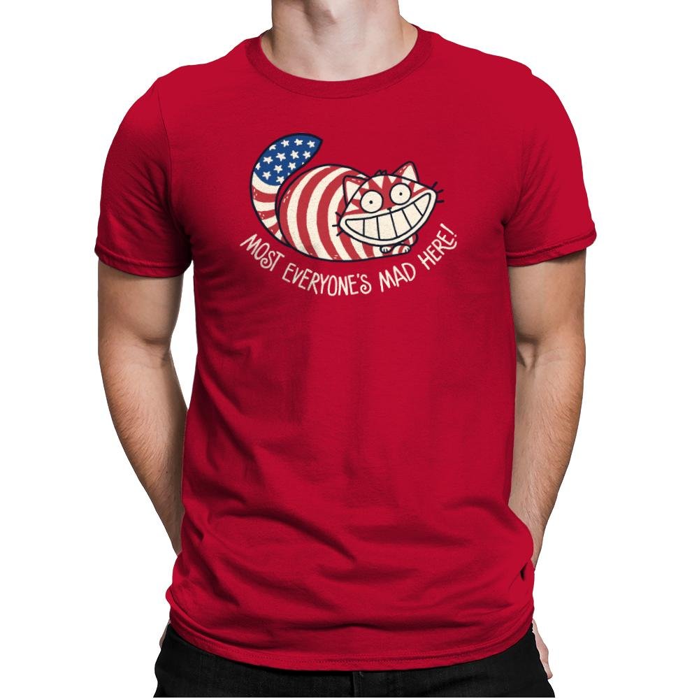 This design mashes together patriotic symbolism and classic grinning absurdity into something knowingly unhinged. A wide-eyed cat stretches across the frame, wrapped in stars and stripes, smiling with the kind of confidence that suggests everything is fine and nothing is. The phrase underneath leans into the joke, blending cultural satire with a wink toward controlled chaos. It feels playful, slightly unsettling, and very intentional.