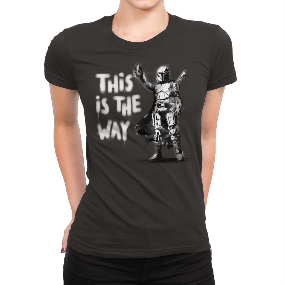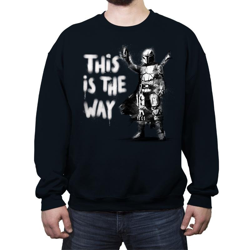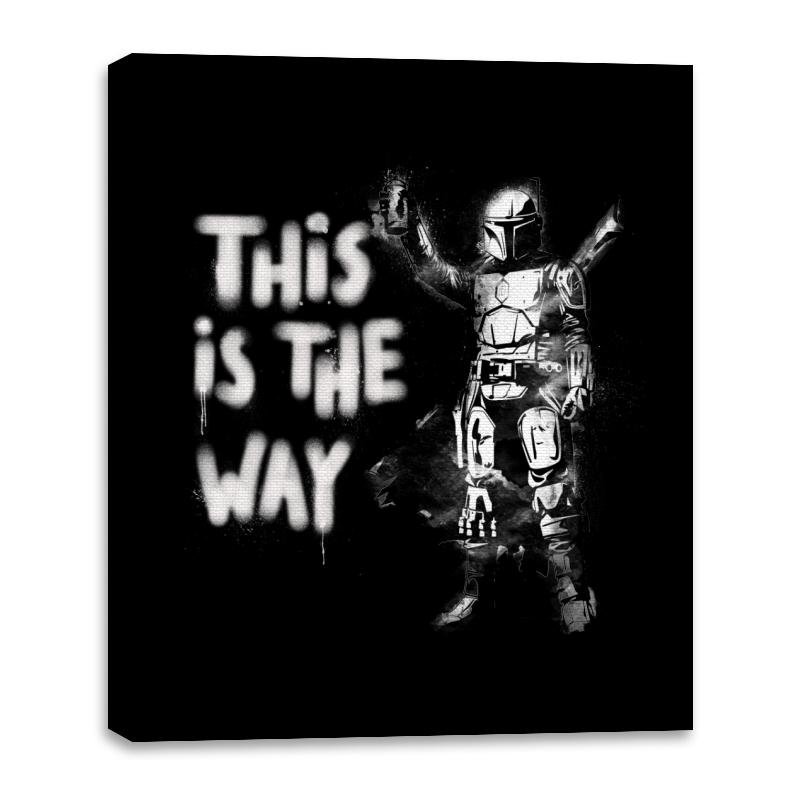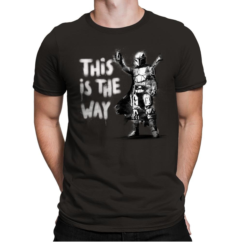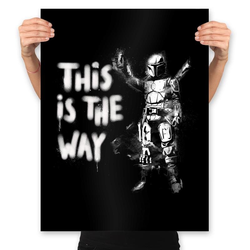 The My Way design features a bold and iconic character, standing confidently with the unmistakable phrase “This is the Way” spray-painted in graffiti style. The figure is clad in armor, ready for action and radiating a sense of purpose and determination. The minimalist black-and-white design captures the essence of the character’s journey, invoking the spirit of resilience and commitment to a personal code.