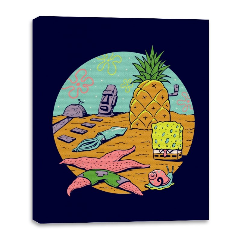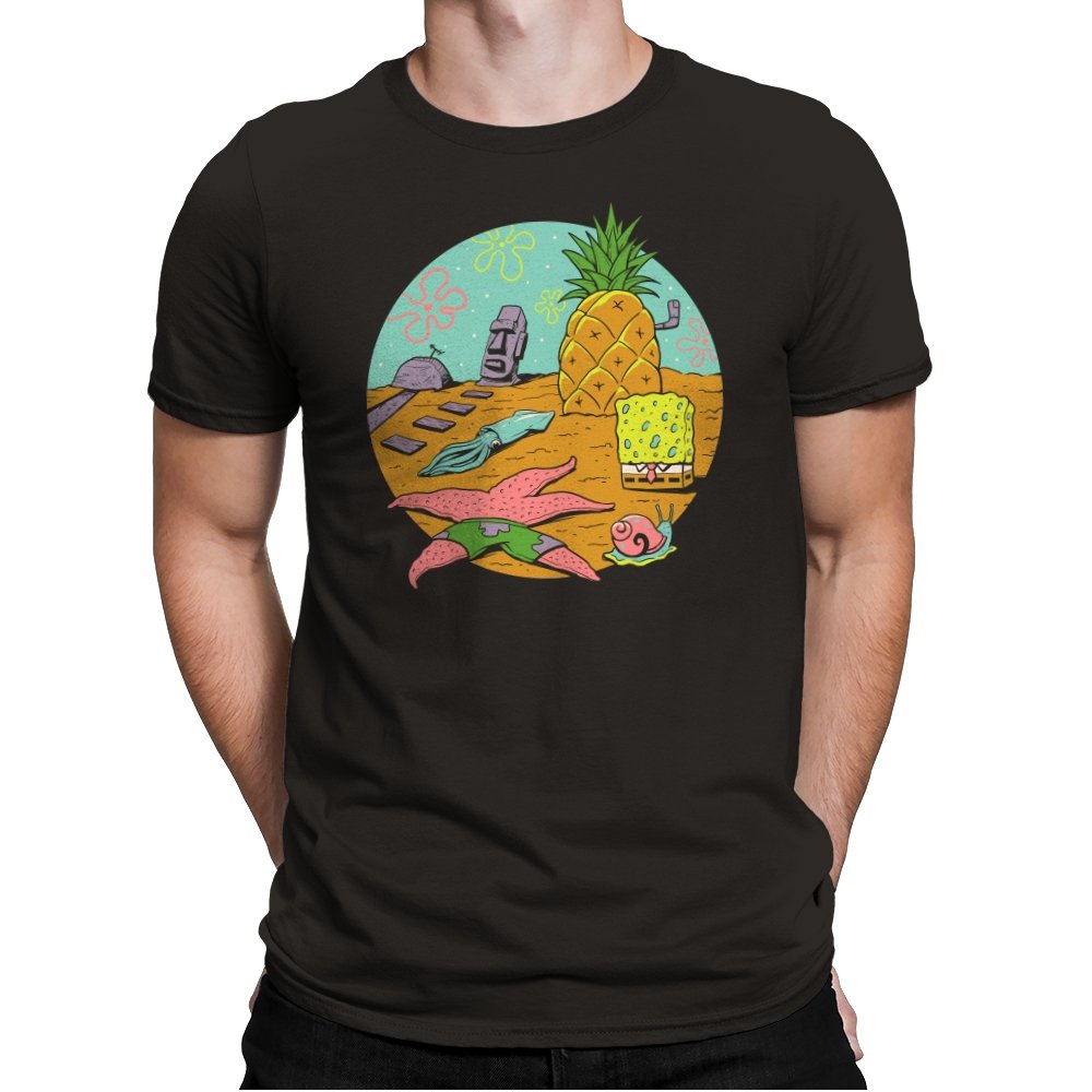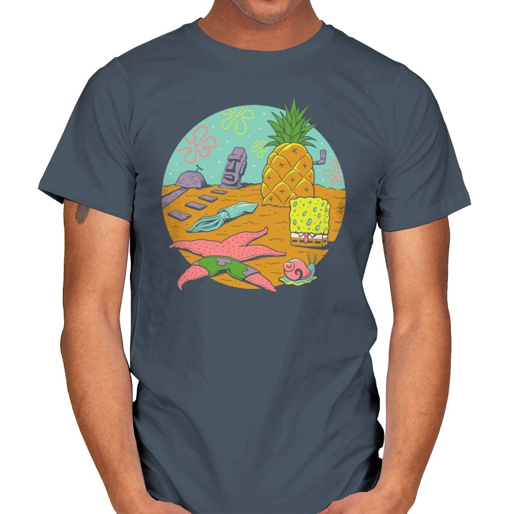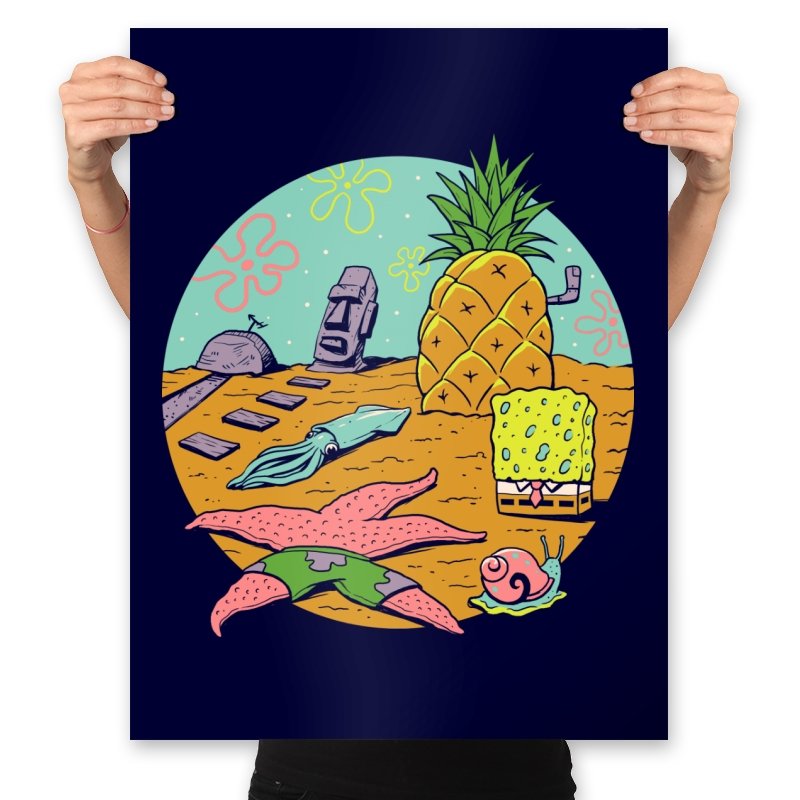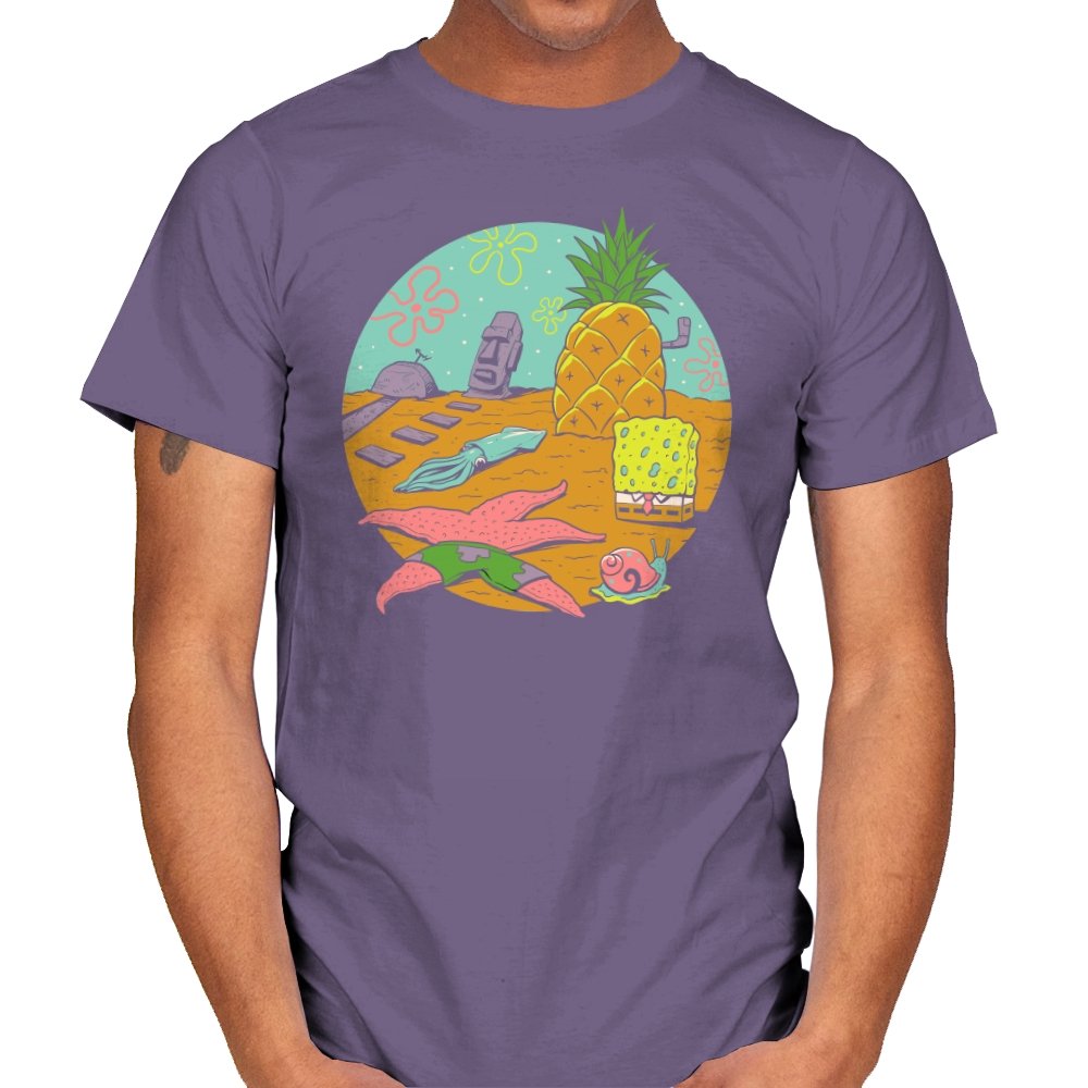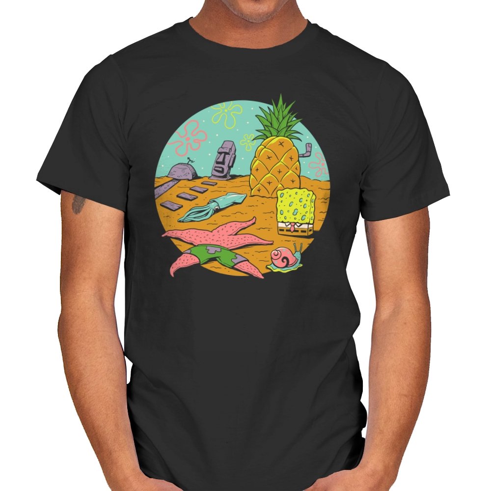 The design drops you into an underwater neighborhood rendered like a cheerful postcard from a very strange place. A pineapple house anchors the scene, surrounded by familiar landmarks, winding paths, and pastel sea life arranged inside a clean circular frame. Bright colors and simplified shapes keep it playful, while the offbeat geography hints at the logic of a world that never quite follows rules. Fans recognize the setting immediately without needing a single label.