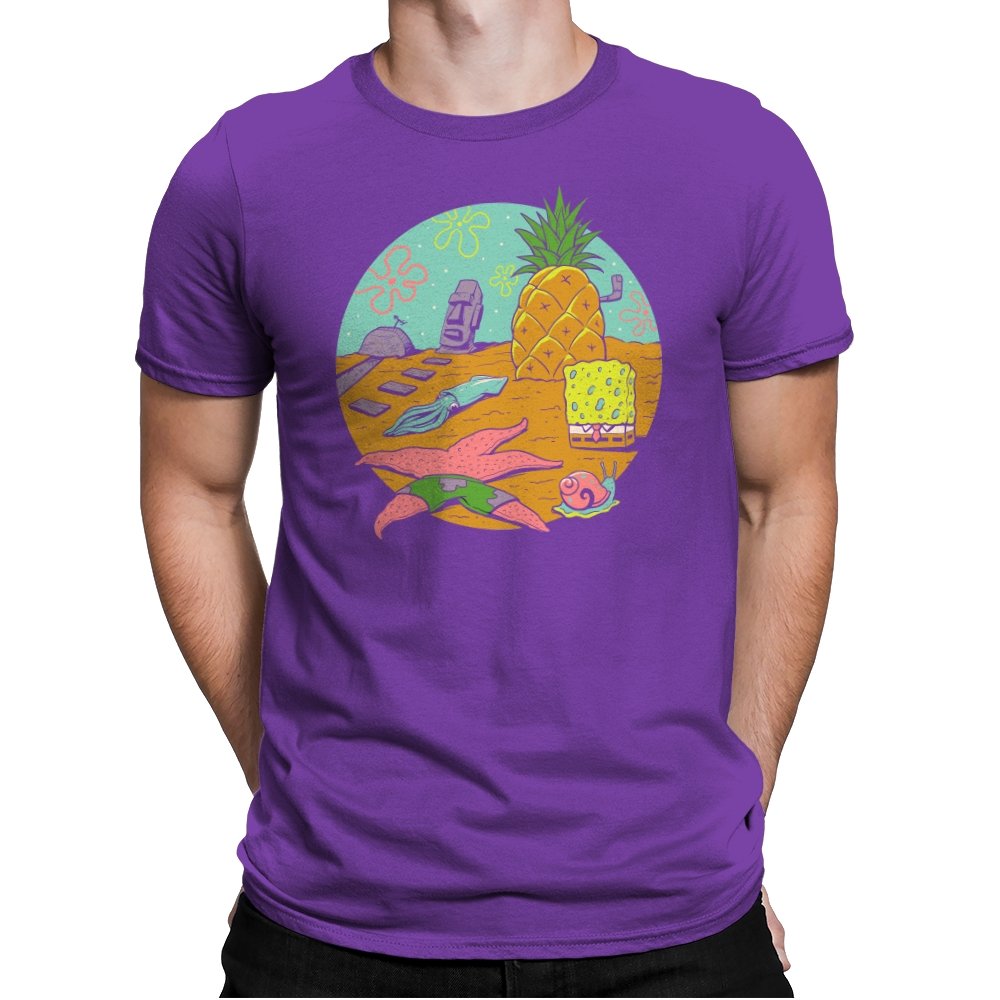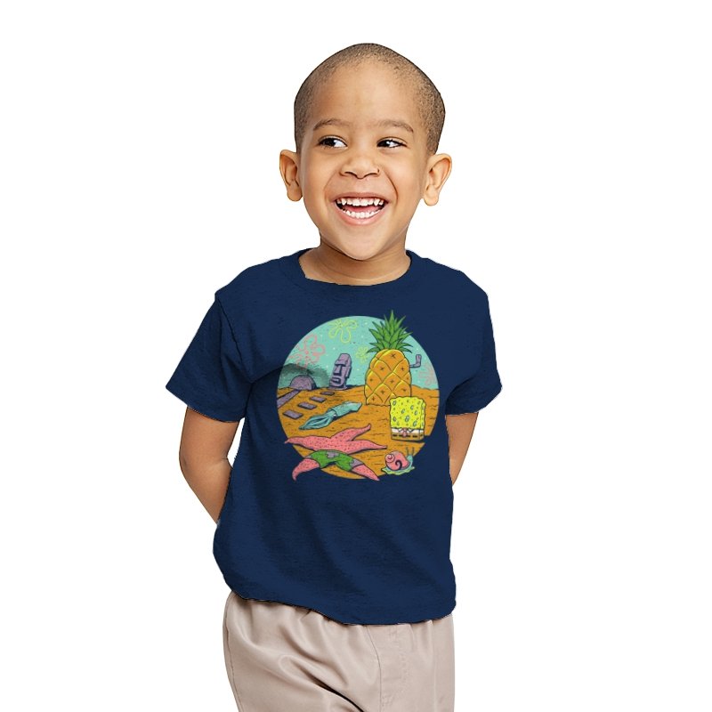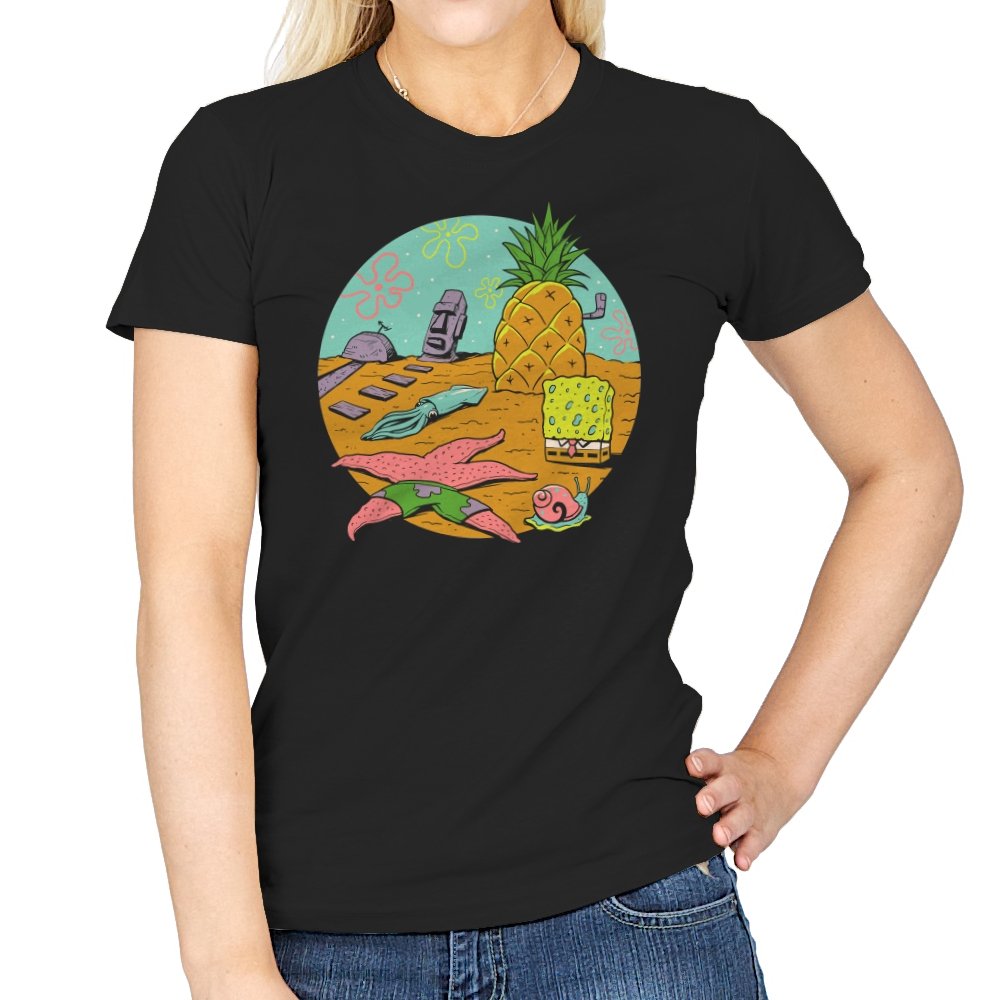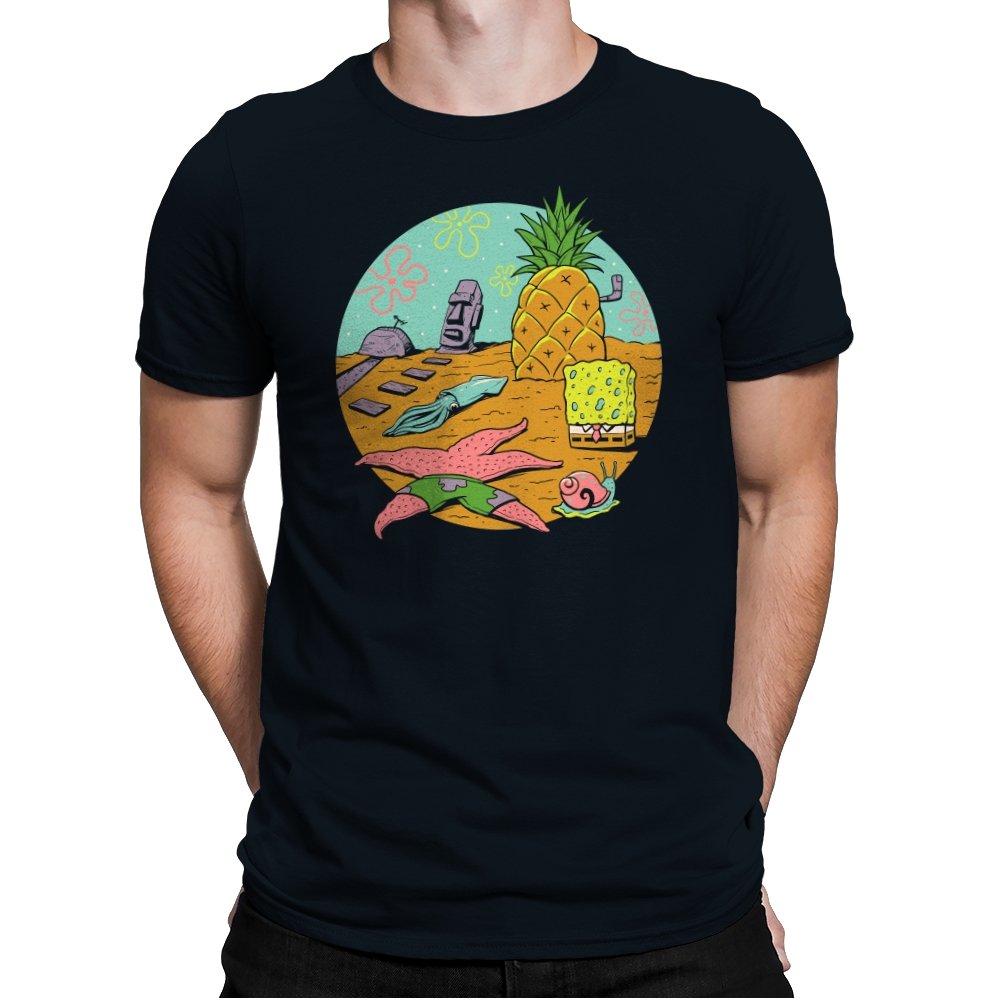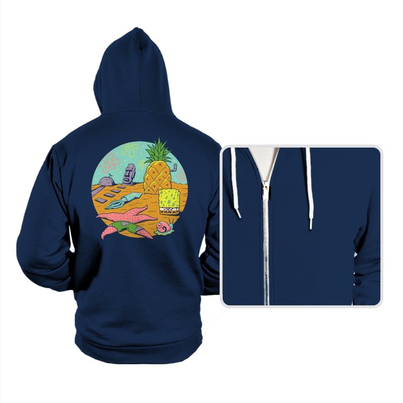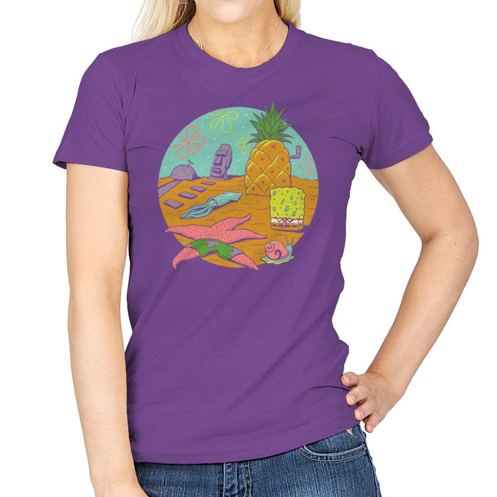The design drops you into an underwater neighborhood rendered like a cheerful postcard from a very strange place. A pineapple house anchors the scene, surrounded by familiar landmarks, winding paths, and pastel sea life arranged inside a clean circular frame. Bright colors and simplified shapes keep it playful, while the offbeat geography hints at the logic of a world that never quite follows rules. Fans recognize the setting immediately without needing a single label.