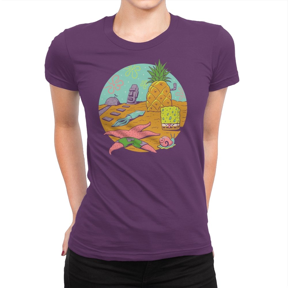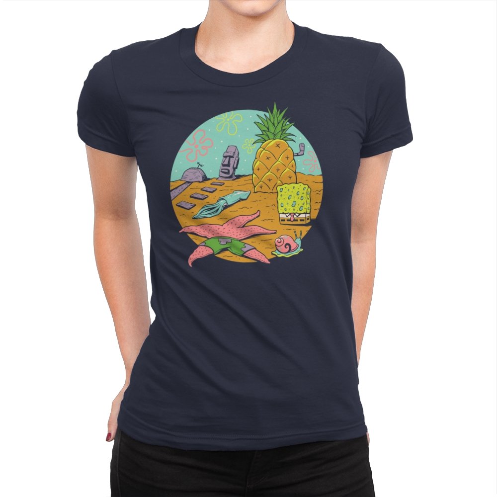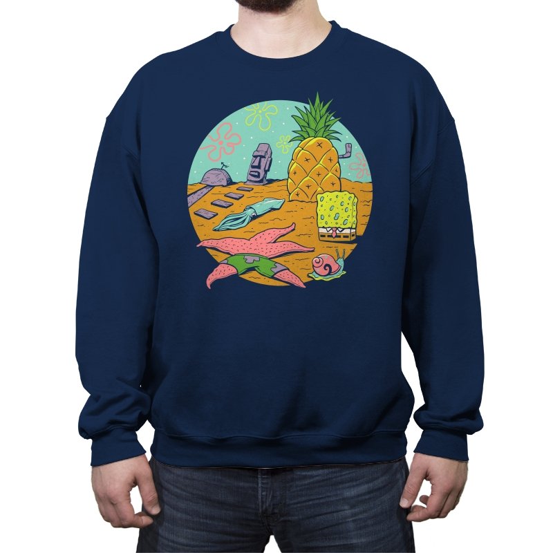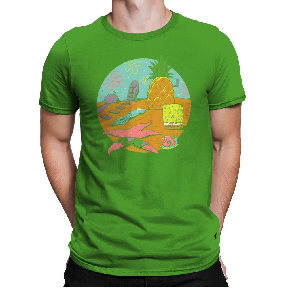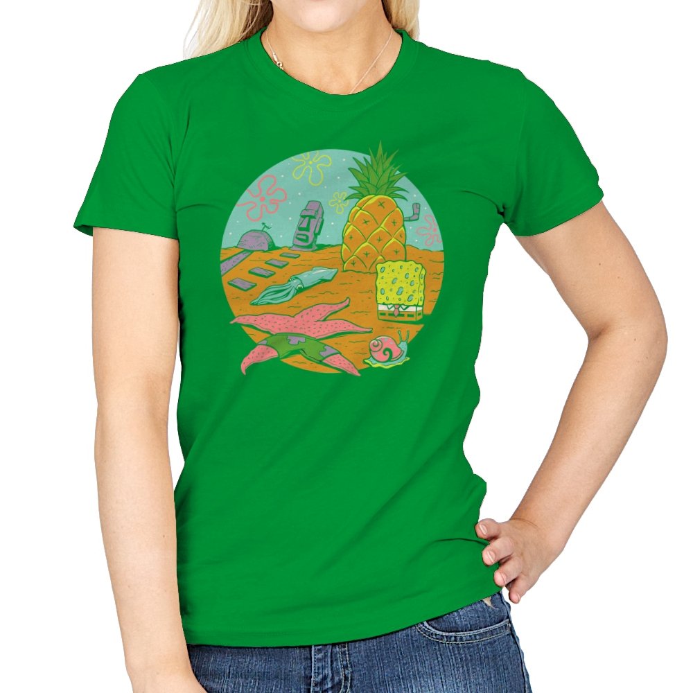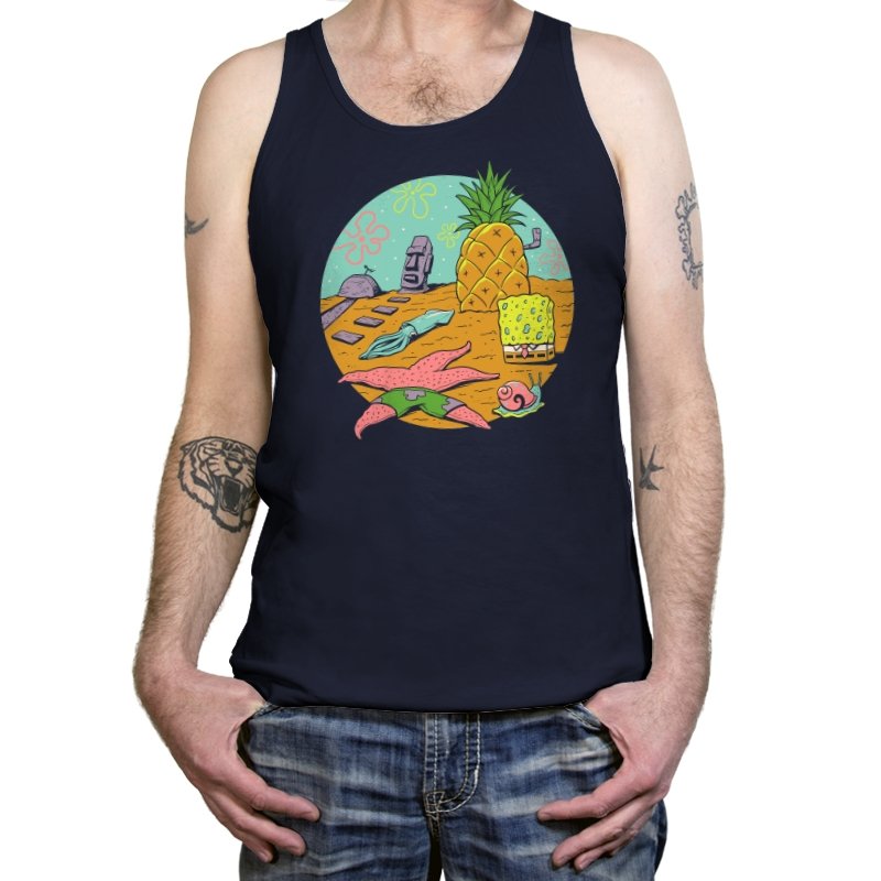 The design drops you into an underwater neighborhood rendered like a cheerful postcard from a very strange place. A pineapple house anchors the scene, surrounded by familiar landmarks, winding paths, and pastel sea life arranged inside a clean circular frame. Bright colors and simplified shapes keep it playful, while the offbeat geography hints at the logic of a world that never quite follows rules. Fans recognize the setting immediately without needing a single label.