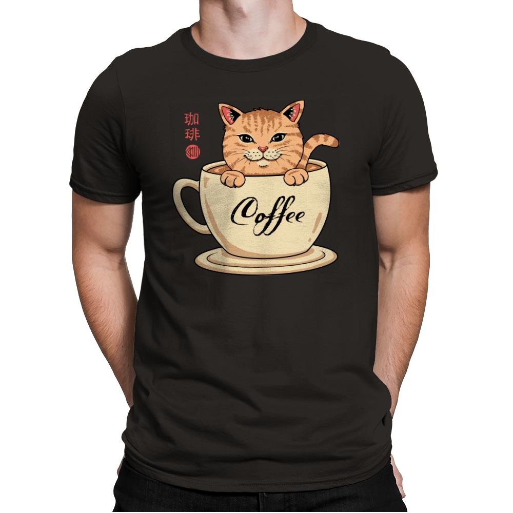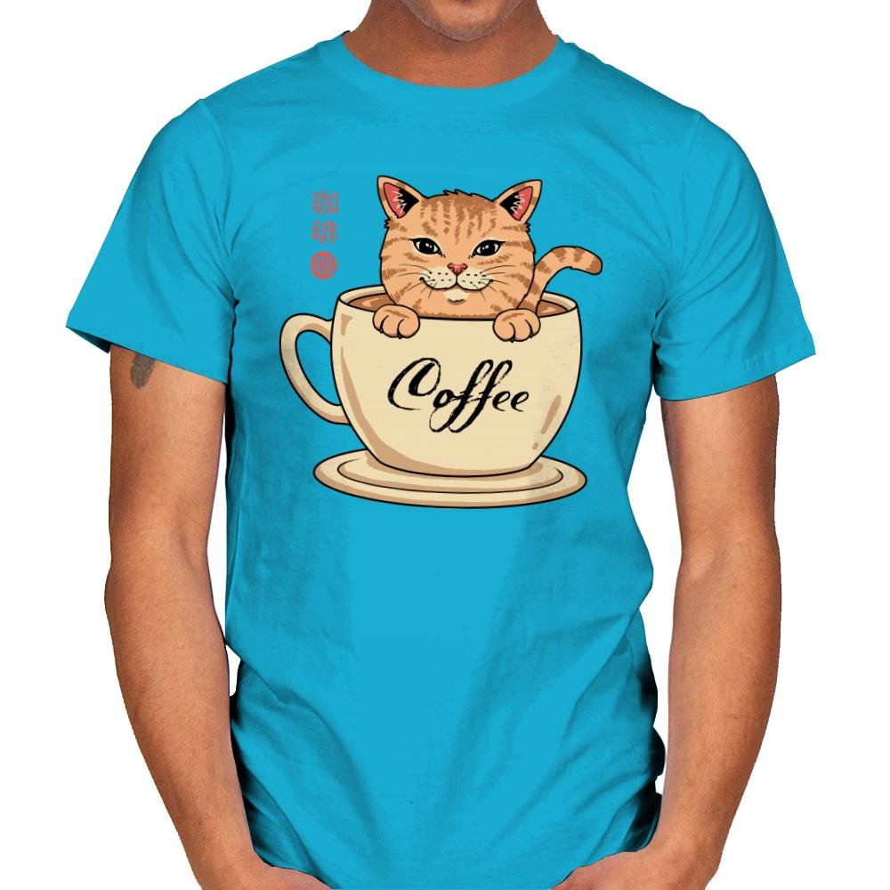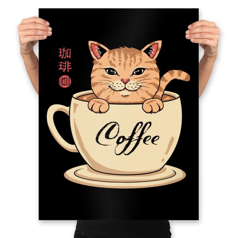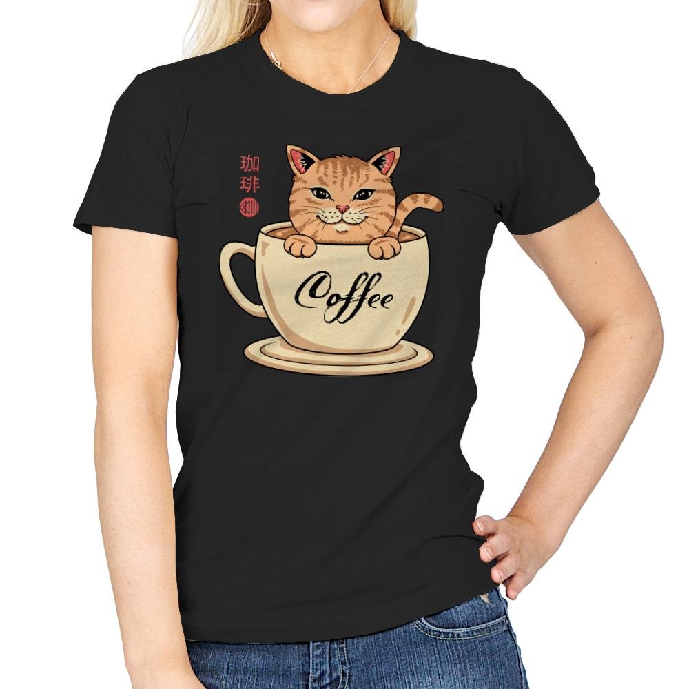 This design blends a warm cup of coffee with an equally warm tabby cat, turning morning caffeine into a cozy mascot. The cat sits inside the mug as if it were a personal hot spring, paws draped over the rim and tail curling with smug contentment. Script that reads “Coffee” along the cup and stylized characters on the side add a gentle nod to café culture and Japanese cat charm. It is a visual inside joke for anyone whose day doesn’t really start until after their first pour.