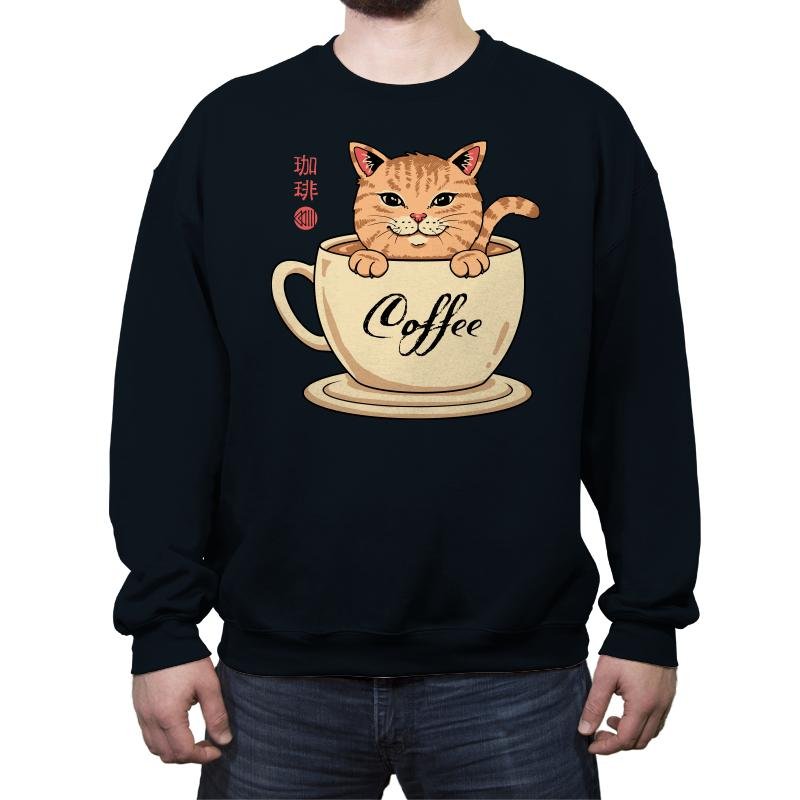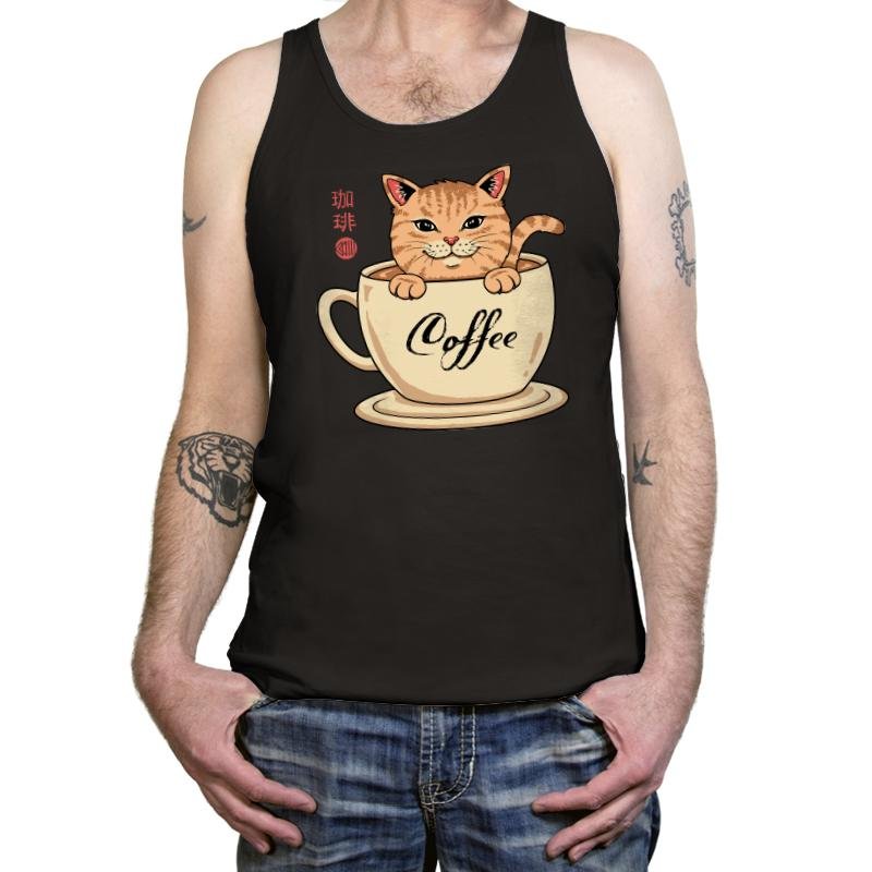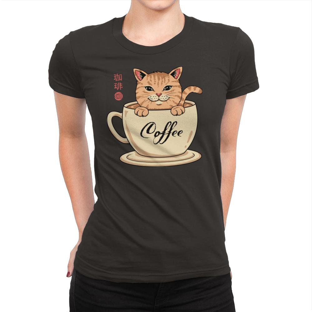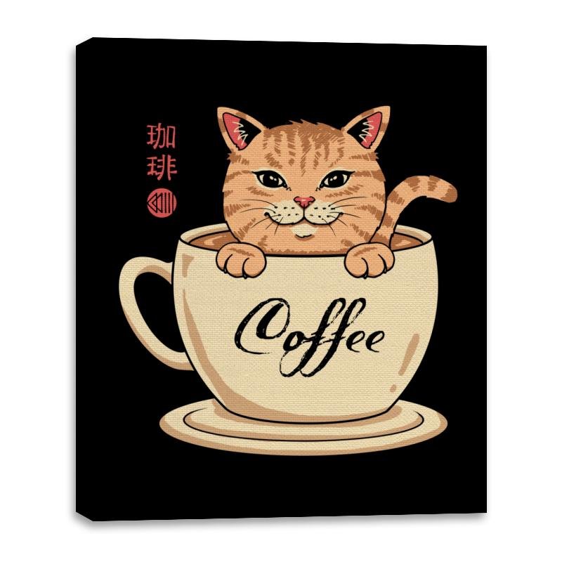 This design blends a warm cup of coffee with an equally warm tabby cat, turning morning caffeine into a cozy mascot. The cat sits inside the mug as if it were a personal hot spring, paws draped over the rim and tail curling with smug contentment. Script that reads “Coffee” along the cup and stylized characters on the side add a gentle nod to café culture and Japanese cat charm. It is a visual inside joke for anyone whose day doesn’t really start until after their first pour.