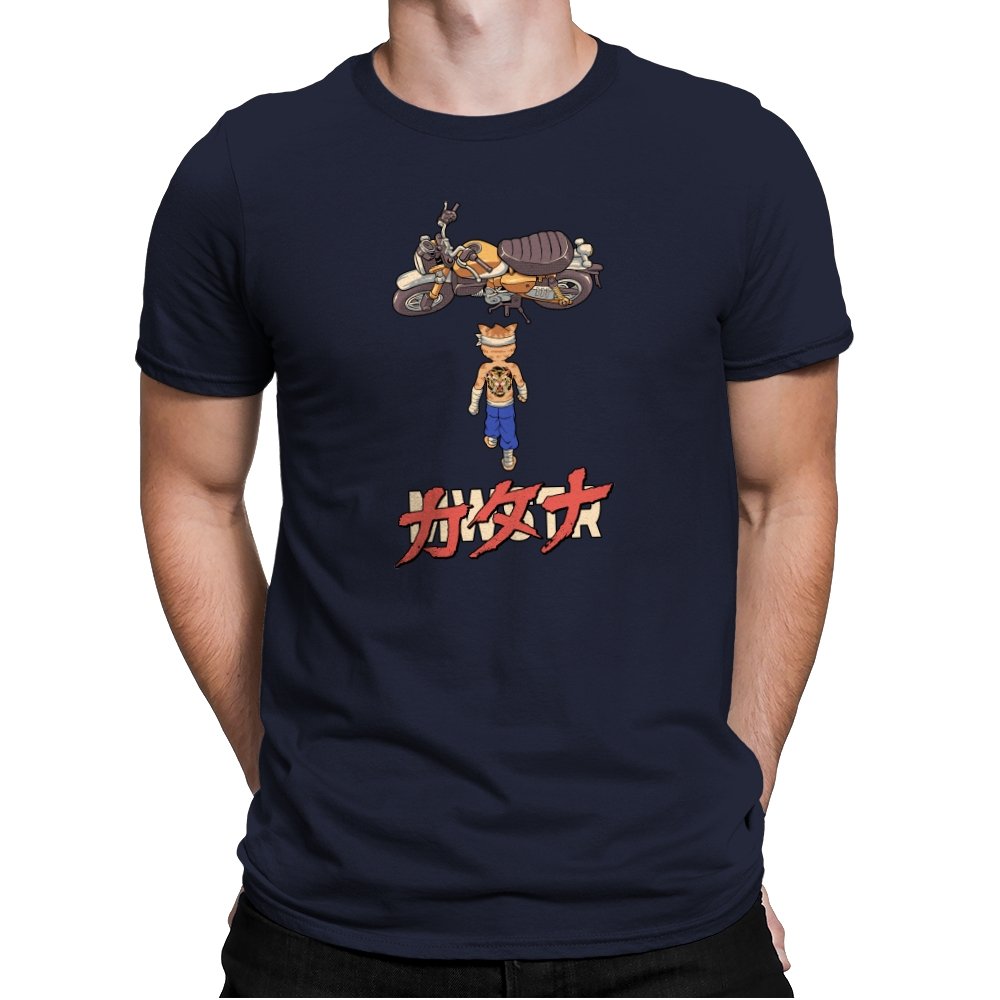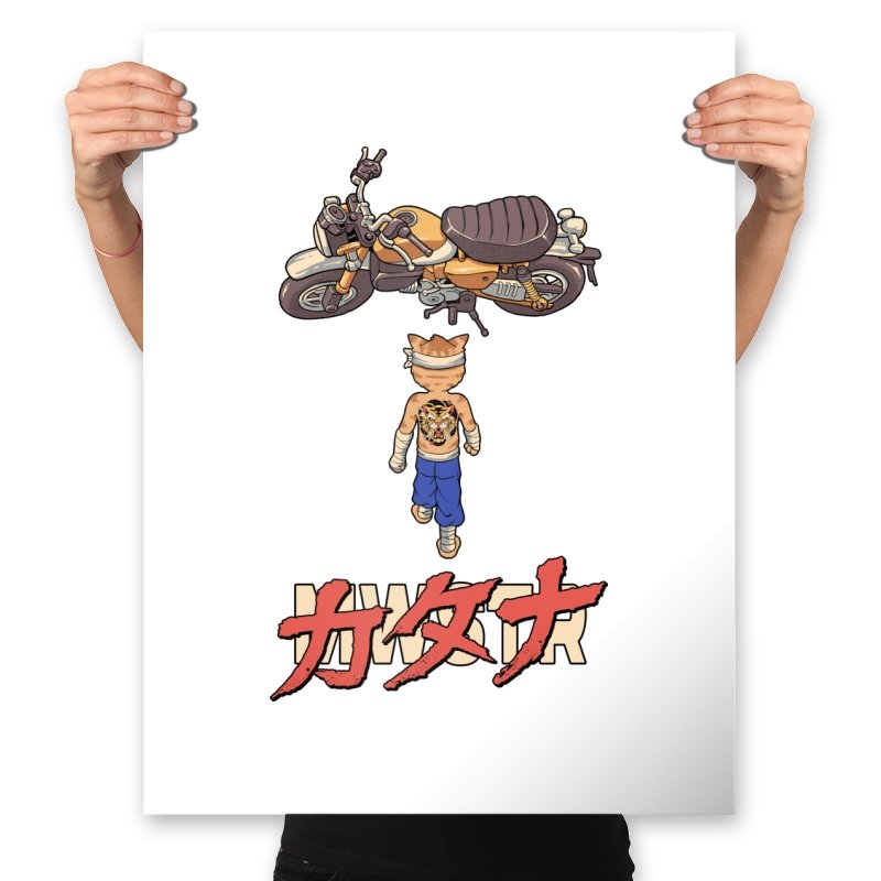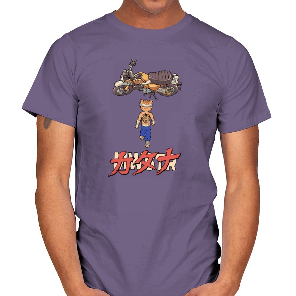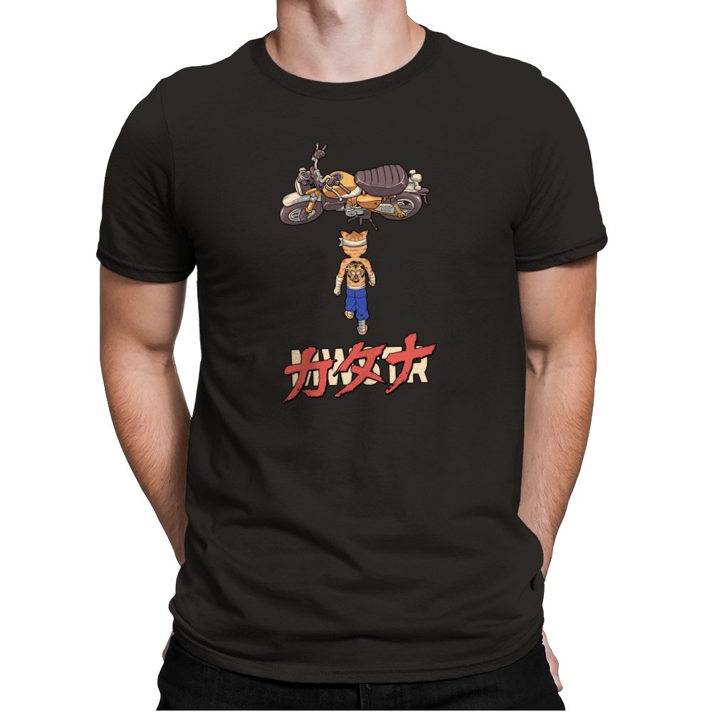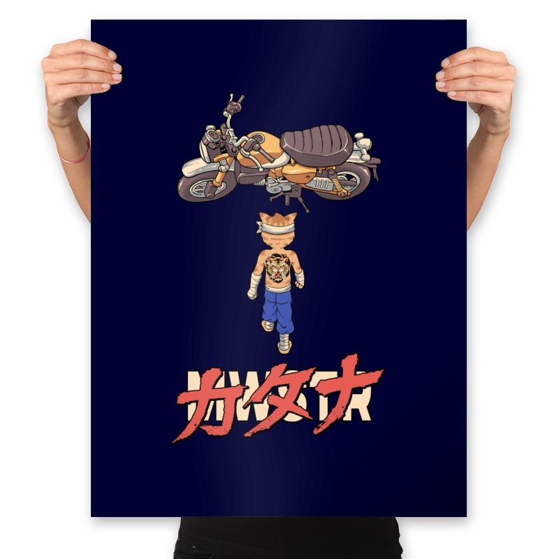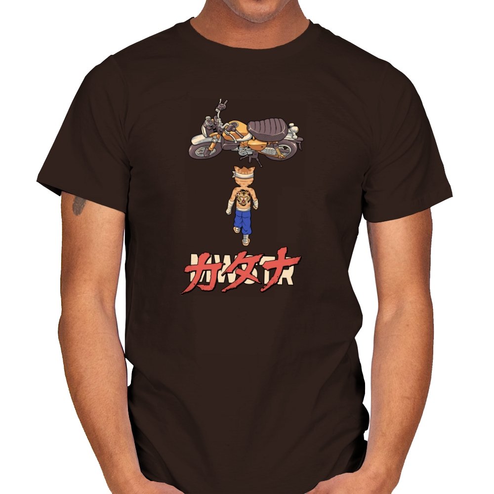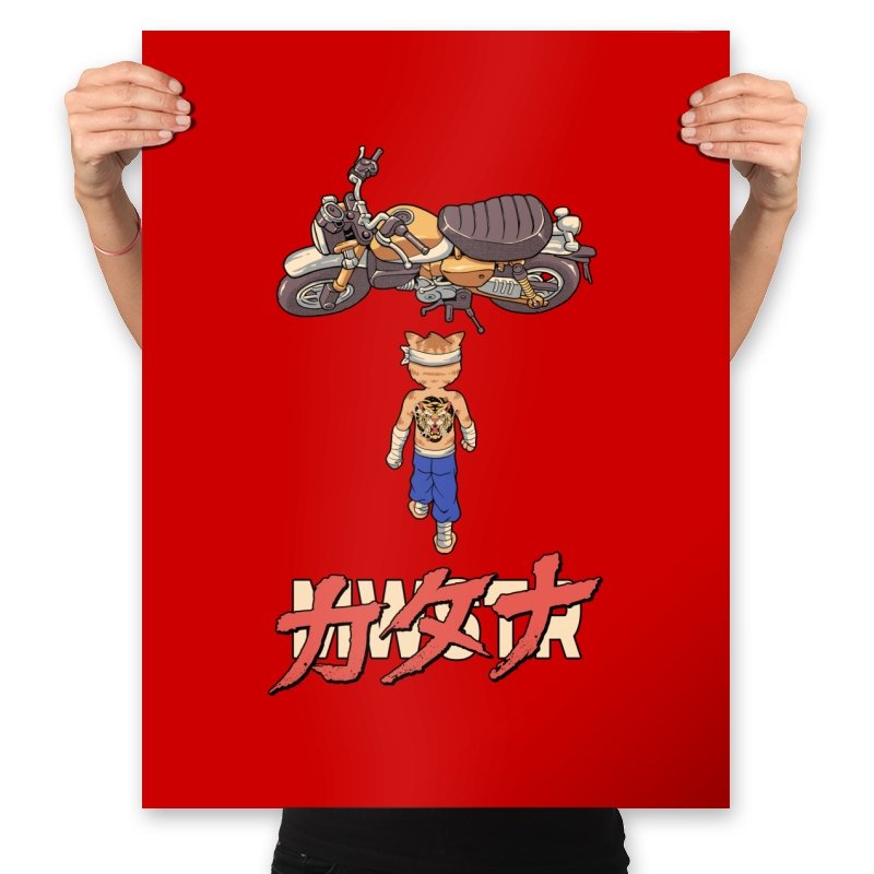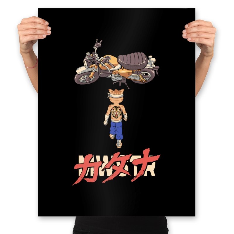 This design drops a tiny martial artist into one of the most famous bike shots in animation history. Instead of a futuristic red machine, he approaches a classic cafe racer with bandaged fists and a full back tattoo. The overhead framing, stride, and typography make the homage clear without using any names. Fans recognize the fusion of cyberpunk attitude and martial arts stubbornness immediately.