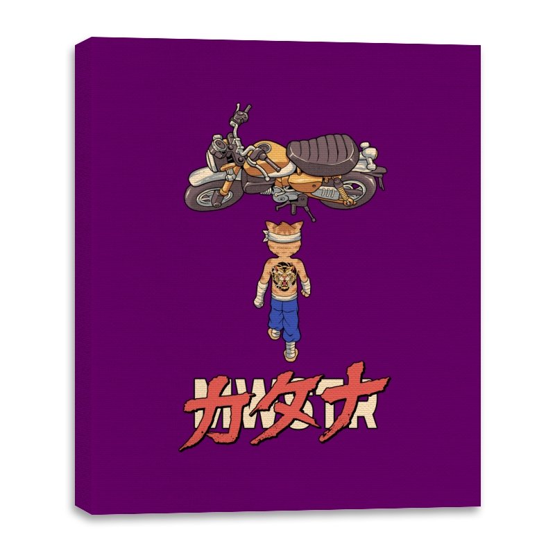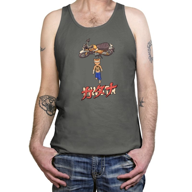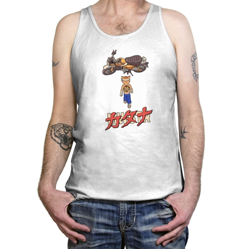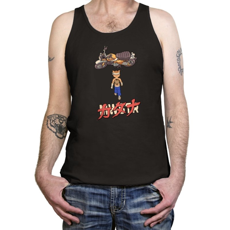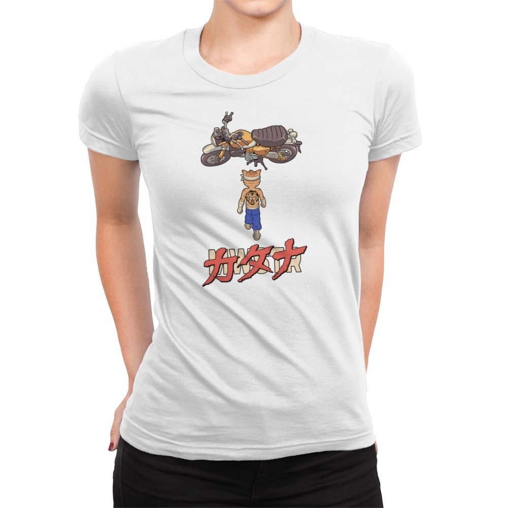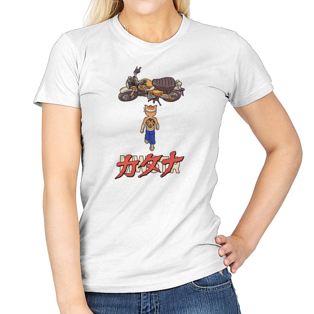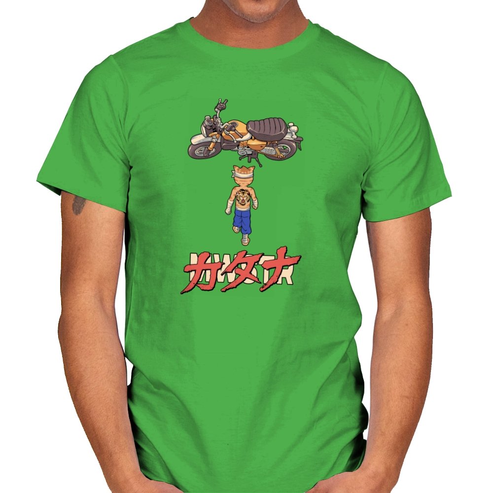 This design drops a tiny martial artist into one of the most famous bike shots in animation history. Instead of a futuristic red machine, he approaches a classic cafe racer with bandaged fists and a full back tattoo. The overhead framing, stride, and typography make the homage clear without using any names. Fans recognize the fusion of cyberpunk attitude and martial arts stubbornness immediately.