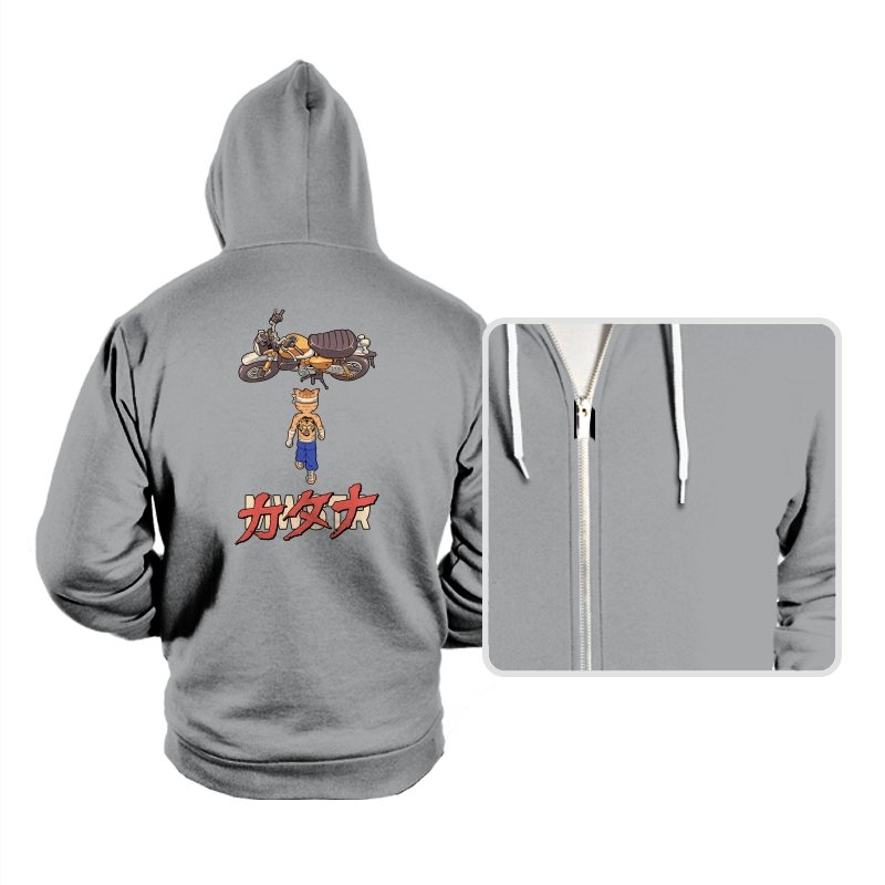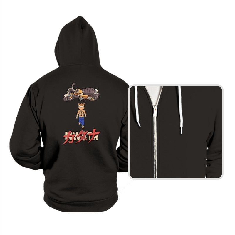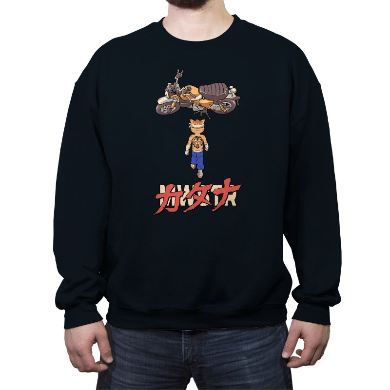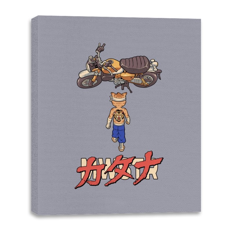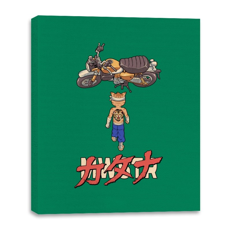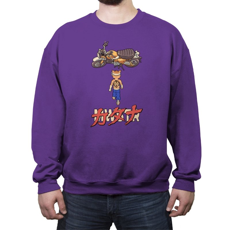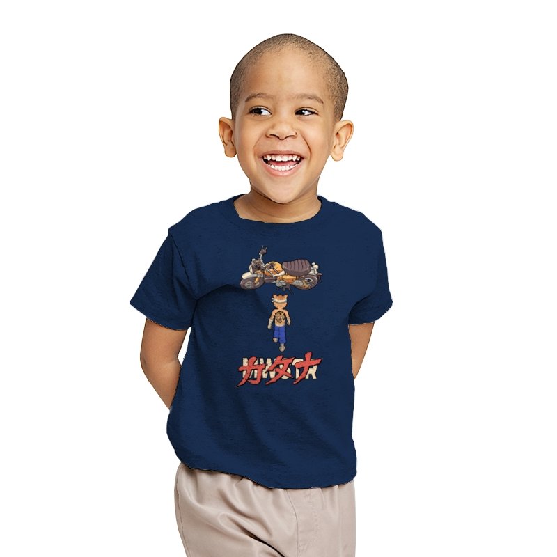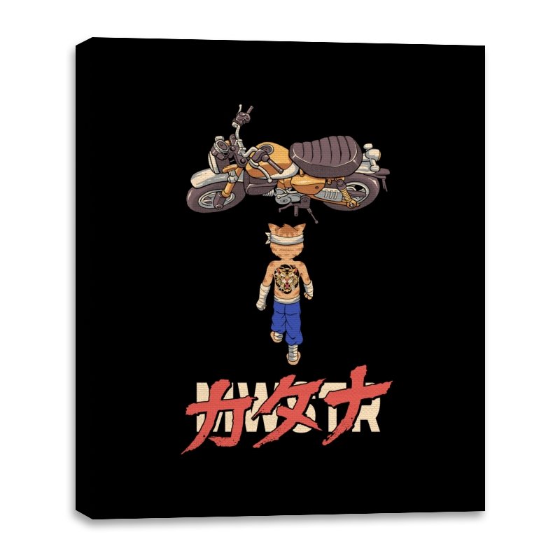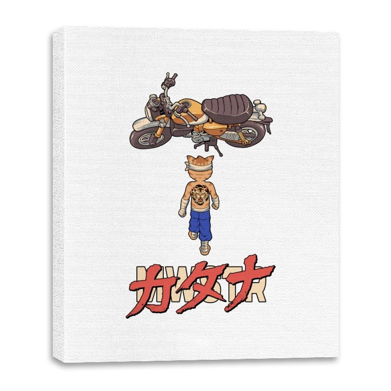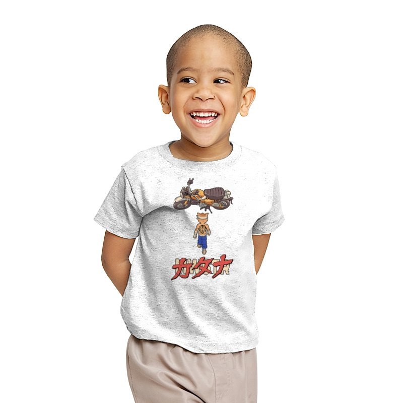 This design drops a tiny martial artist into one of the most famous bike shots in animation history. Instead of a futuristic red machine, he approaches a classic cafe racer with bandaged fists and a full back tattoo. The overhead framing, stride, and typography make the homage clear without using any names. Fans recognize the fusion of cyberpunk attitude and martial arts stubbornness immediately.