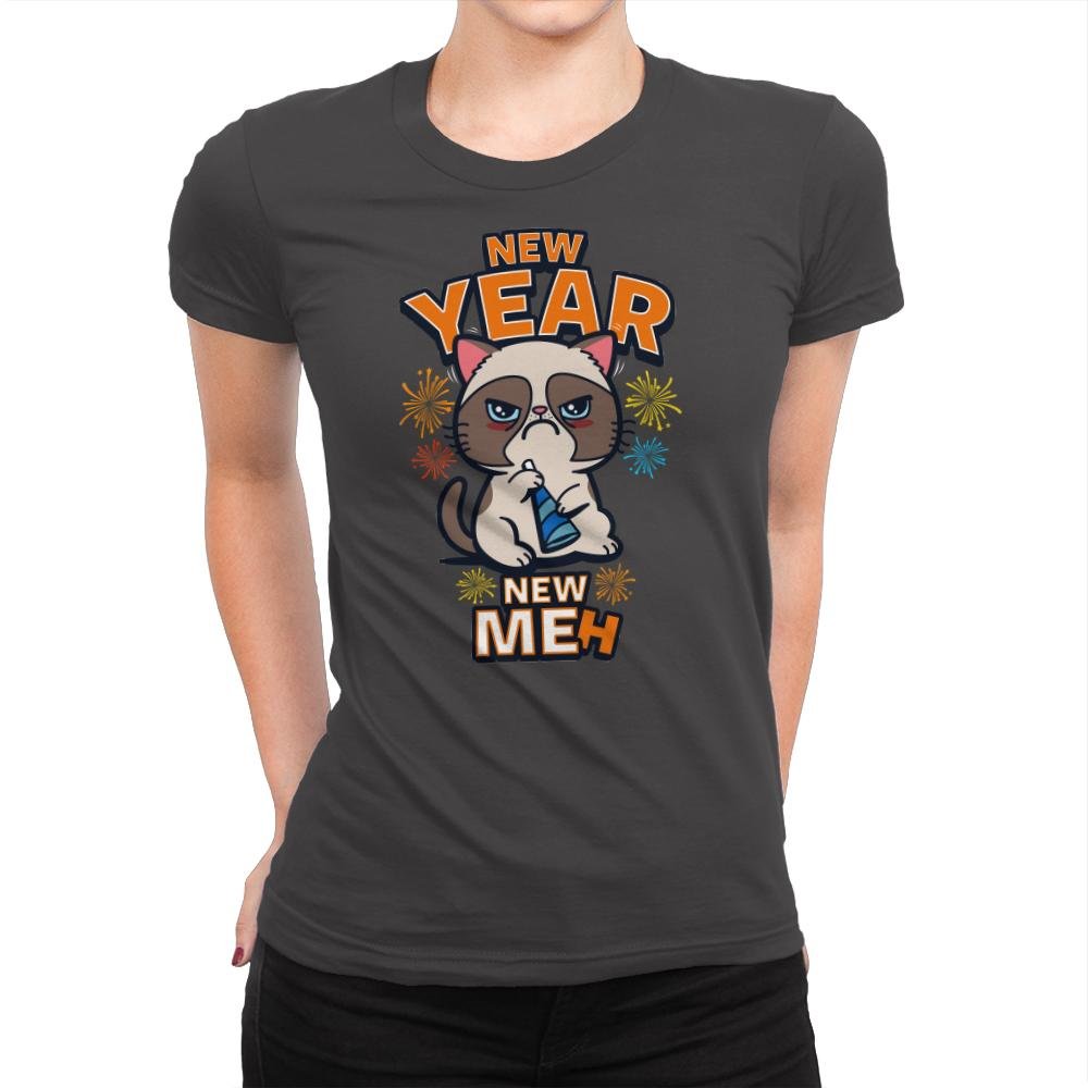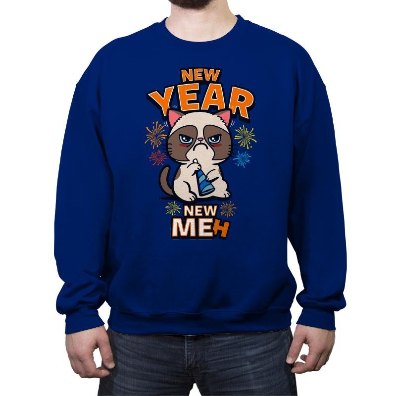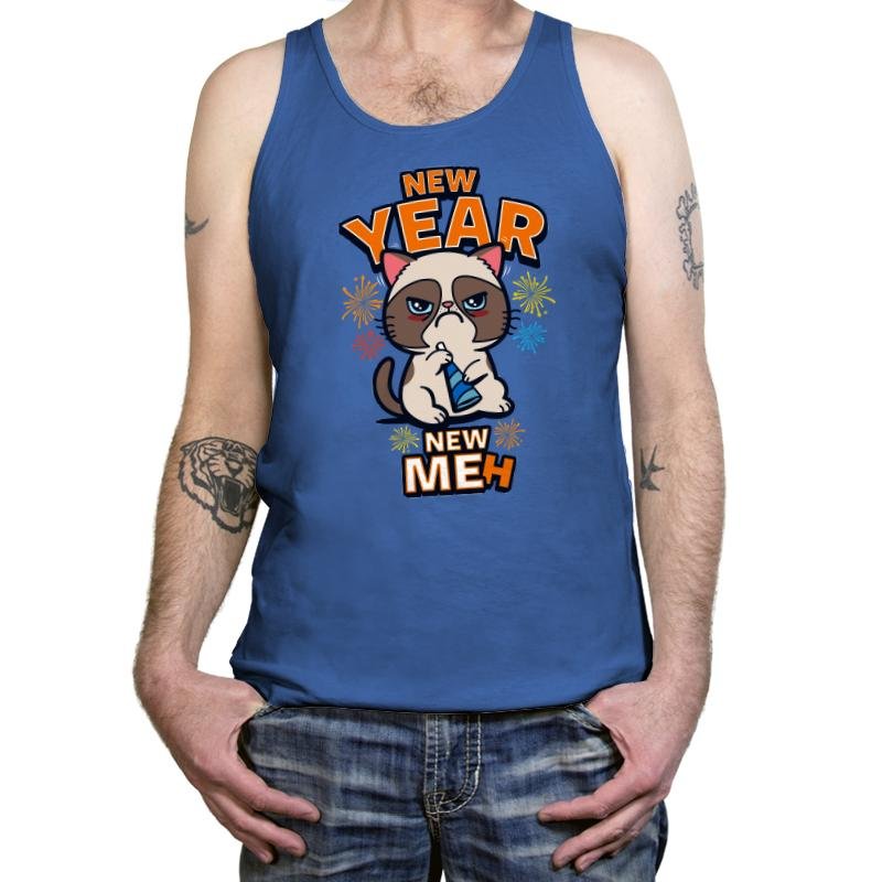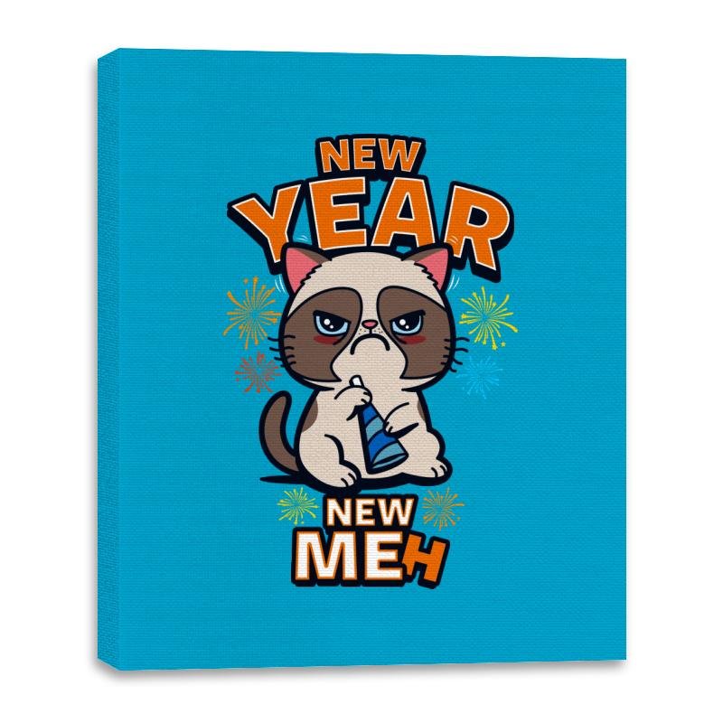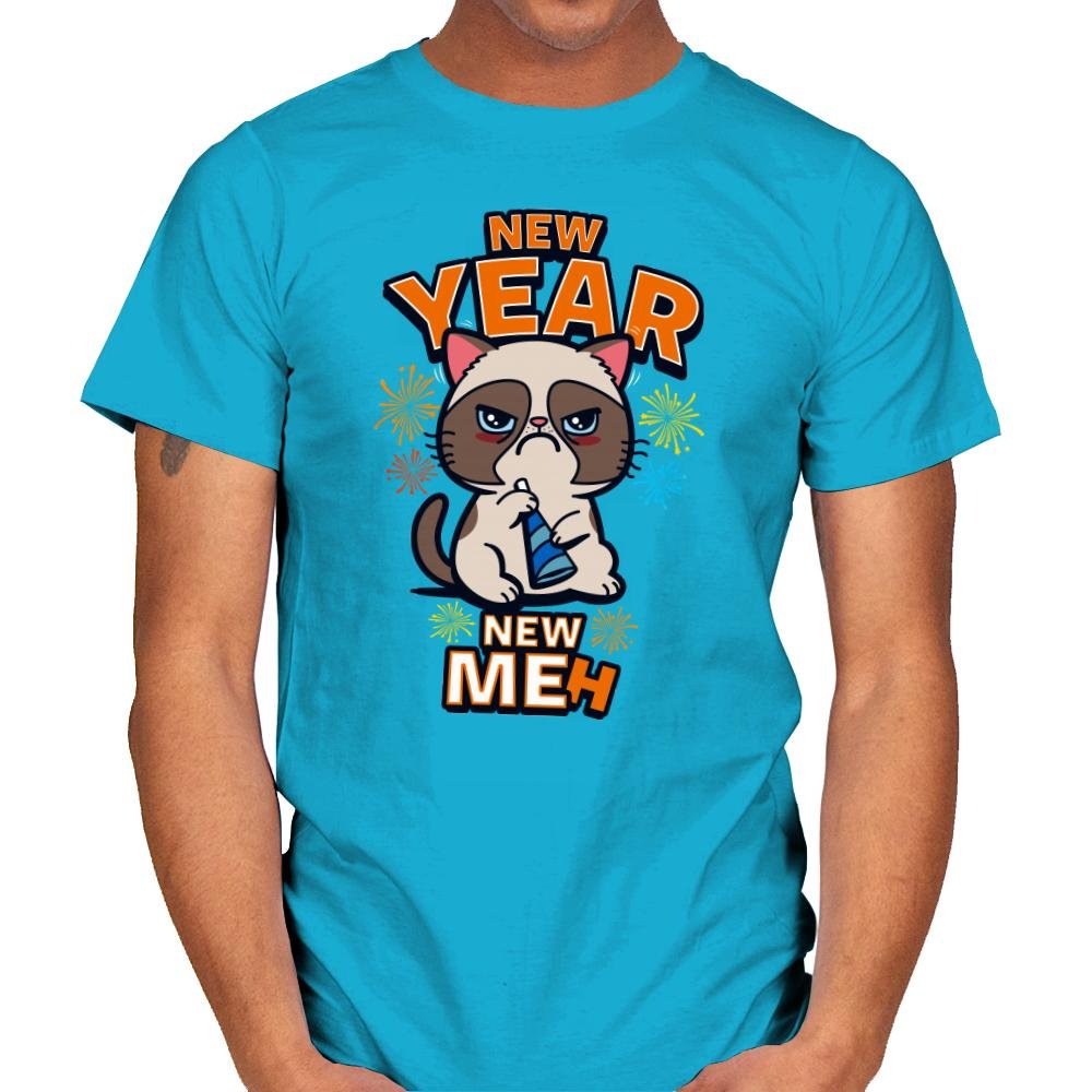 This design celebrates New Year’s optimism through the most unenthused feline imaginable. Confetti colors and tiny fireworks surround a grumpy cat holding a party horn, staring down the viewer with the energy of someone already over the holiday. The bold text frames the mood by flipping the familiar resolution slogan into pure apathy. The joke lands because the cat looks like it truly means it.