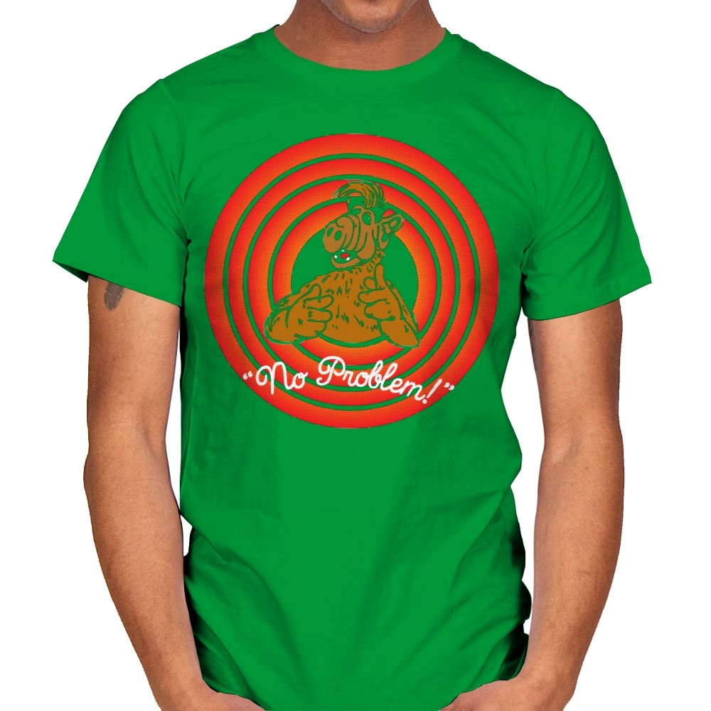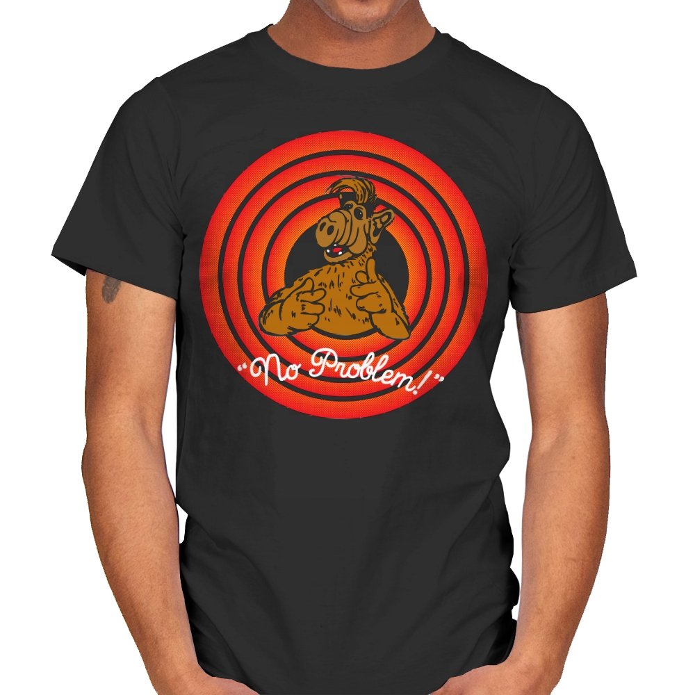 This design leans fully into retro TV energy, right down to the concentric circles and oversized grin. A fuzzy alien figure flashes finger guns from the center, frozen in that moment where the laugh track would usually kick in. The warm reds and browns give it a worn broadcast feel, like something pulled straight from an old cable rerun. It is cheerful, slightly smug, and completely aware of itself.