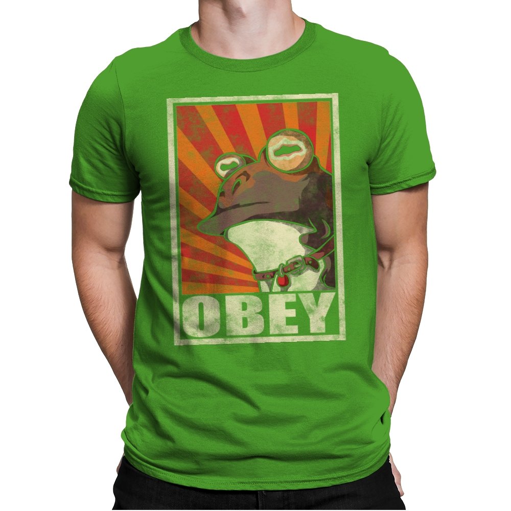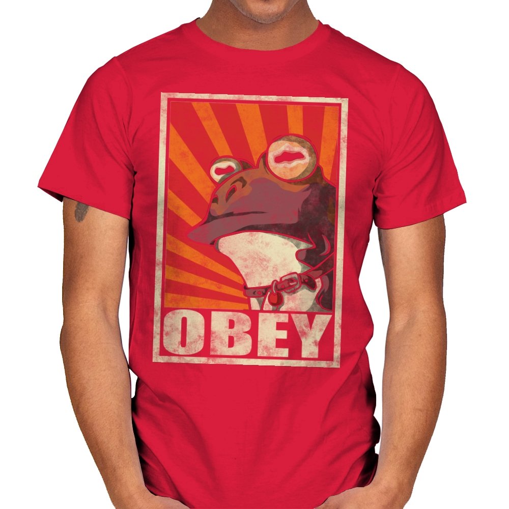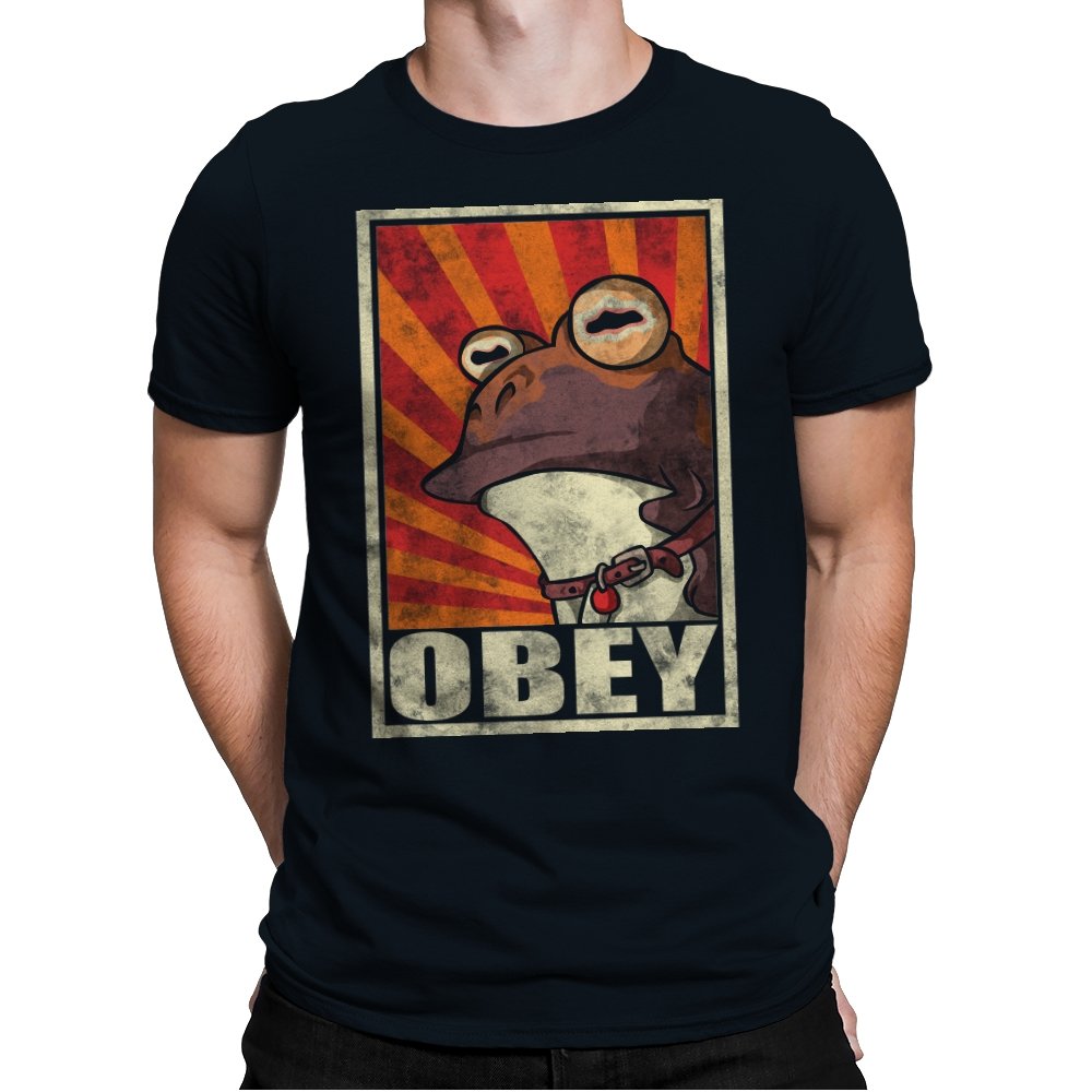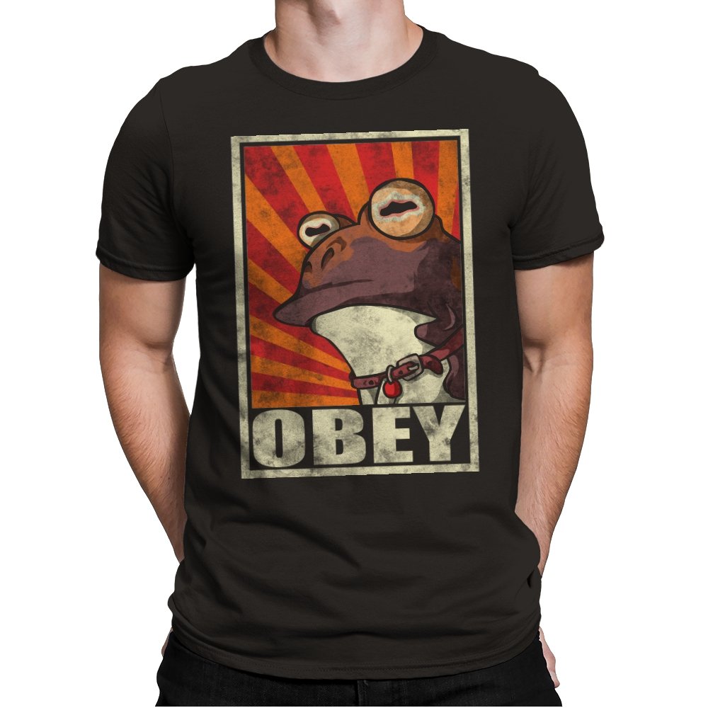 This design pulls classic propaganda poster energy into full parody mode, fronted by a wide-eyed amphibian that fans instantly recognize. The distressed texture, bold rays, and heavy framing give it that unmistakable authoritarian poster look, flipped into something absurd and self-aware. It balances humor and menace in a way that works precisely because it takes itself so seriously. If you know, you know.