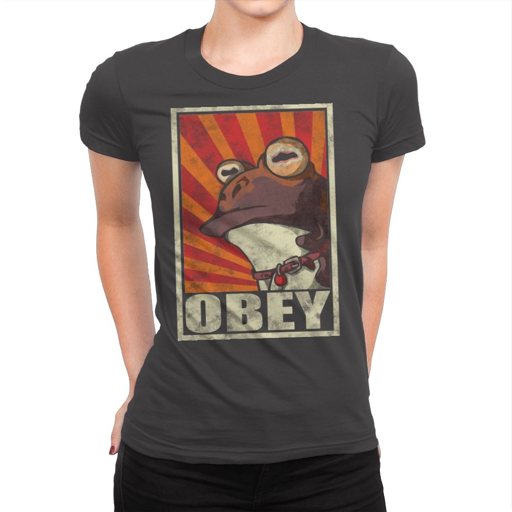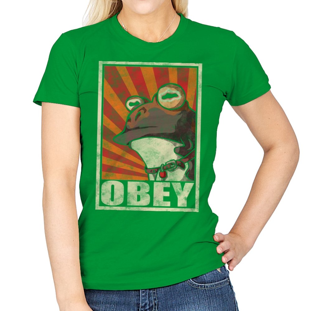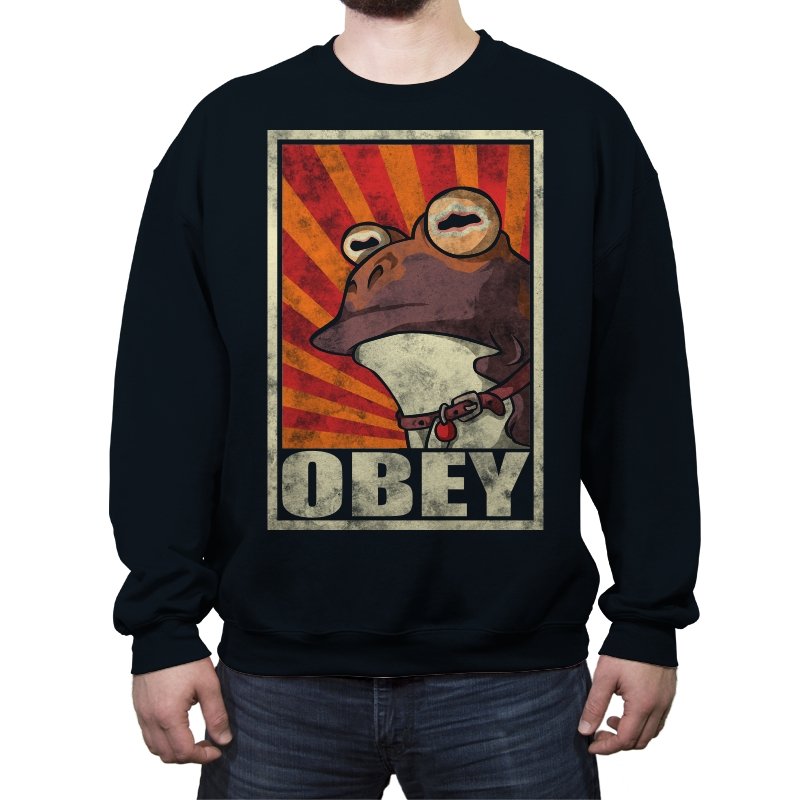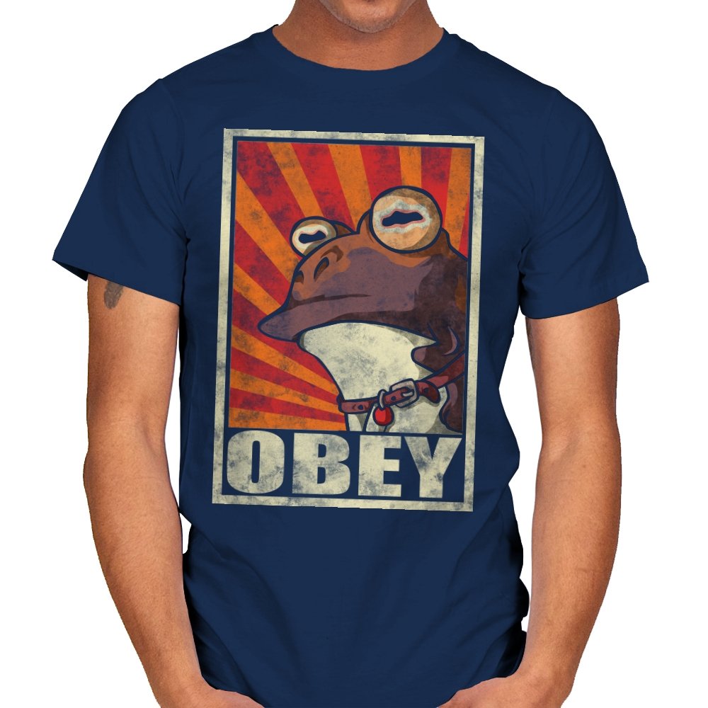 This design pulls classic propaganda poster energy into full parody mode, fronted by a wide-eyed amphibian that fans instantly recognize. The distressed texture, bold rays, and heavy framing give it that unmistakable authoritarian poster look, flipped into something absurd and self-aware. It balances humor and menace in a way that works precisely because it takes itself so seriously. If you know, you know.