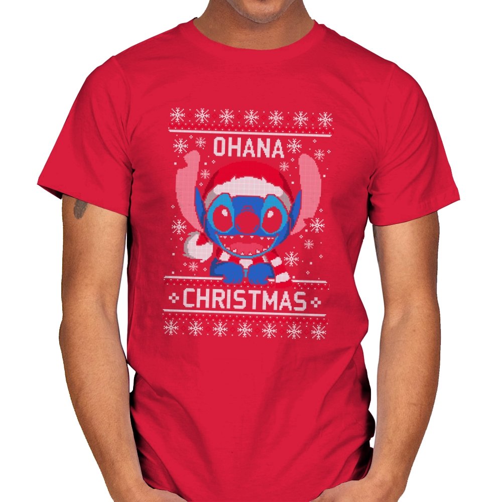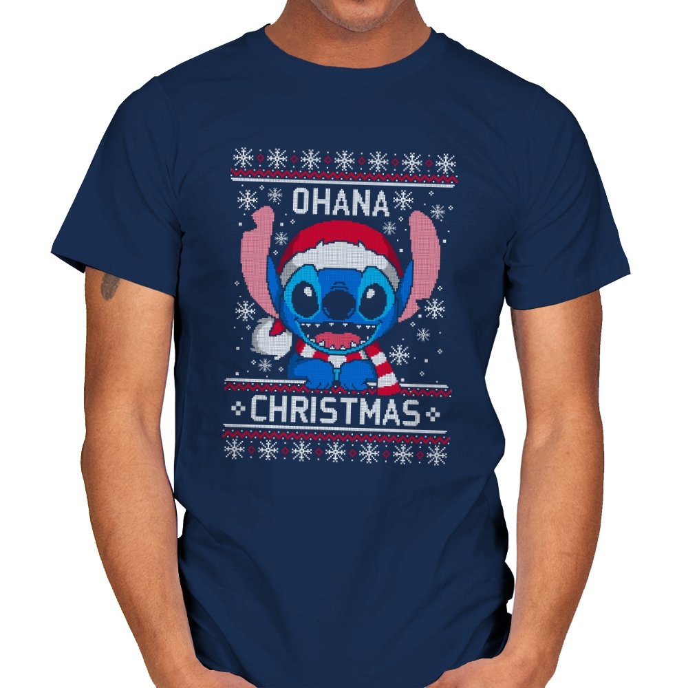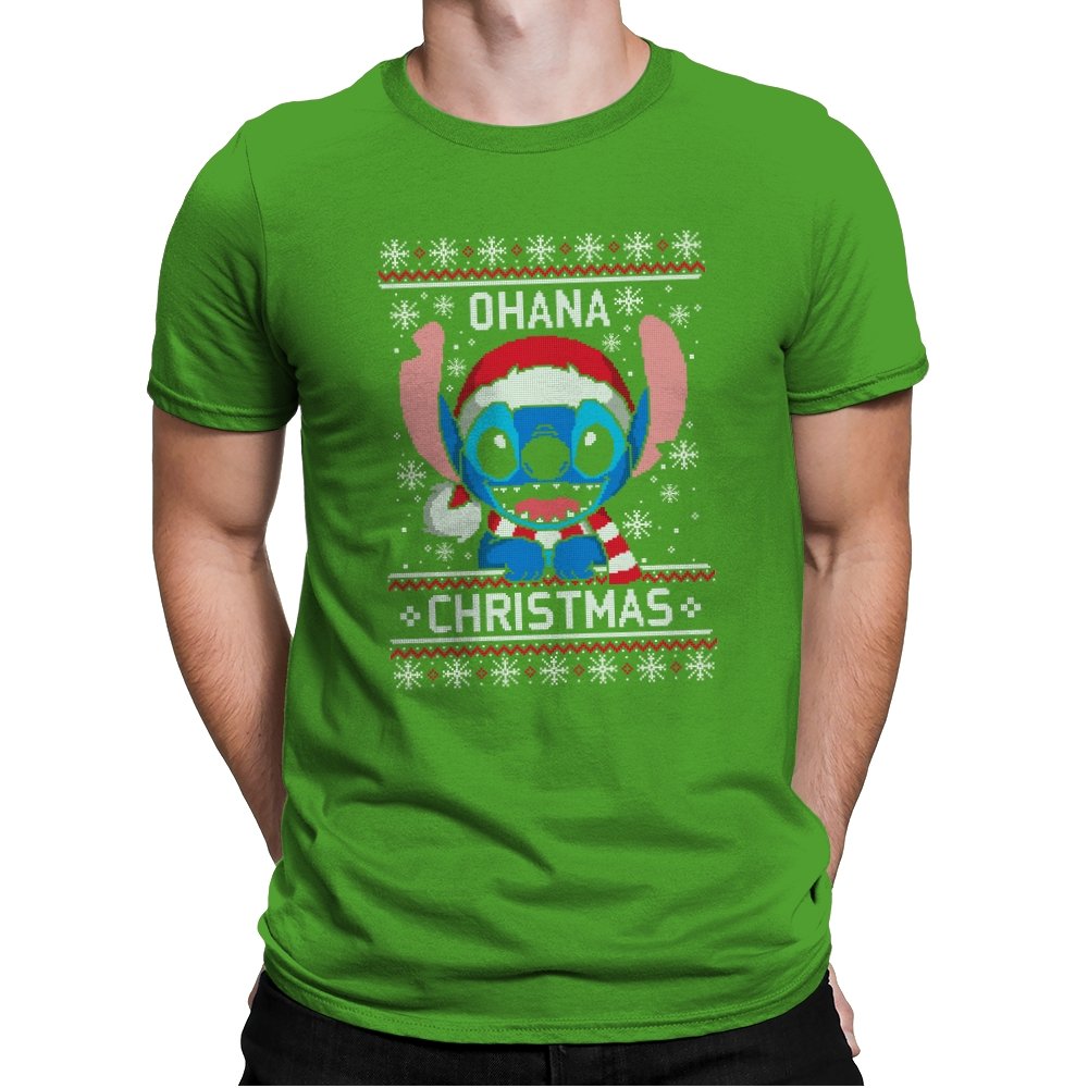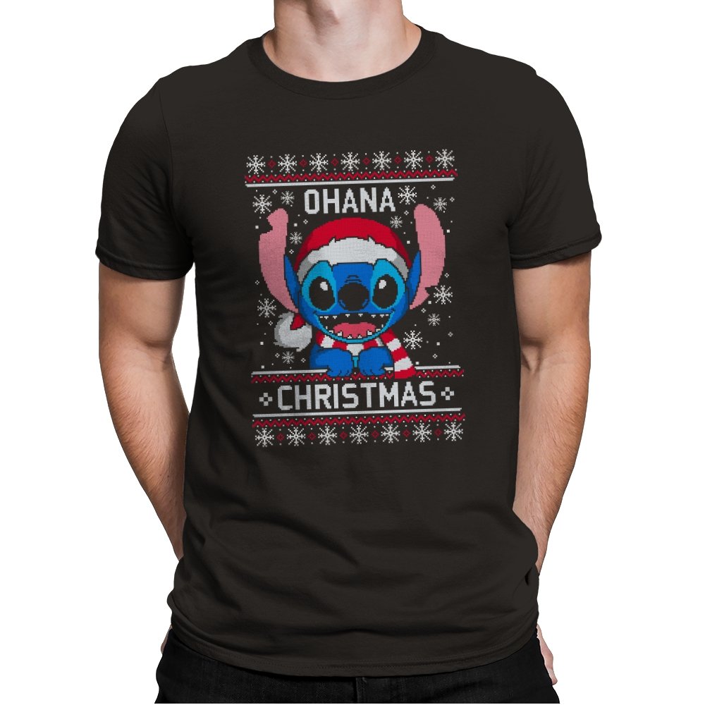 This design transforms a certain blue alien into ugly holiday sweater art. Faux knit stitches give his big ears, sharp teeth, and Santa hat a pixel texture while snowflakes fall around him. The stitched text pairs his signature family motto with Christmas to create a seasonal twist that fans will recognize instantly. The mix of chaos and sweetness fits the character and the holidays at the same time.