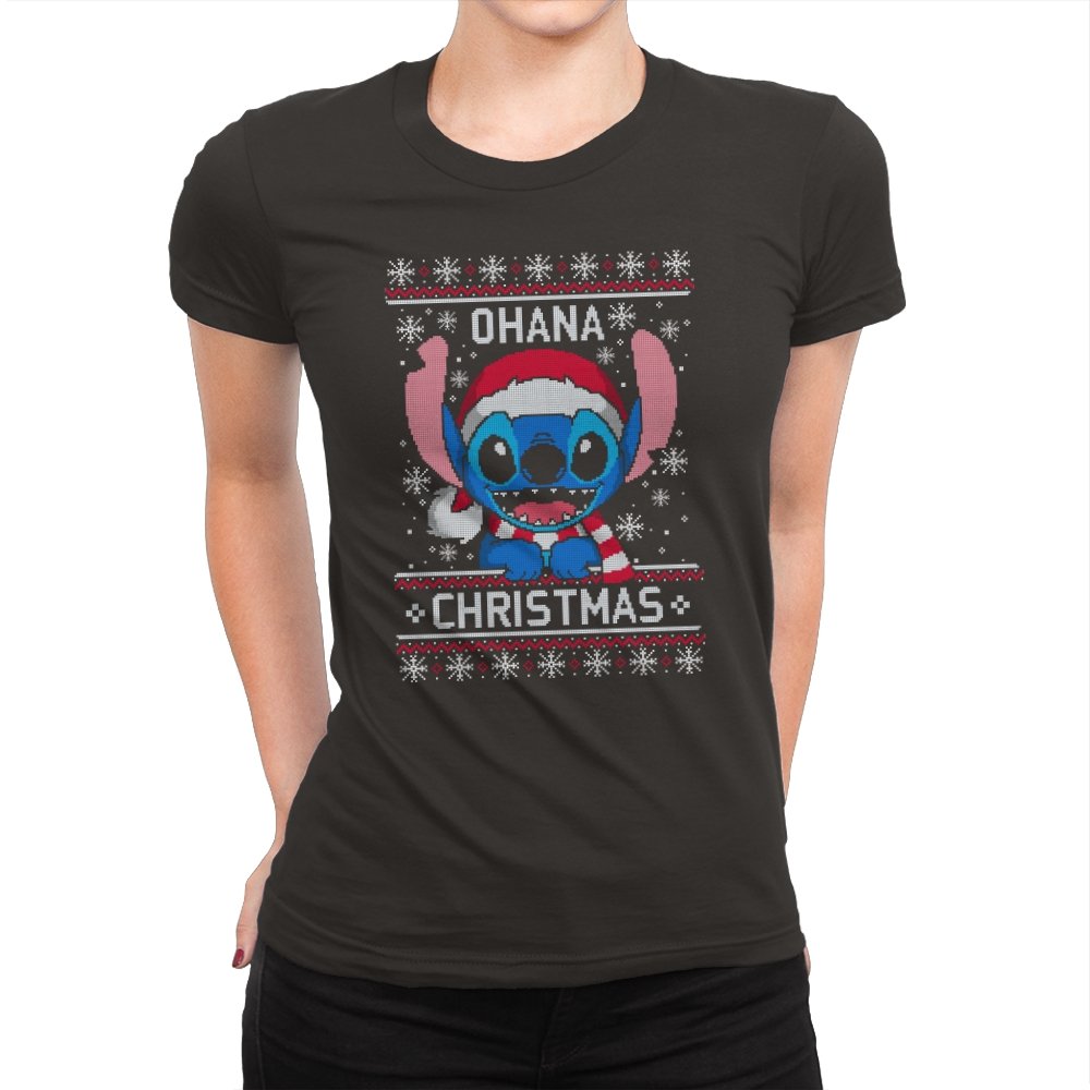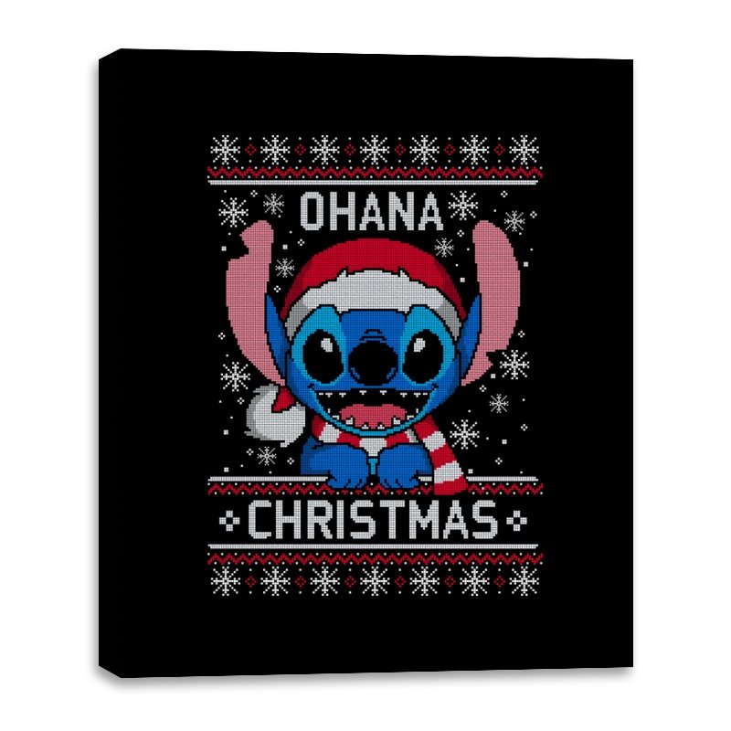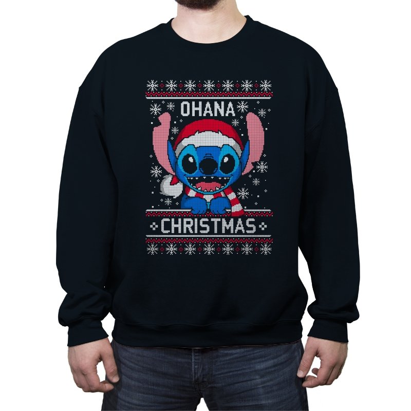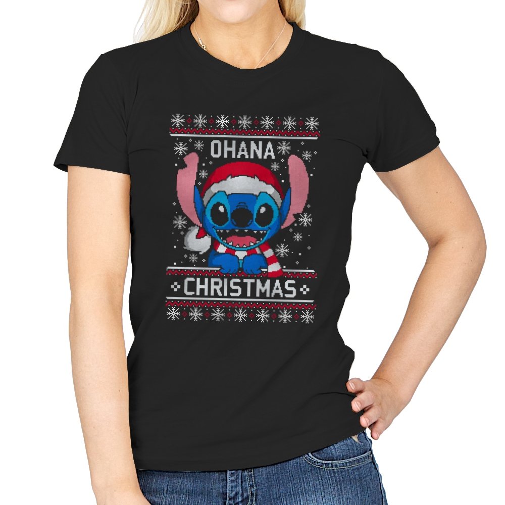 This design transforms a certain blue alien into ugly holiday sweater art. Faux knit stitches give his big ears, sharp teeth, and Santa hat a pixel texture while snowflakes fall around him. The stitched text pairs his signature family motto with Christmas to create a seasonal twist that fans will recognize instantly. The mix of chaos and sweetness fits the character and the holidays at the same time.