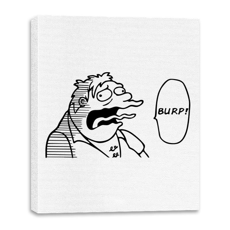 One Burp Man takes the stoic manga hero archetype and swaps out raw power for the most undignified sound a human can make. The stark black and white linework leans into parody, treating a slurry “BURP” as if it were a dramatic battle cry. The character’s rubbery face and blank stare make the joke feel intentional rather than mean spirited, as if both source inspirations are in on it.