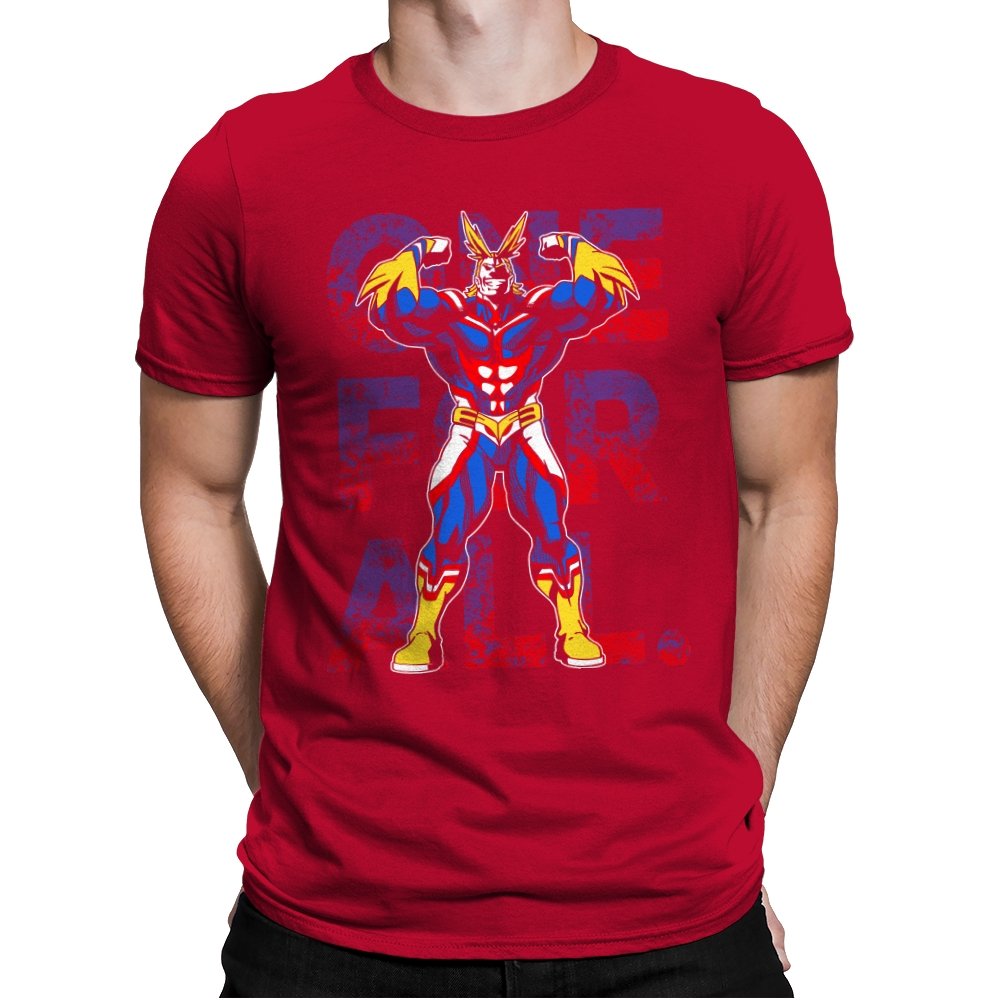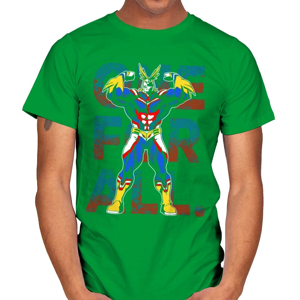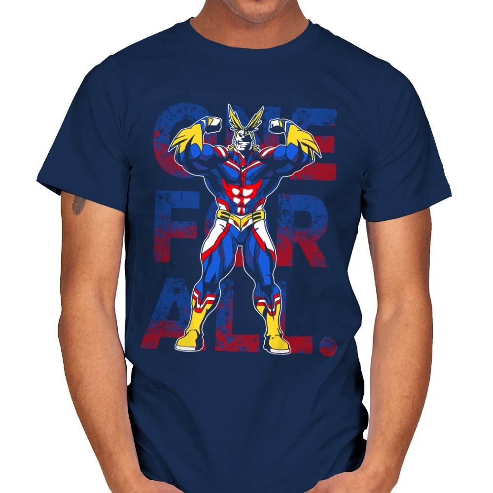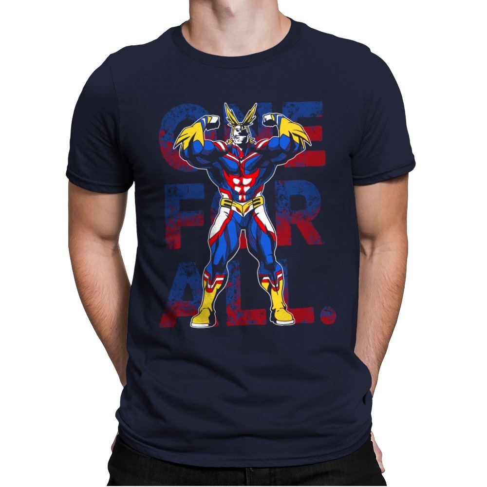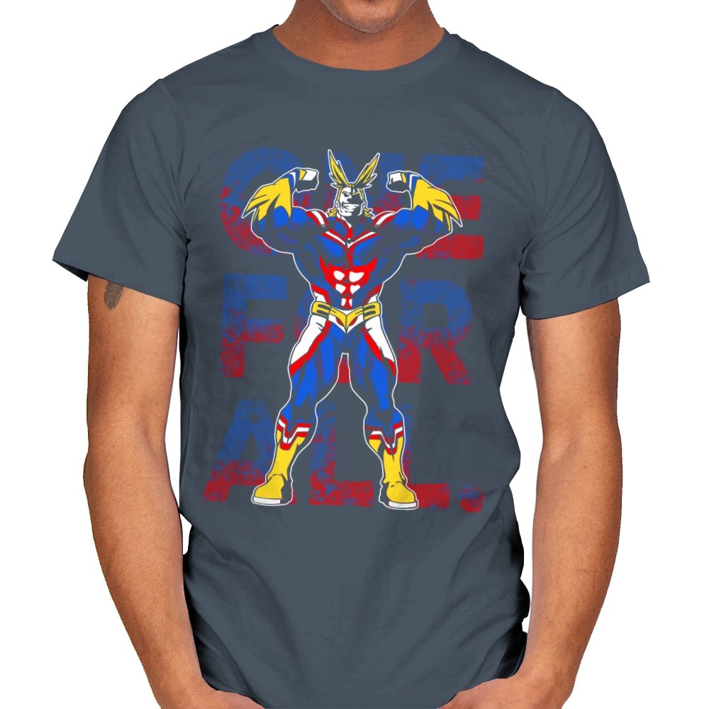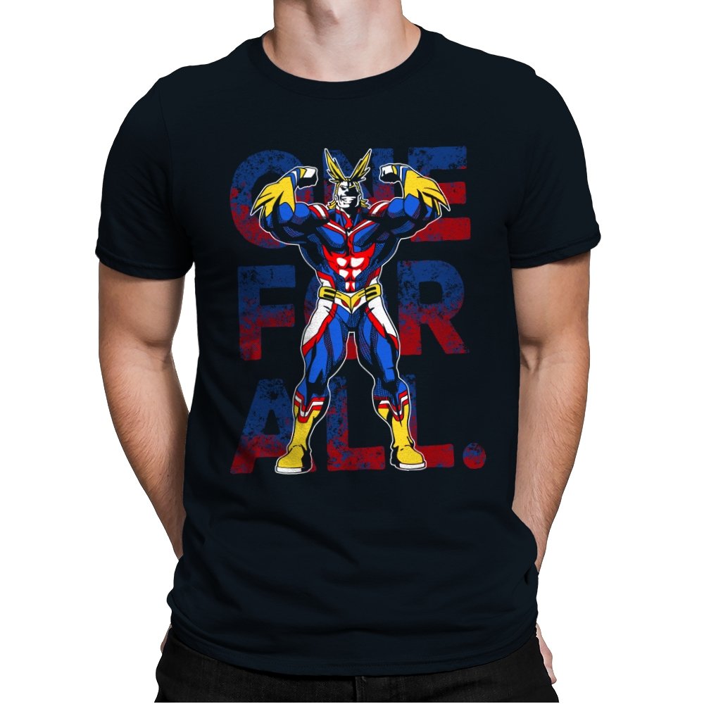 One For All presents the towering symbol of a heroic society as if he just stepped out of a comic panel mid pose. The design captures a massive figure in red, blue, and gold, flexing with theatrical confidence while a distressed slogan sits behind him in blocky letters. The style leans into exaggerated muscles, bright contrast, and that old fashioned sense of showmanship associated with classic hero cartoons. Fans need no names spoken to recognize the lineage.