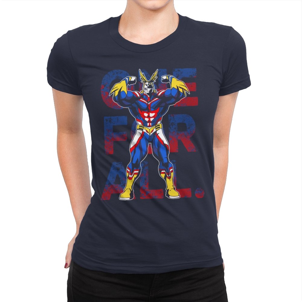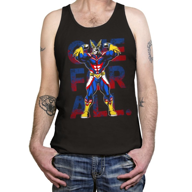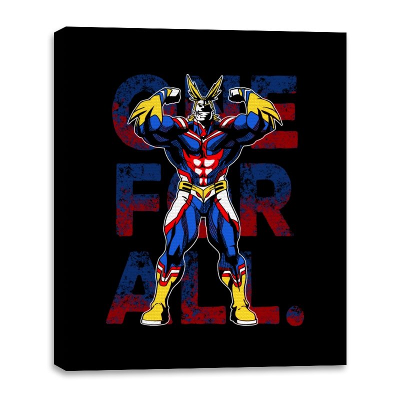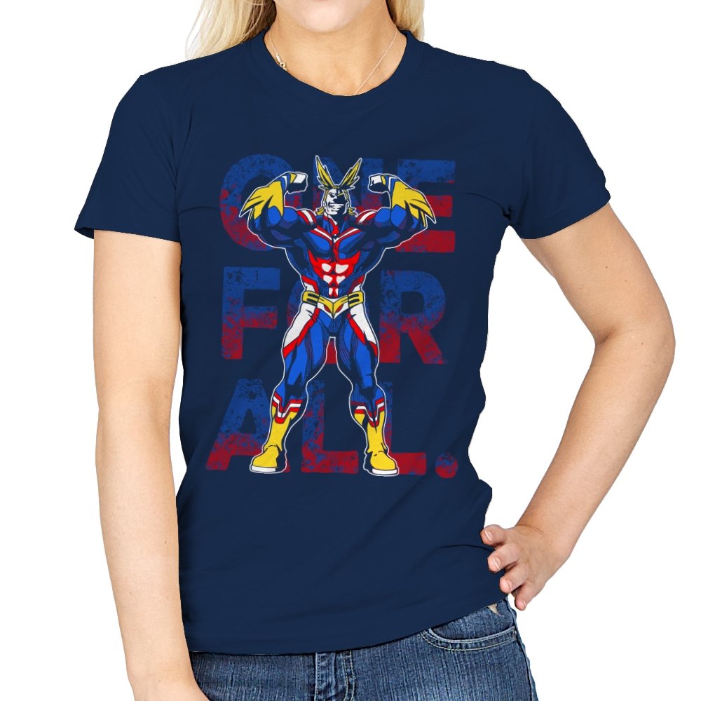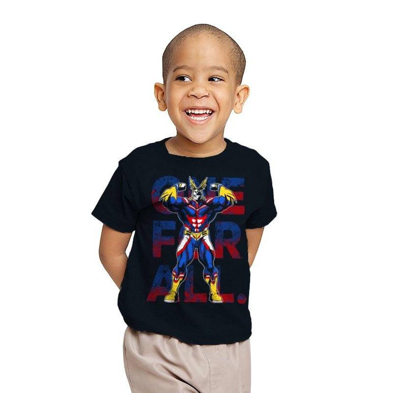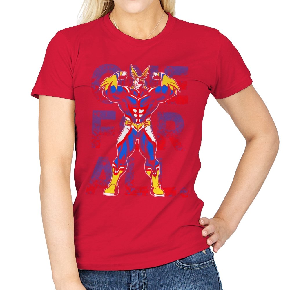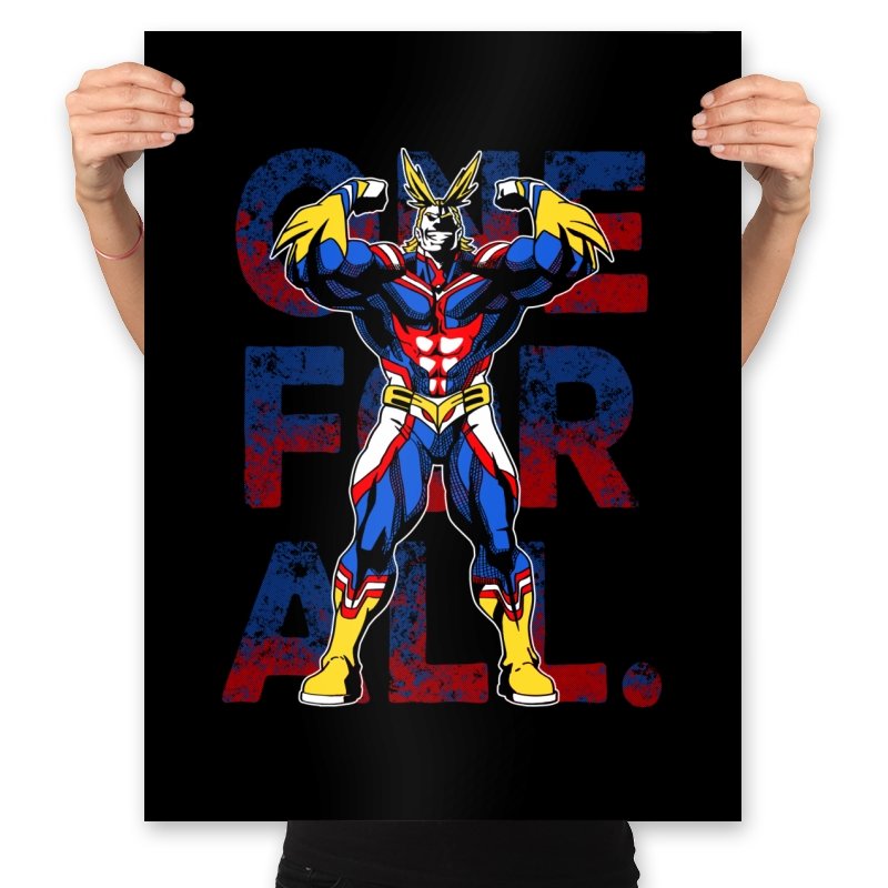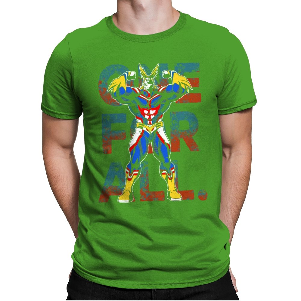 One For All presents the towering symbol of a heroic society as if he just stepped out of a comic panel mid pose. The design captures a massive figure in red, blue, and gold, flexing with theatrical confidence while a distressed slogan sits behind him in blocky letters. The style leans into exaggerated muscles, bright contrast, and that old fashioned sense of showmanship associated with classic hero cartoons. Fans need no names spoken to recognize the lineage.
