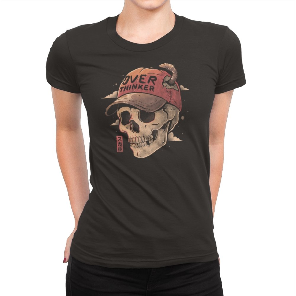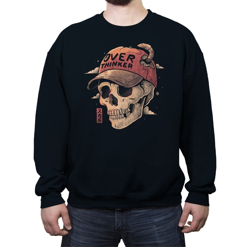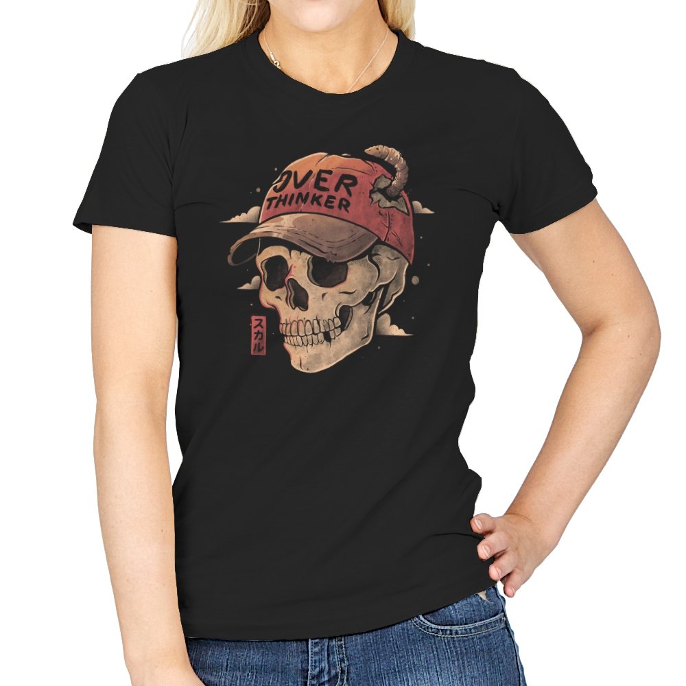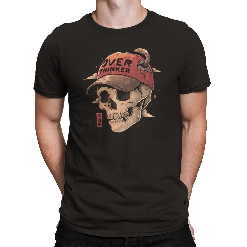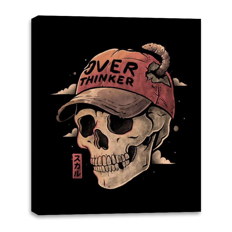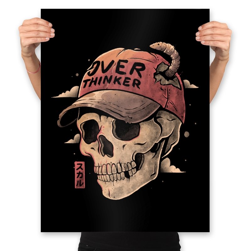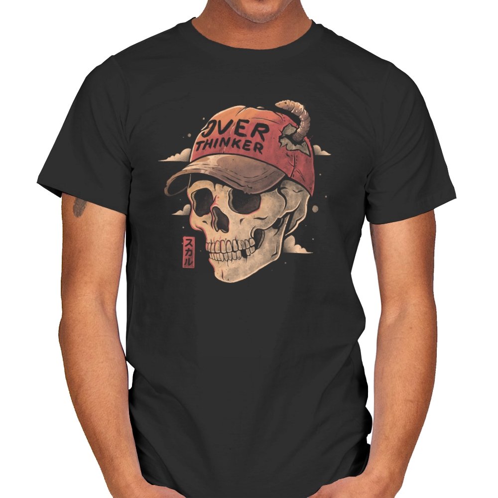 This design centers on a grinning skull wearing a worn cap stamped with a single word that explains everything. A small worm peeks out, turning the image from morbid to self-aware, like a visual punchline about living too much in your own head. The muted tones and distressed style make it feel reflective rather than aggressive. It reads as dark humor for people who recognize the habit instantly.
