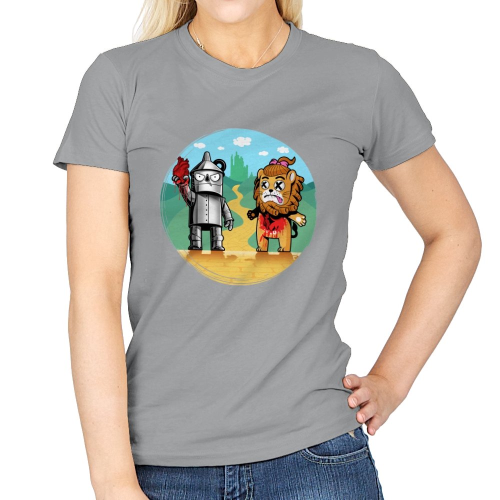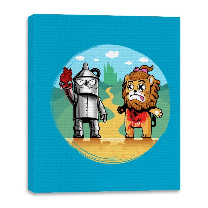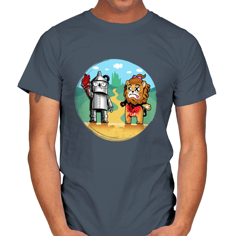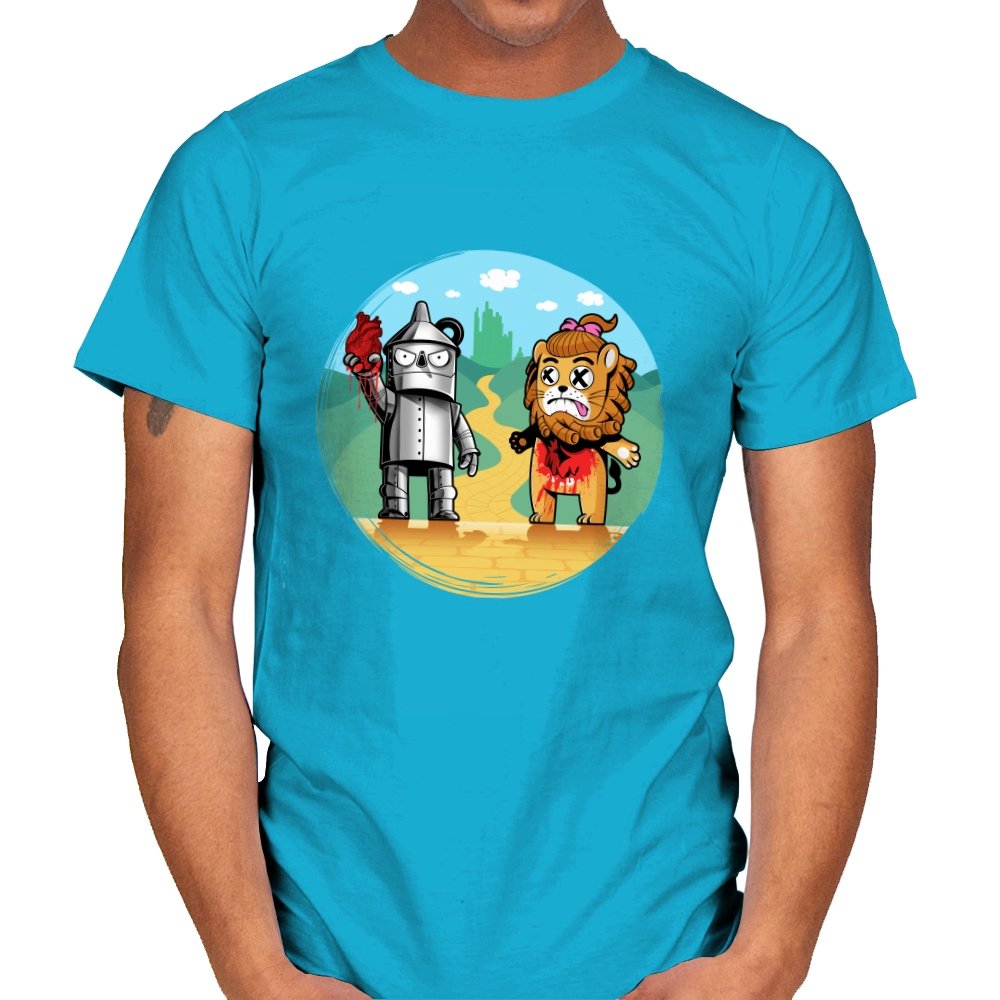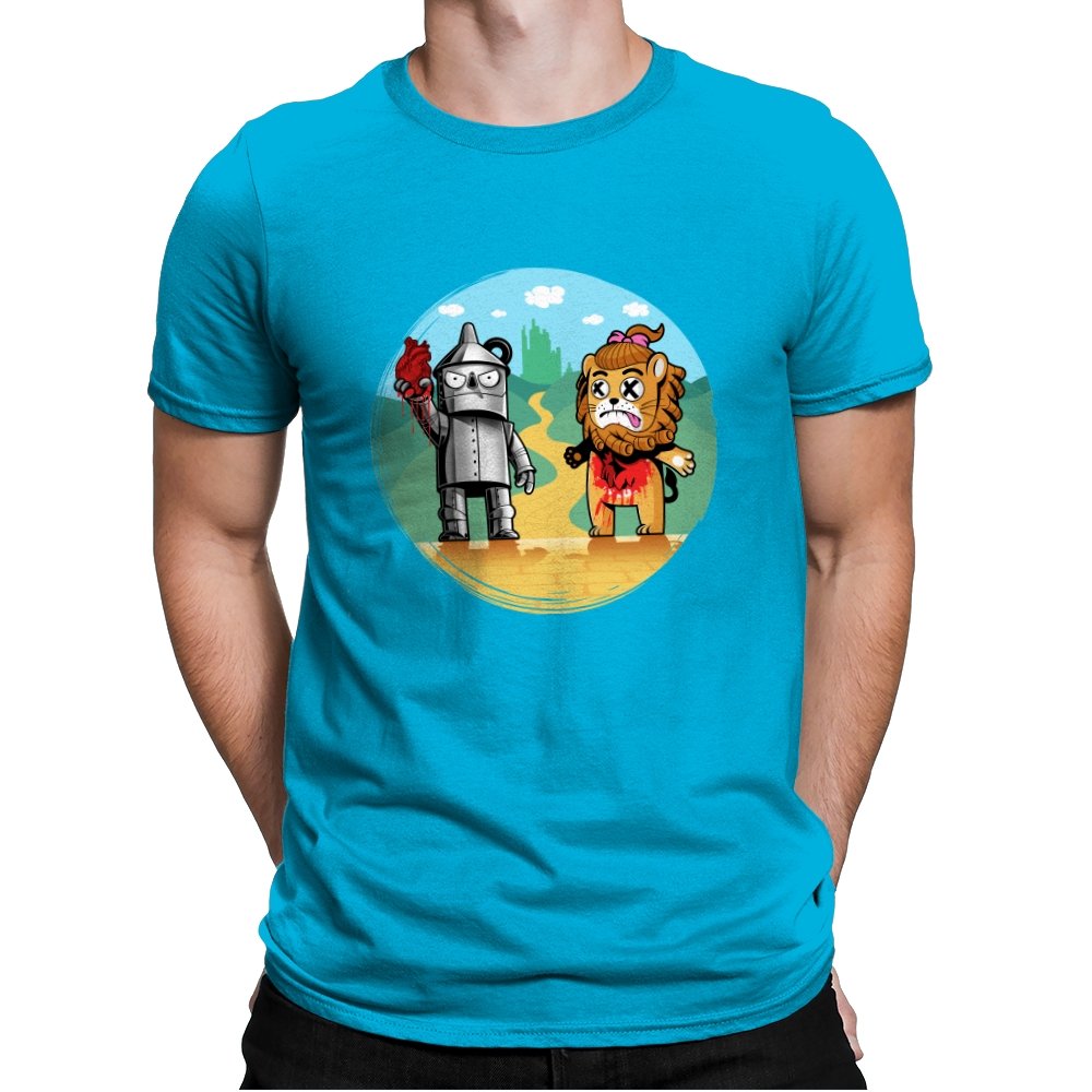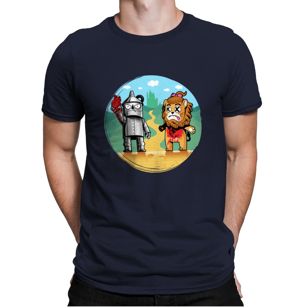 This design reimagines a familiar yellow road with a darker sense of consequence. A metal figure stands holding a literal heart, while a battered lion shows the cost of courage, both framed against an idealized green city in the distance. The colors are playful, but the details tell a stranger story about what happens after the journey is over. Fans who know the tale will catch the twist immediately.