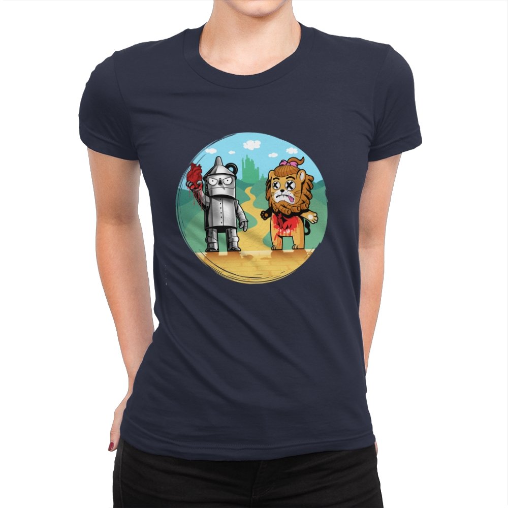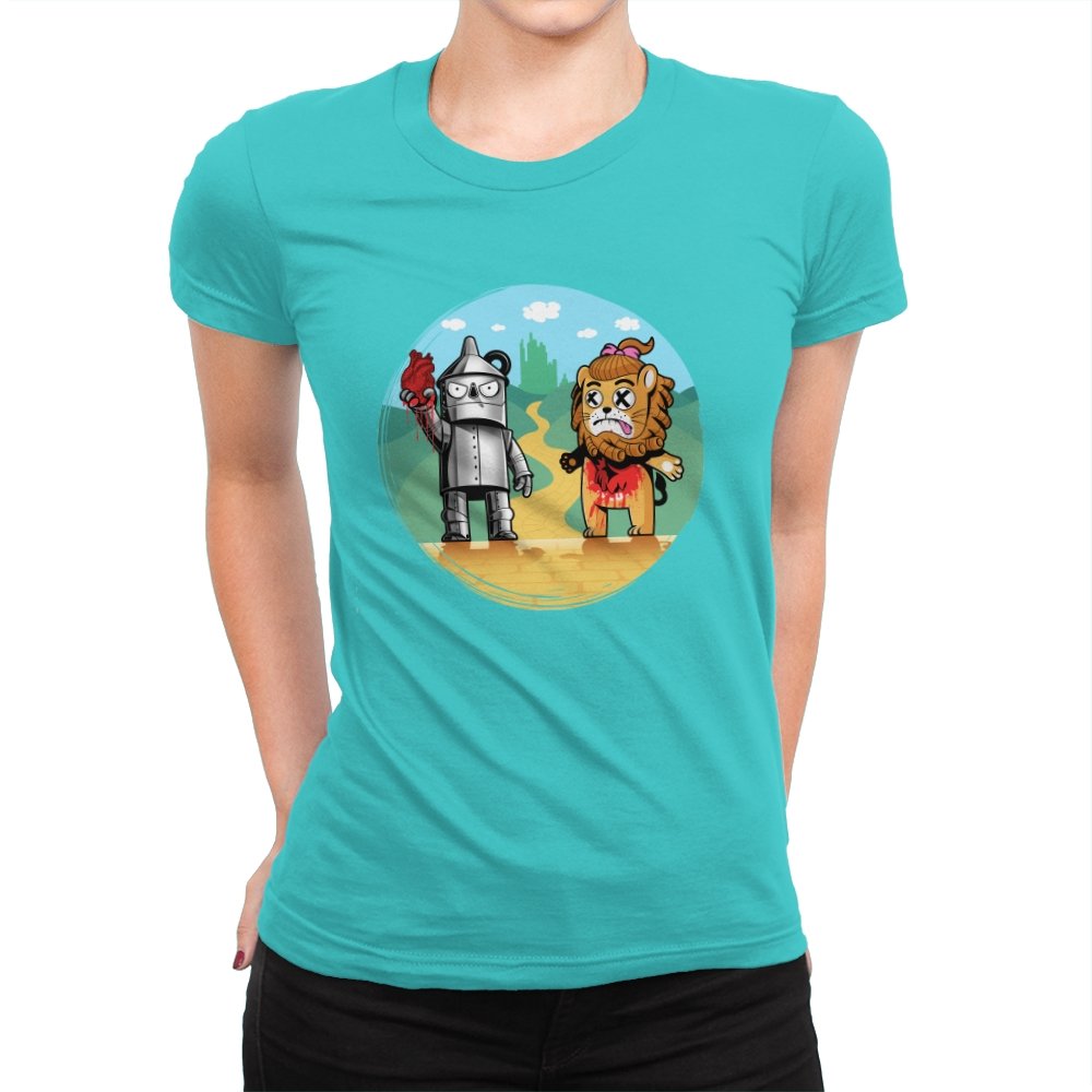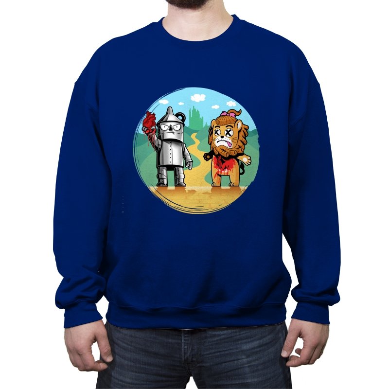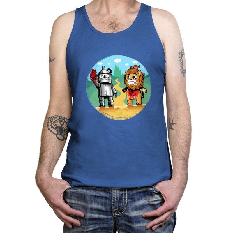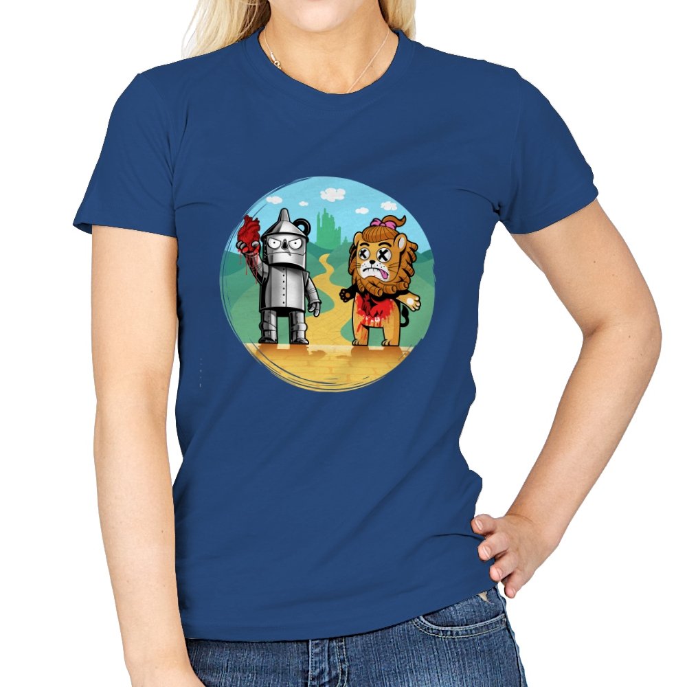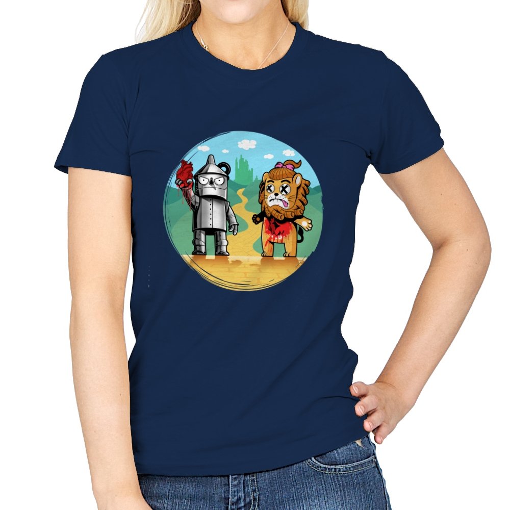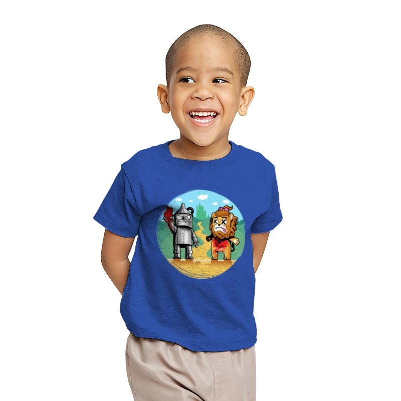 This design reimagines a familiar yellow road with a darker sense of consequence. A metal figure stands holding a literal heart, while a battered lion shows the cost of courage, both framed against an idealized green city in the distance. The colors are playful, but the details tell a stranger story about what happens after the journey is over. Fans who know the tale will catch the twist immediately.