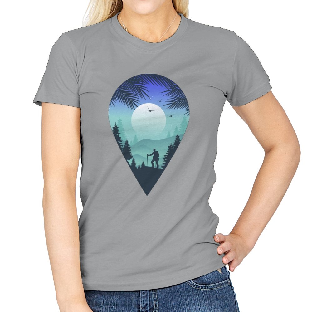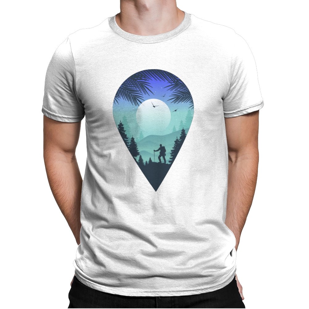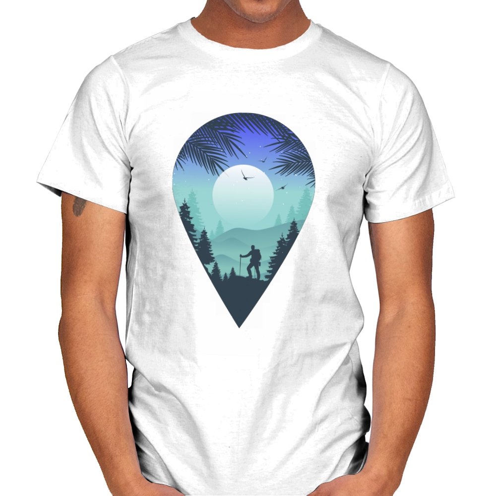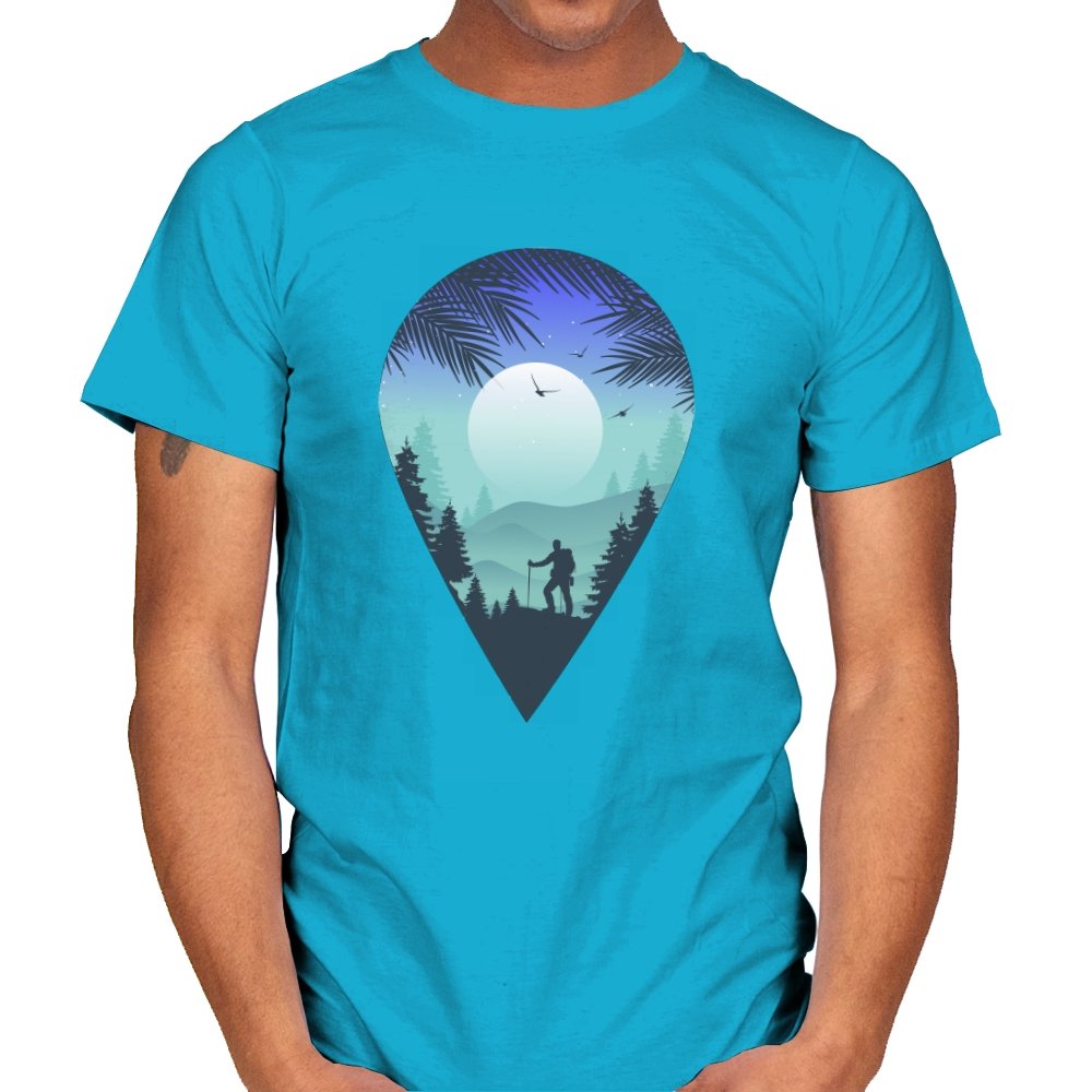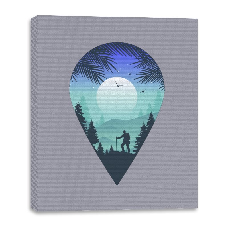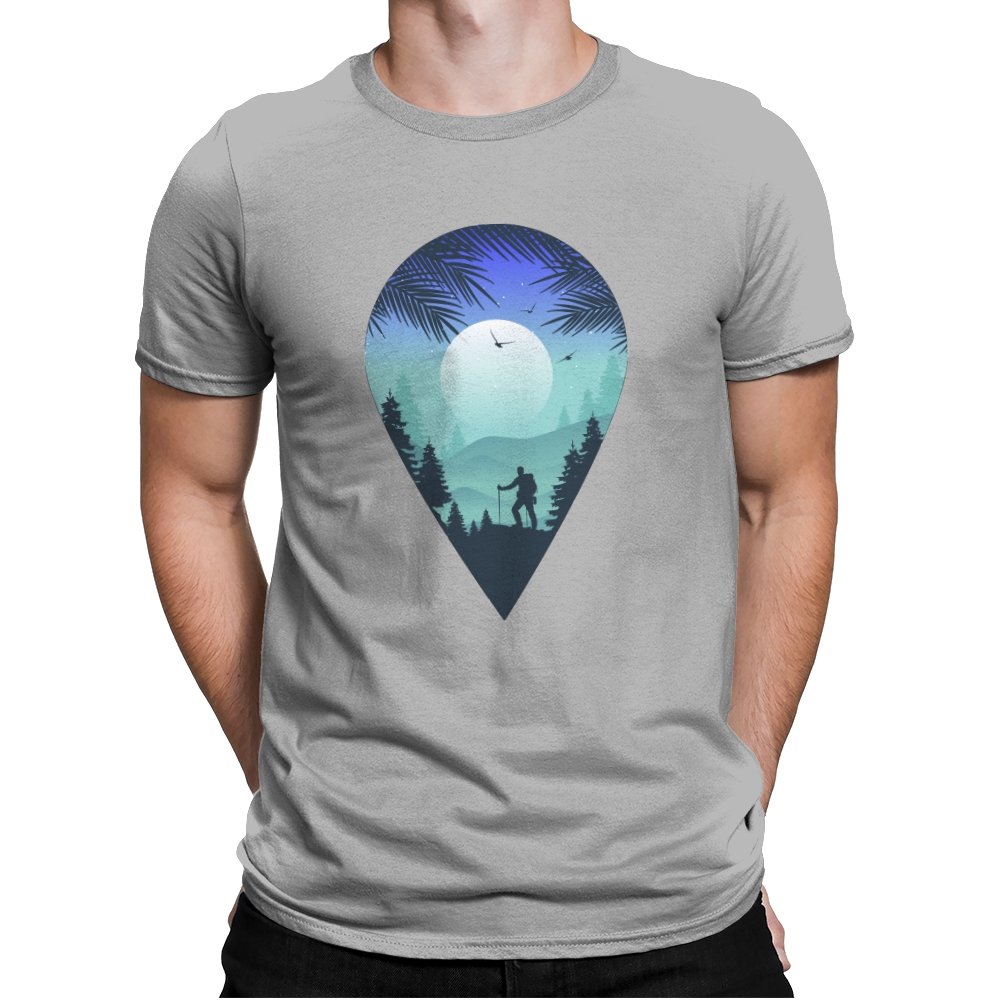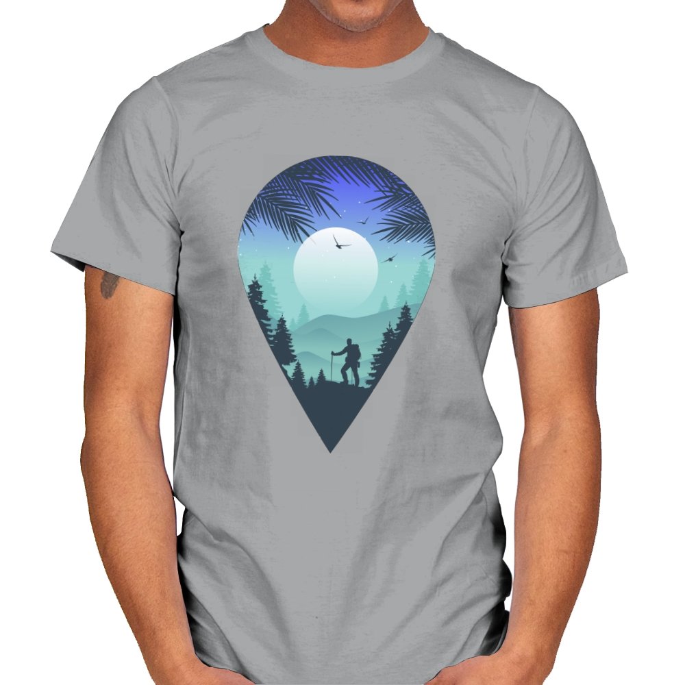 The design uses a familiar map pin shape to frame a quiet wilderness scene. Inside the marker, layered silhouettes of trees, hills, and a lone hiker lead the eye toward a glowing moon and distant birds in flight. The color gradient shifts from deep forest tones to open sky, suggesting movement from ground to horizon. If you read maps as stories, the reference is immediate.