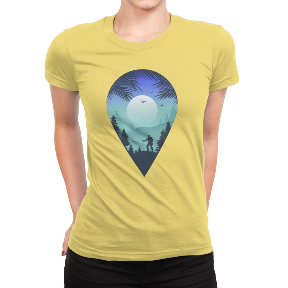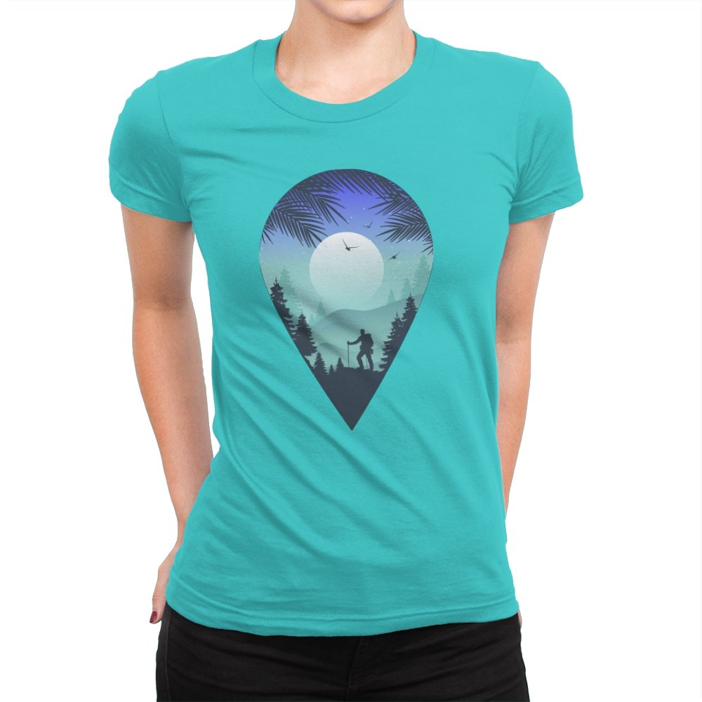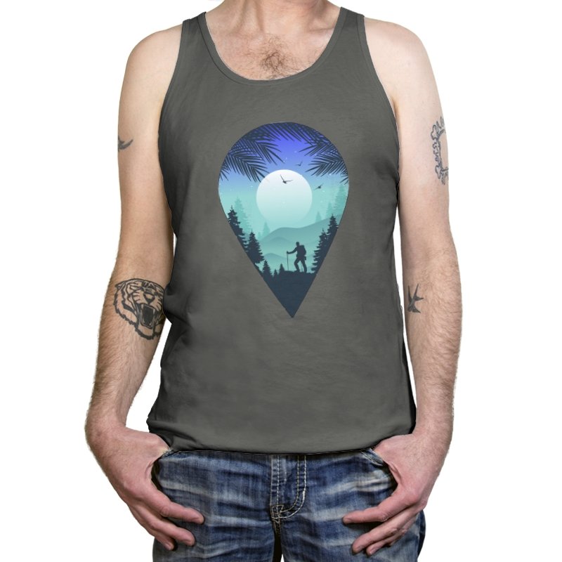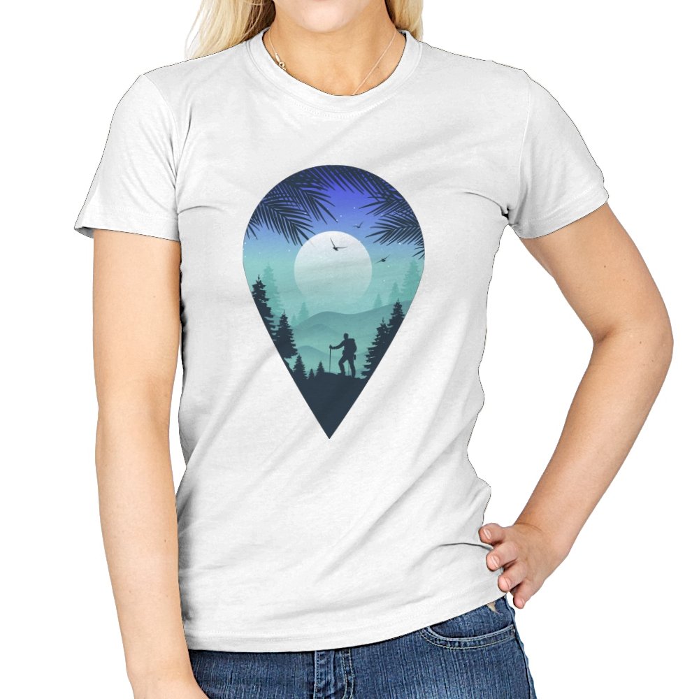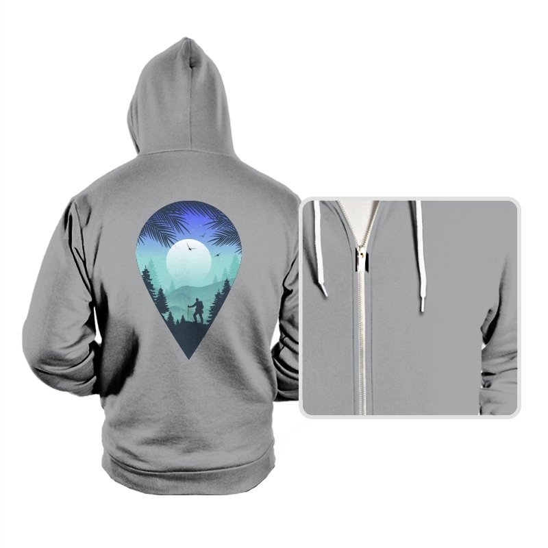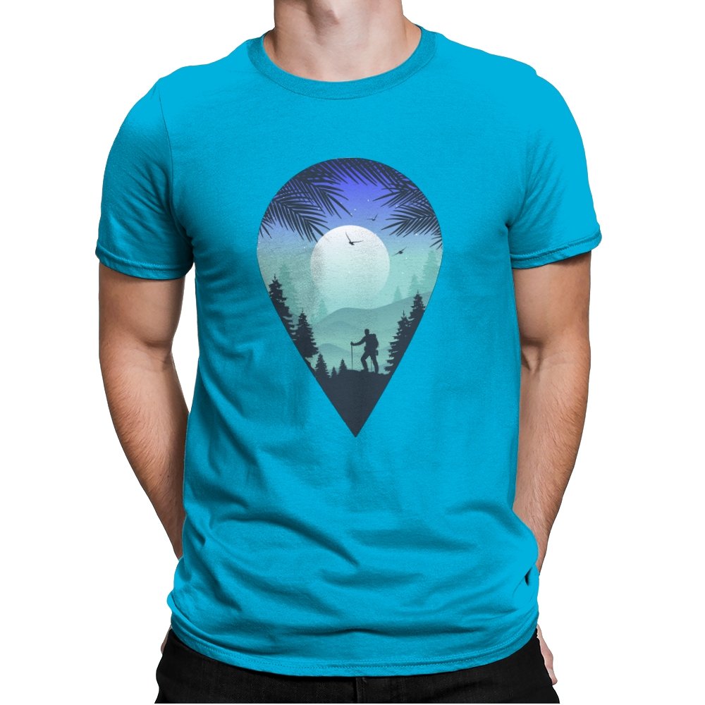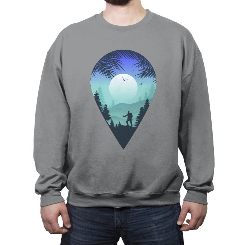The design uses a familiar map pin shape to frame a quiet wilderness scene. Inside the marker, layered silhouettes of trees, hills, and a lone hiker lead the eye toward a glowing moon and distant birds in flight. The color gradient shifts from deep forest tones to open sky, suggesting movement from ground to horizon. If you read maps as stories, the reference is immediate.